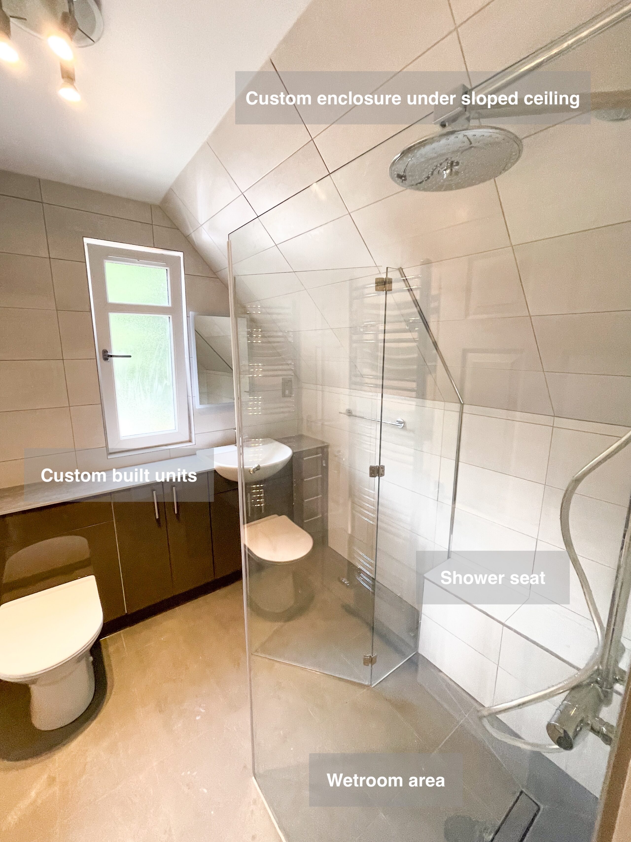 Wetroom featuring bespoke built-in units, a custom glass enclosure seamlessly designed to fit beneath a sloped ceiling, luxurious underfloor heating, elegant tiling throughout, and a convenient shower seat for added comfort. https://www.youtube.com/watch?v=2WxqvW-0znQ