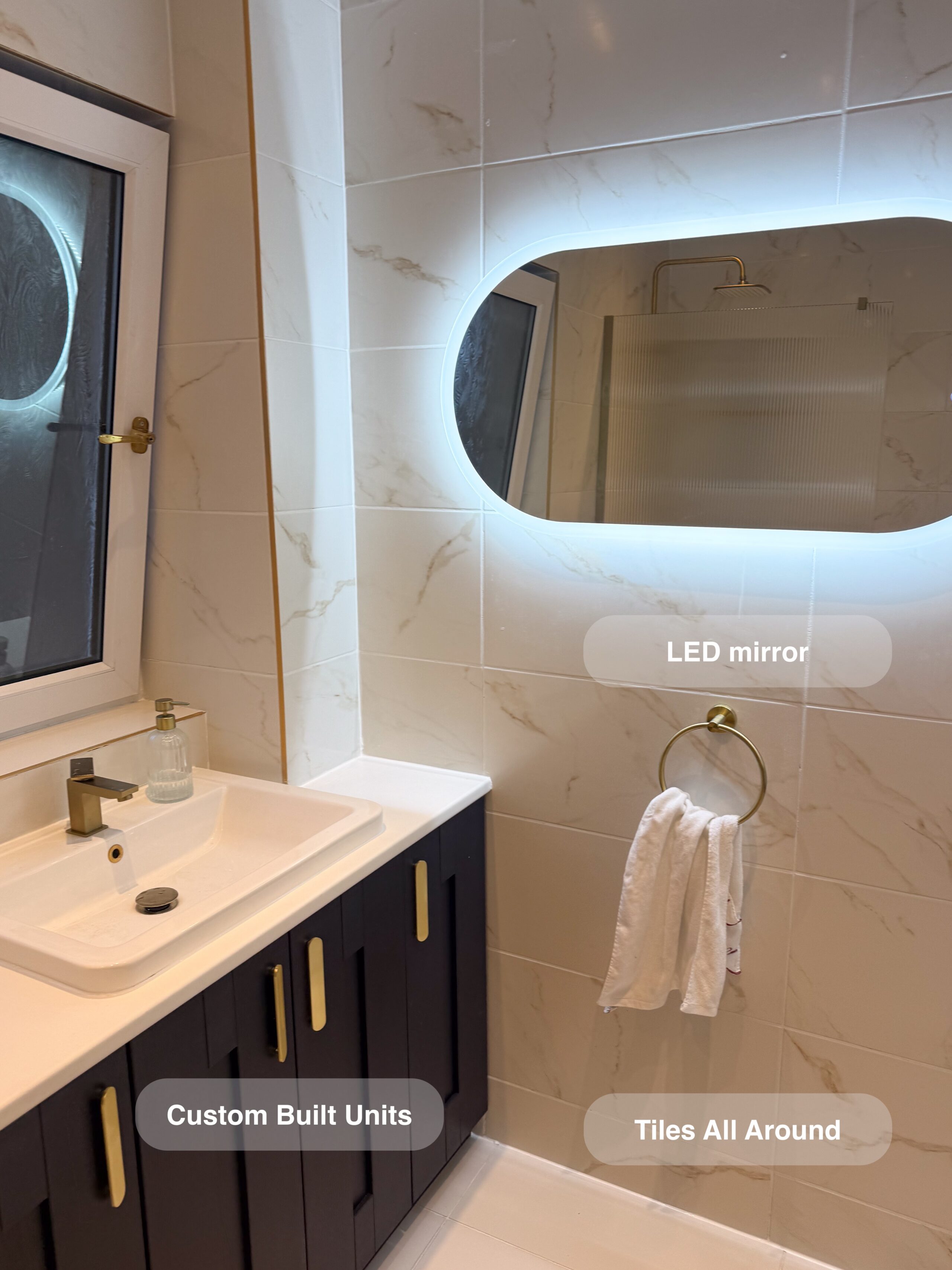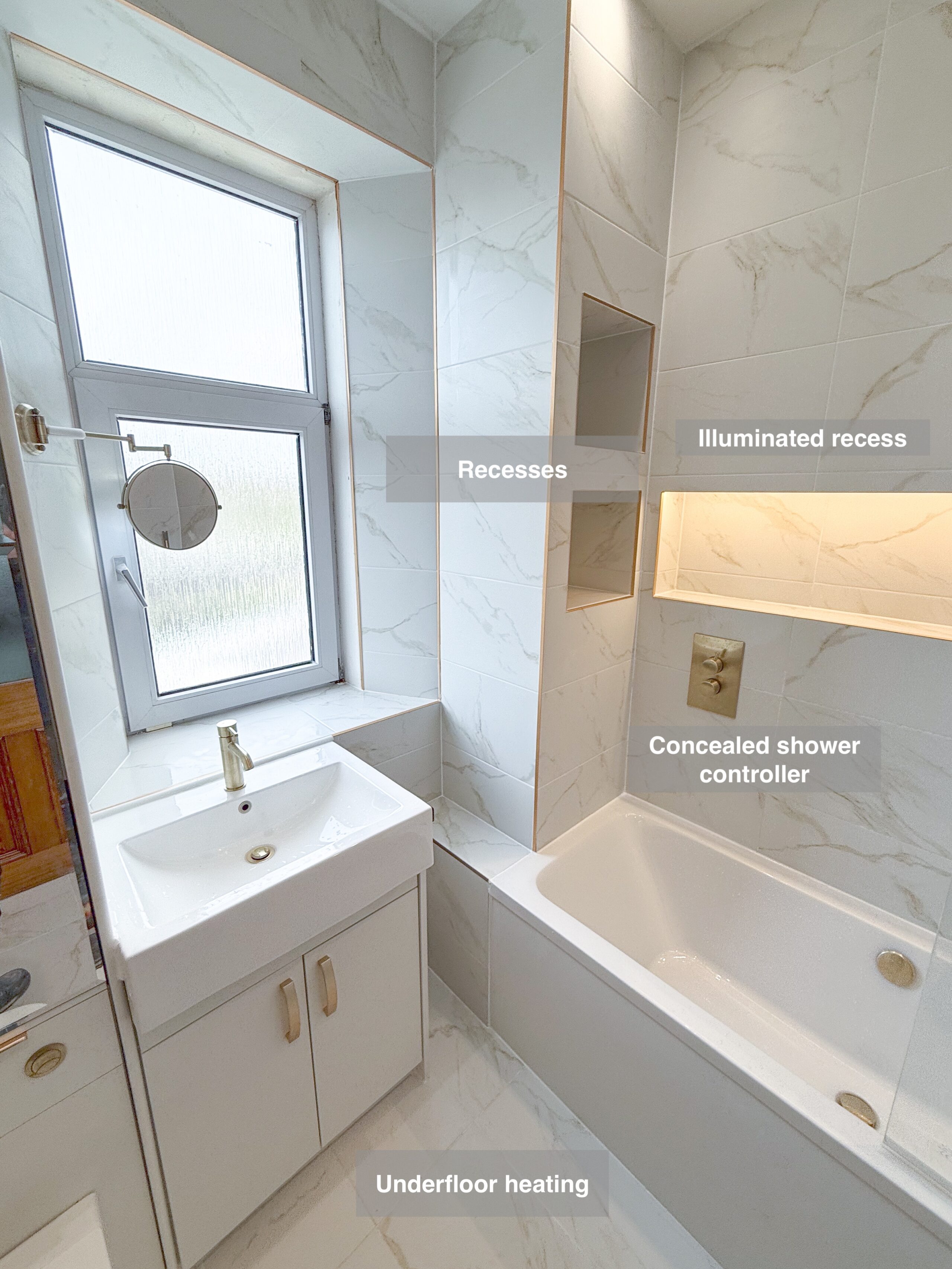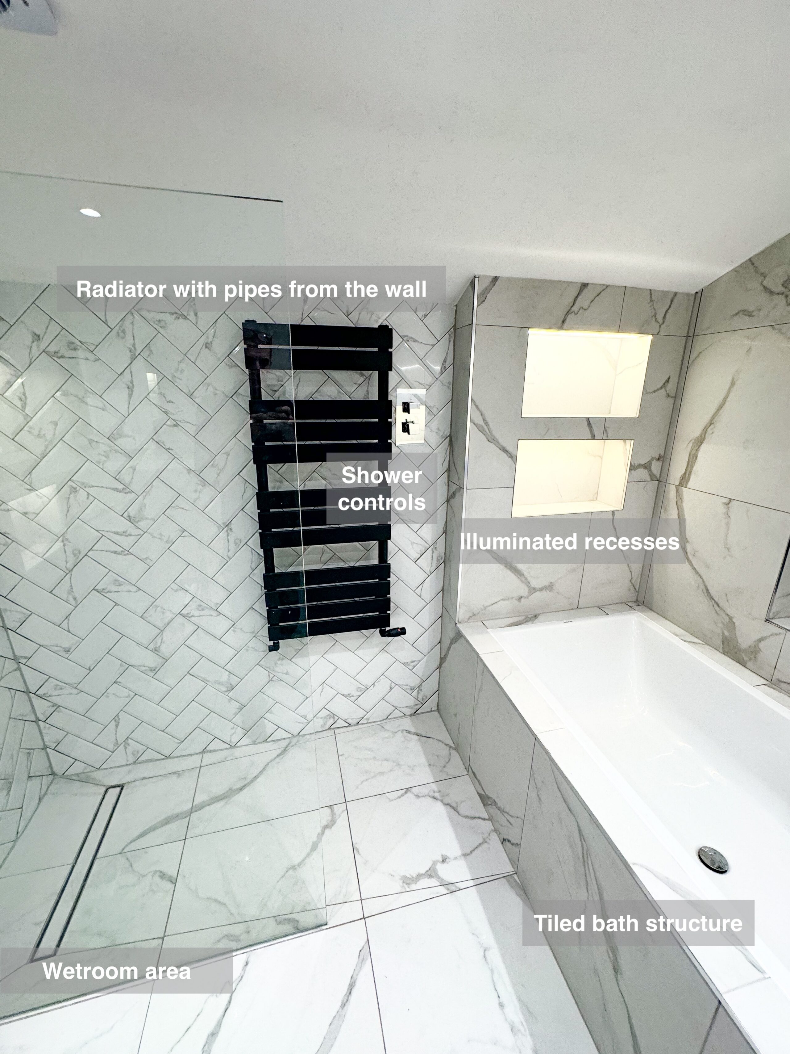 This project features full tiling throughout the room, with matching floor and wall tiles for a cohesive design. The bathtub area includes a large illuminated recess, along with two additional recesses at one end for convenient storage. The towel radiator is neatly placed in its own recess, with another illuminated recess above it for added functionality. The toilet unit is topped with two mirrored cabinets, providing extra storage space. Since there wasn’t enough room to fit a mirror above the sink, a shaving mirror was installed on the side of the window for practicality. Brushed brass accessories, trims, and fittings…
