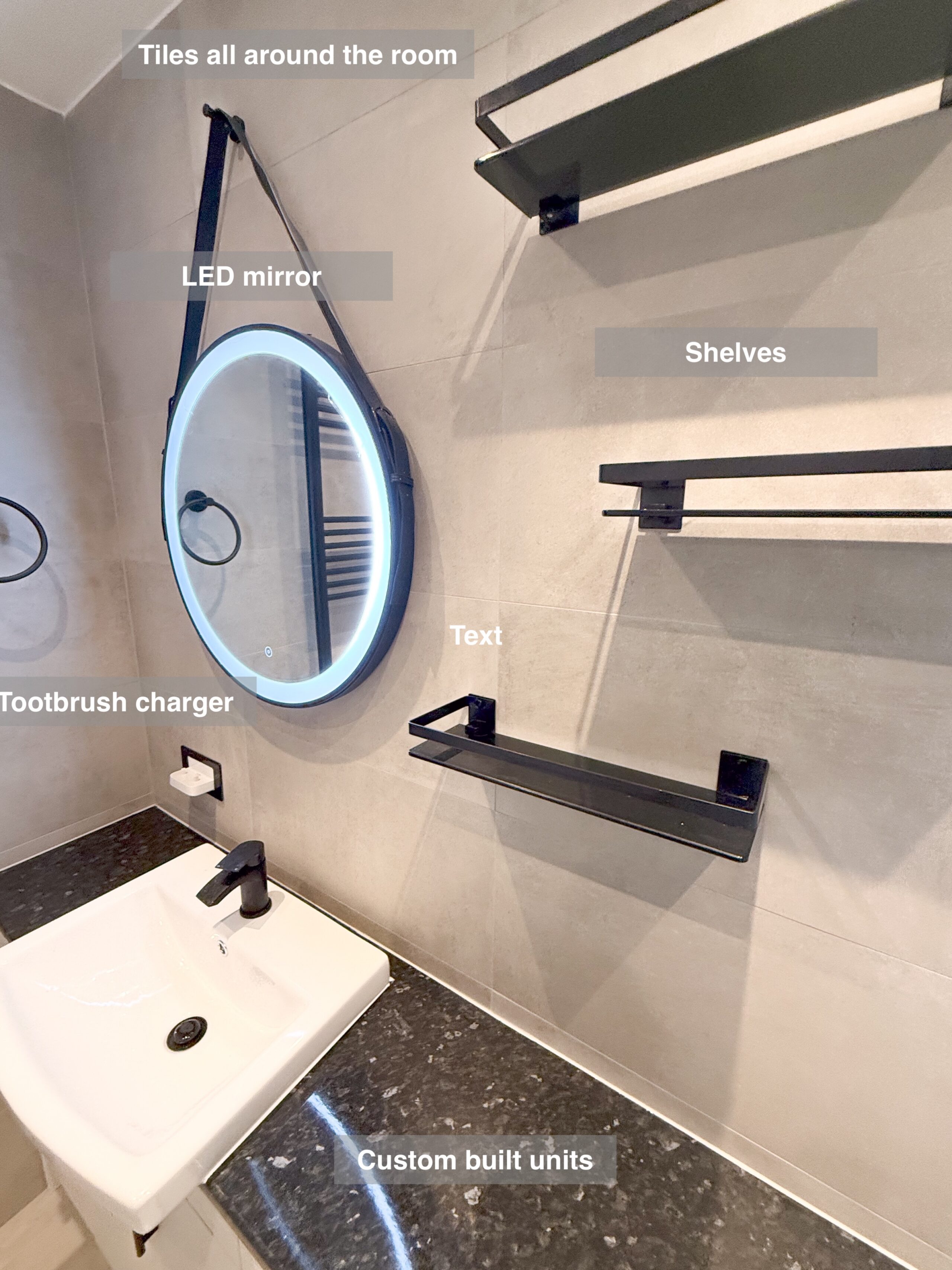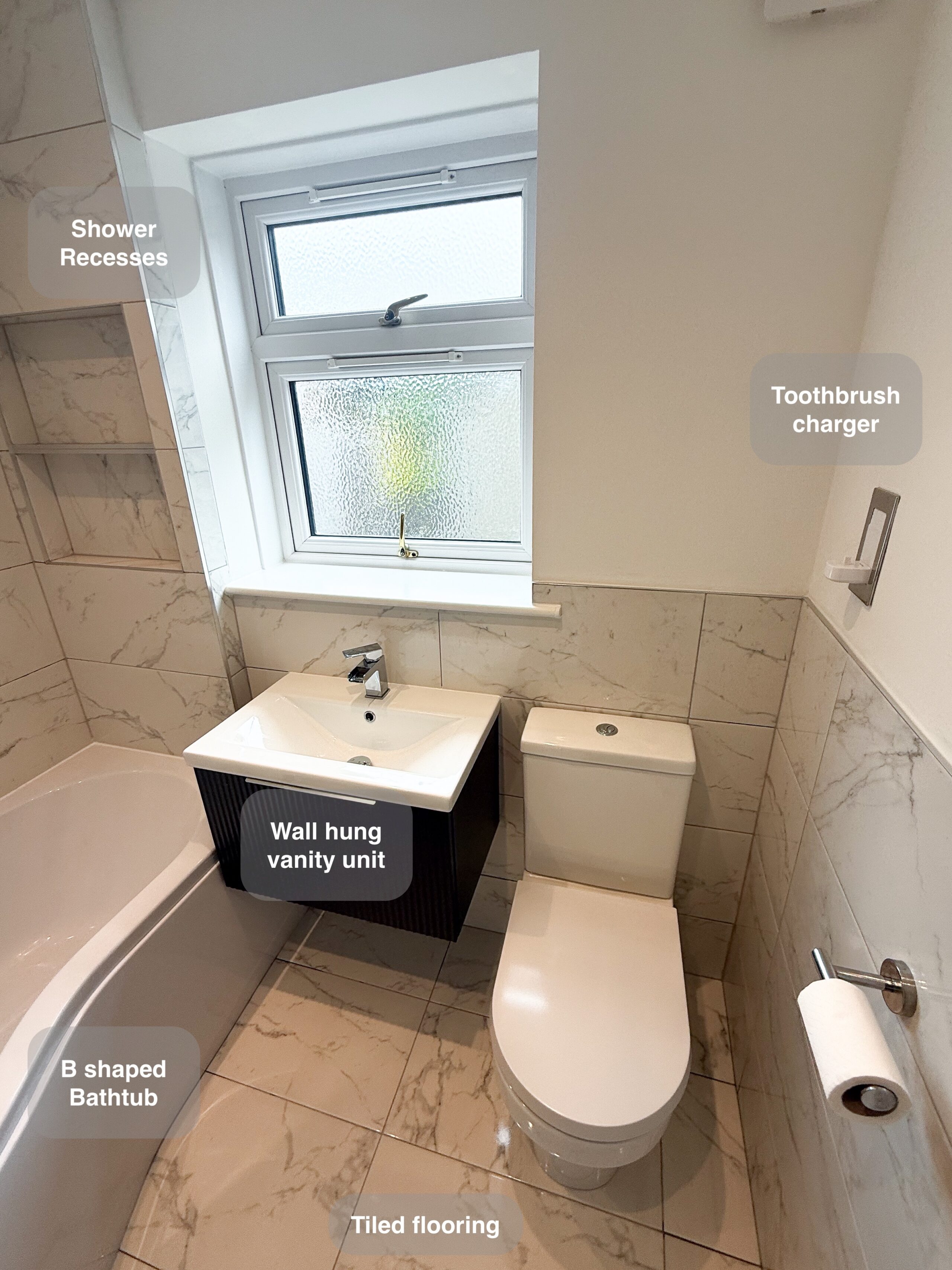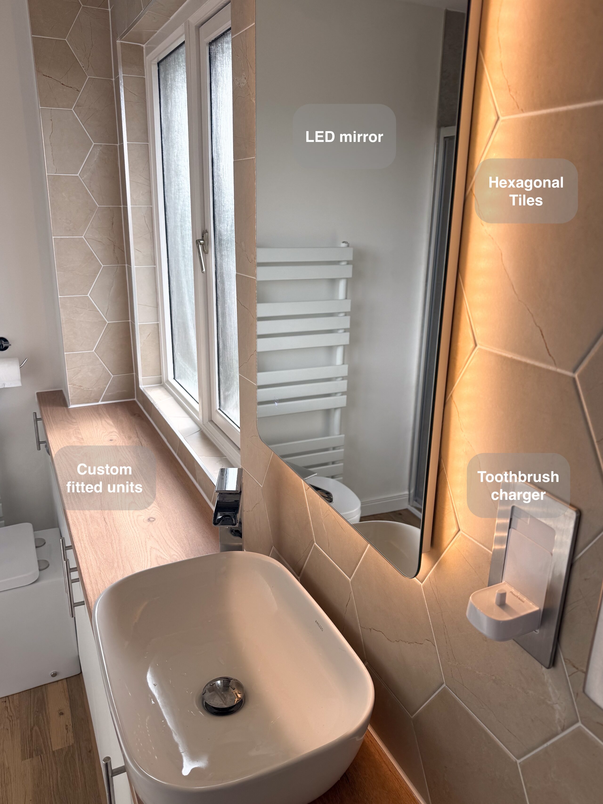 This project features full tiling throughout the room, with matching floor and wall tiles for a cohesive design. The bathtub area includes a large illuminated recess, along with two additional recesses at one end for convenient storage. The towel radiator is neatly placed in its own recess, with another illuminated recess above it for added functionality. The toilet unit is topped with two mirrored cabinets, providing extra storage space. Since there wasn’t enough room to fit a mirror above the sink, a shaving mirror was installed on the side of the window for practicality. Brushed brass accessories, trims, and fittings…