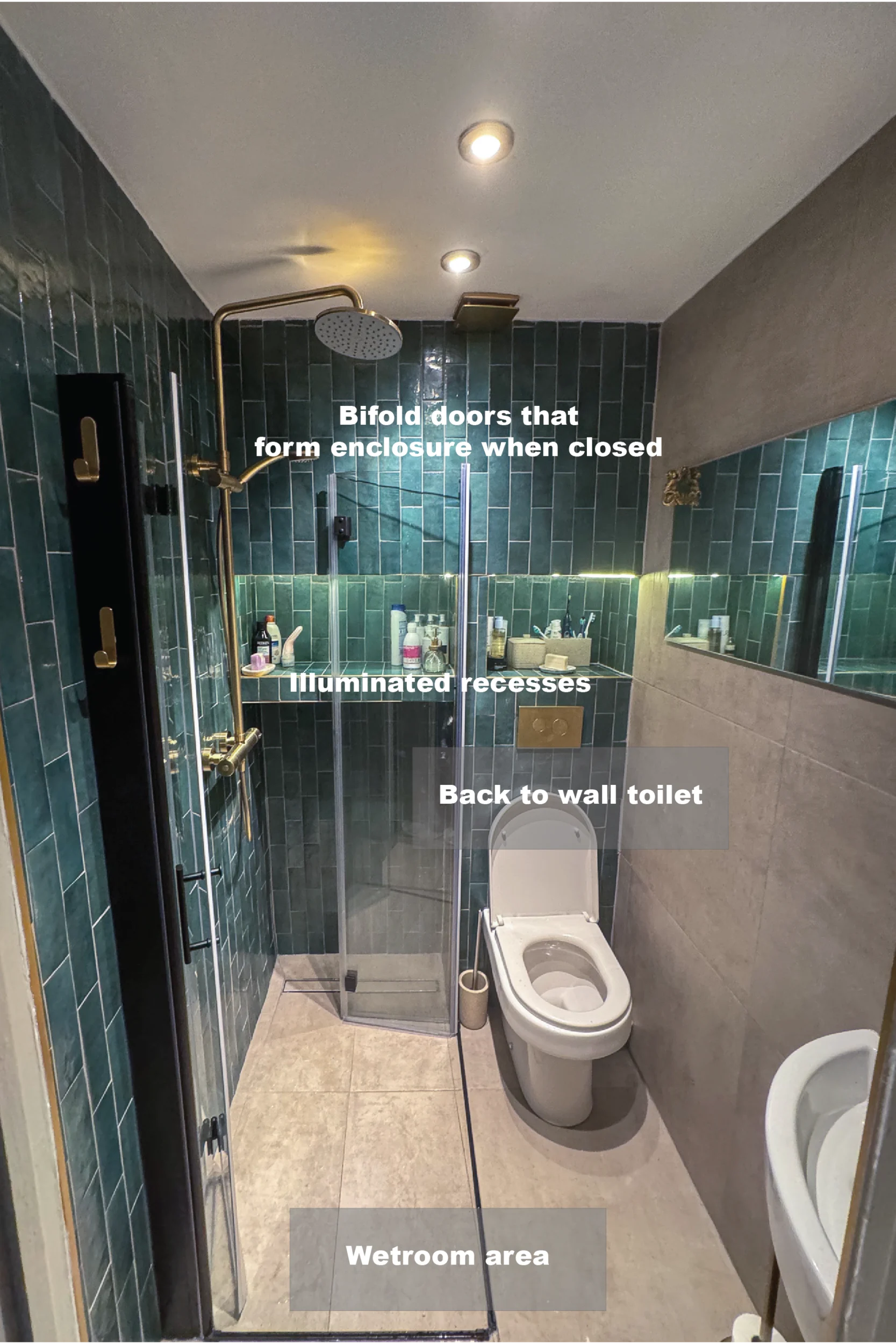 Small wetroom, with bifold shower doors forming an enclosure when closed. https://www.youtube.com/watch?v=X8uERWzkzWY