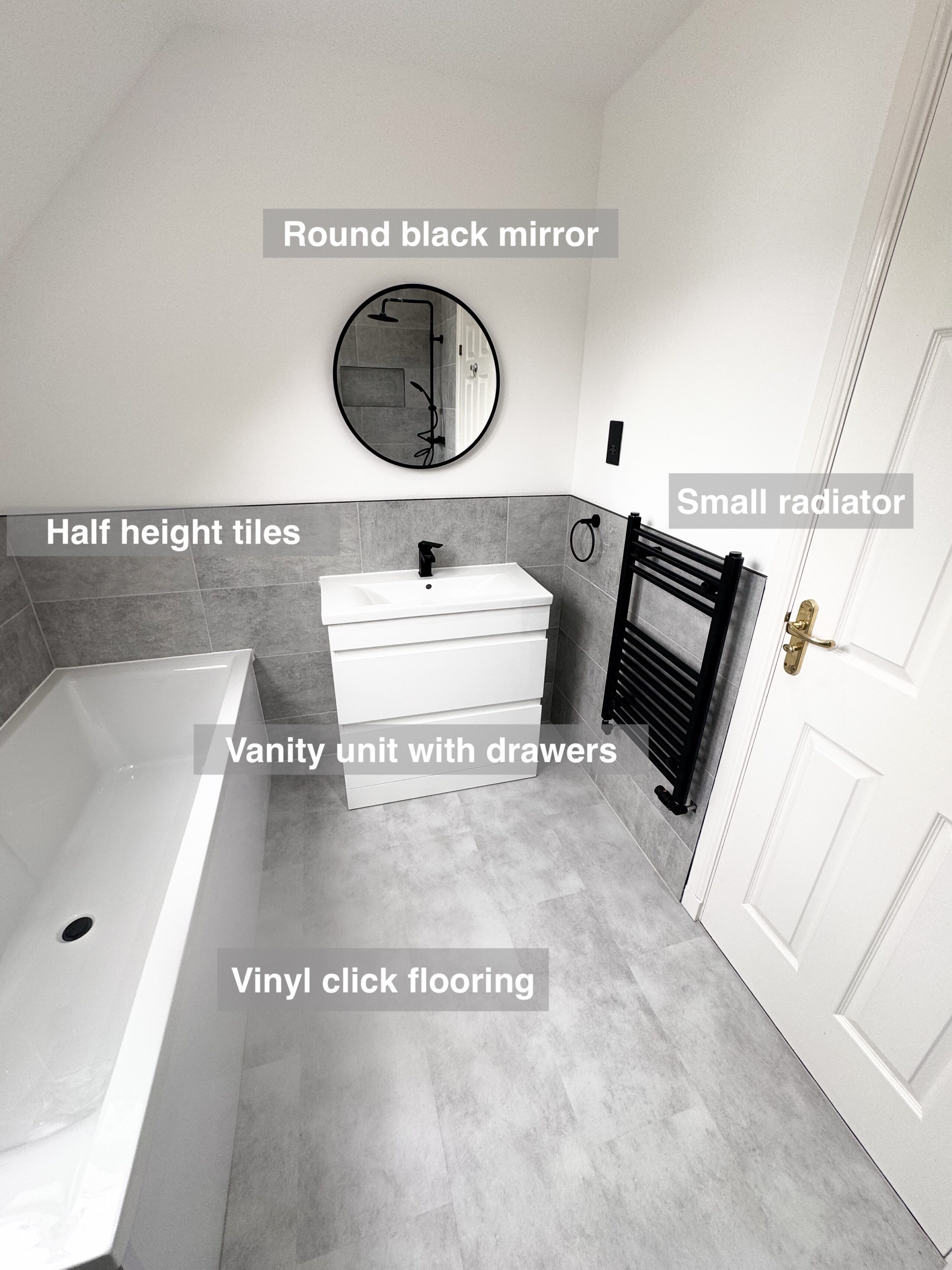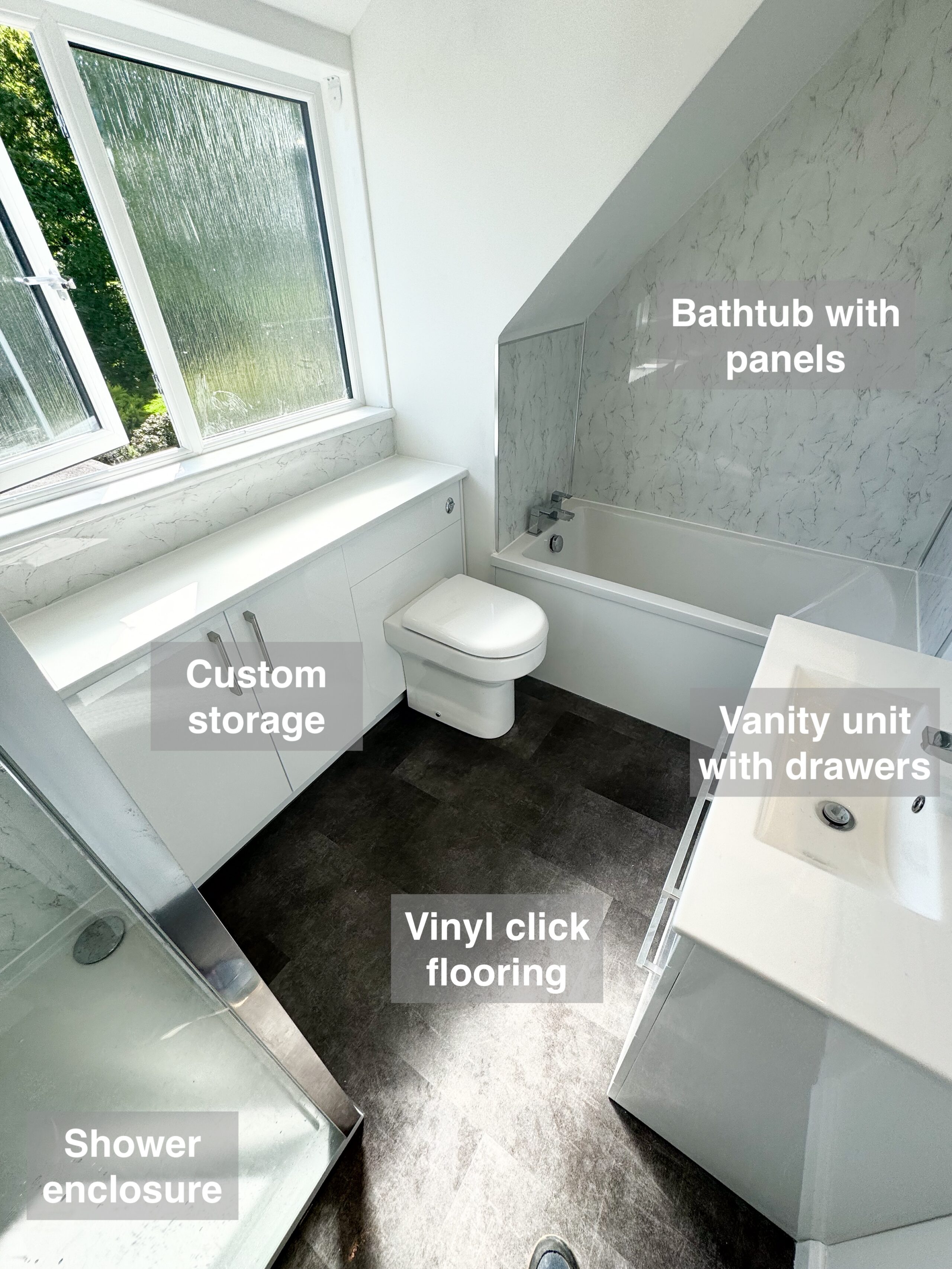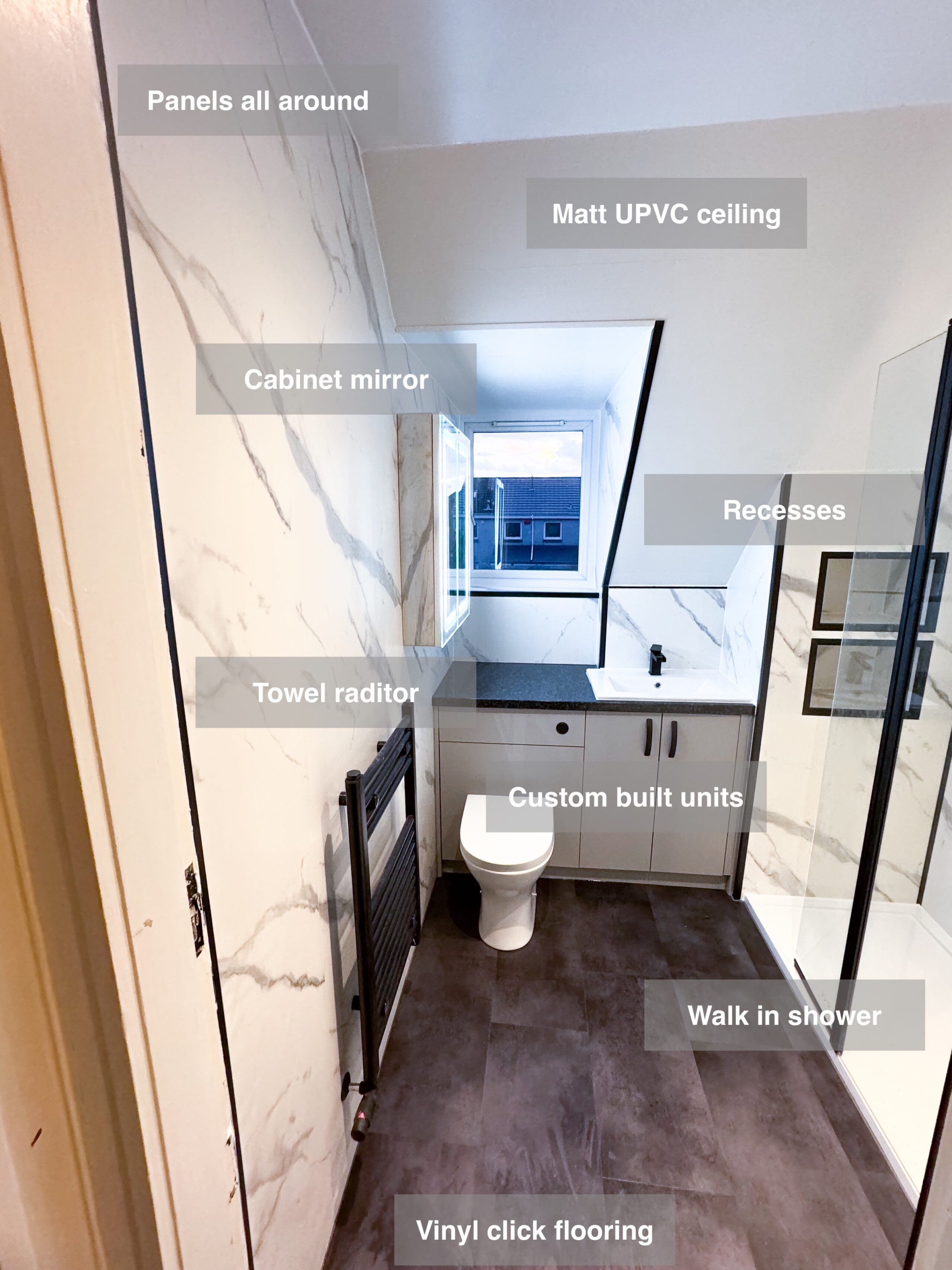 Full bathroom refurbishment where we changed the bathtub to a walk in shower, built custom built storage for the sink and toilet, fitted an LED cabinet mirror, vinyl click flooring, panels all around (with white one on the ceiling and sloped part), towel radiator, concealed shower with the controls outside the shower area, downlights. Everything is in black finish for trims and metals. Screenshot https://www.youtube.com/watch?v=-dfo18yQsGQ