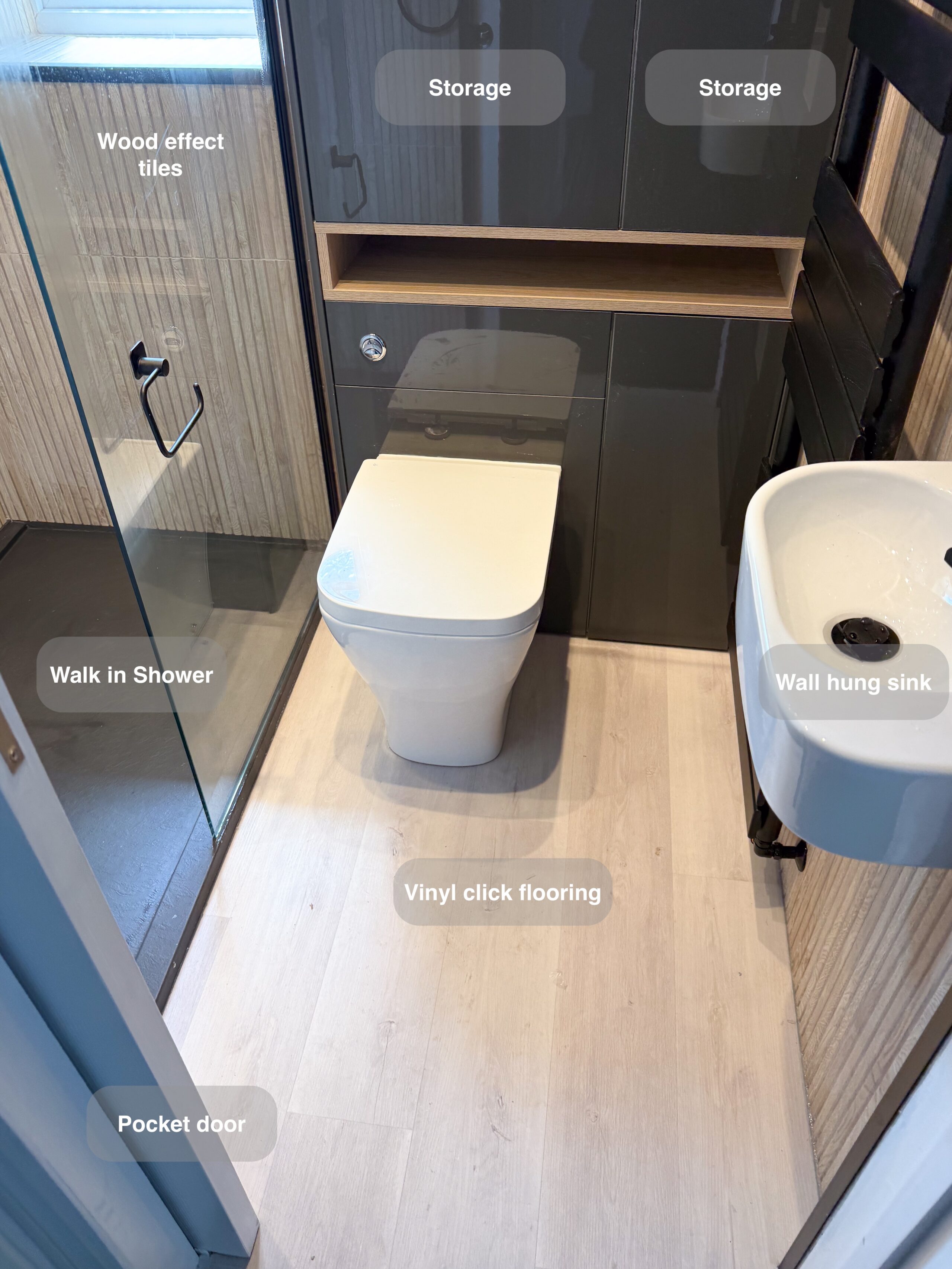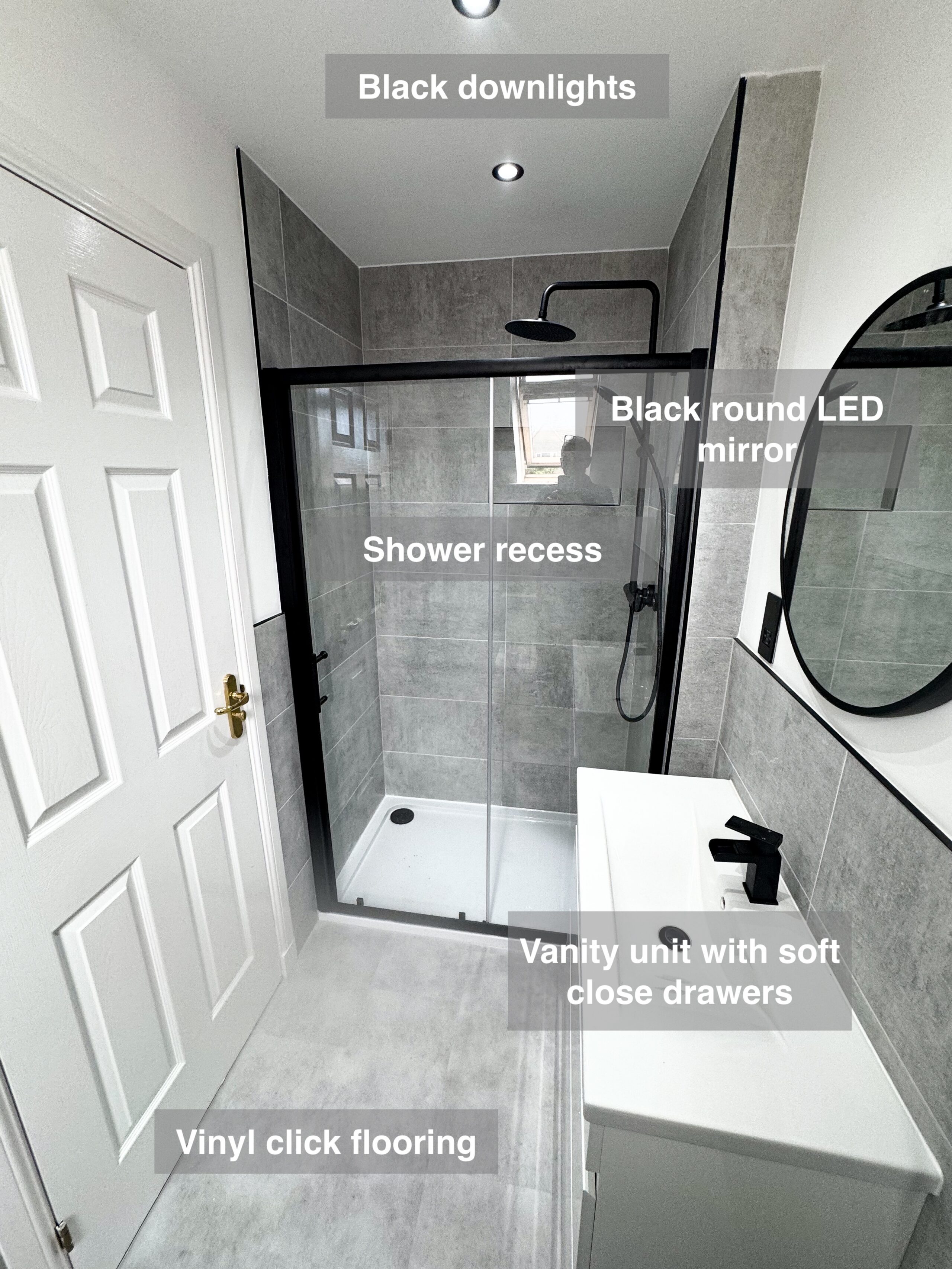 As part of a larger home renovation, we refurbished this ensuite to match the bathroom and cloakroom, creating a seamless, modern look. We installed water-resistant vinyl click flooring for durability and comfort, complemented by a sleek black-framed shower enclosure with a recessed shelf and dual thermostatic controls. The space features full shower tiling, half-height wall tiles, and a compact towel radiator with concealed piping for a streamlined finish. A soft-close vanity unit with a black tap provides stylish storage, while coordinated black accents—including a shaver socket, downlights, and a framed mirror—enhance the contemporary aesthetic. This ensuite combines practicality with sophistication…