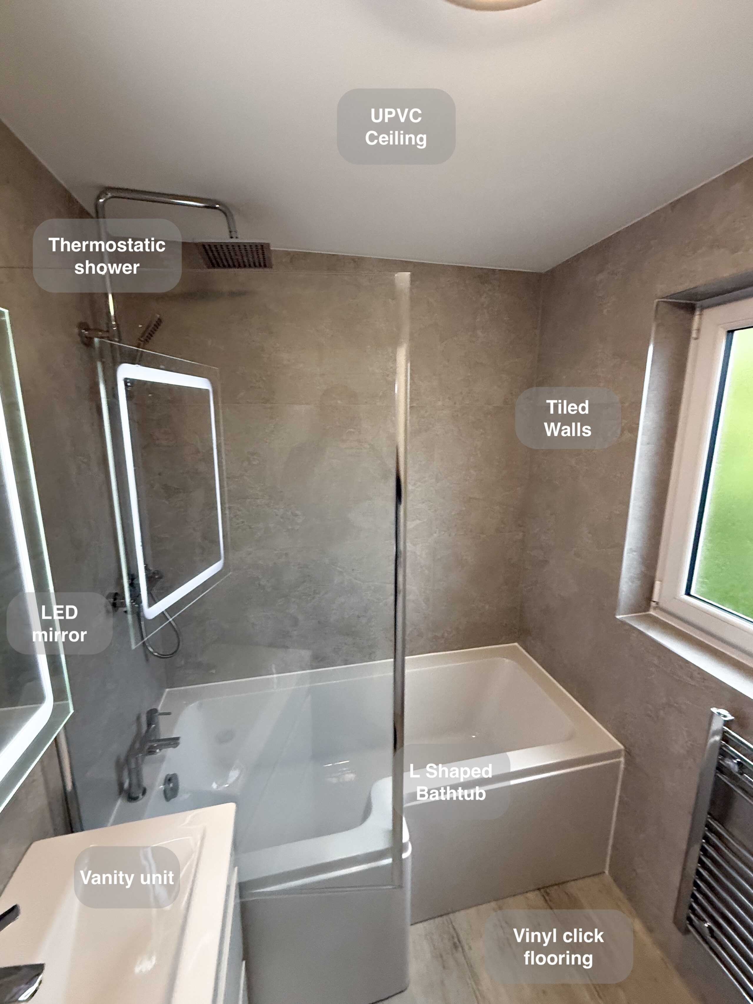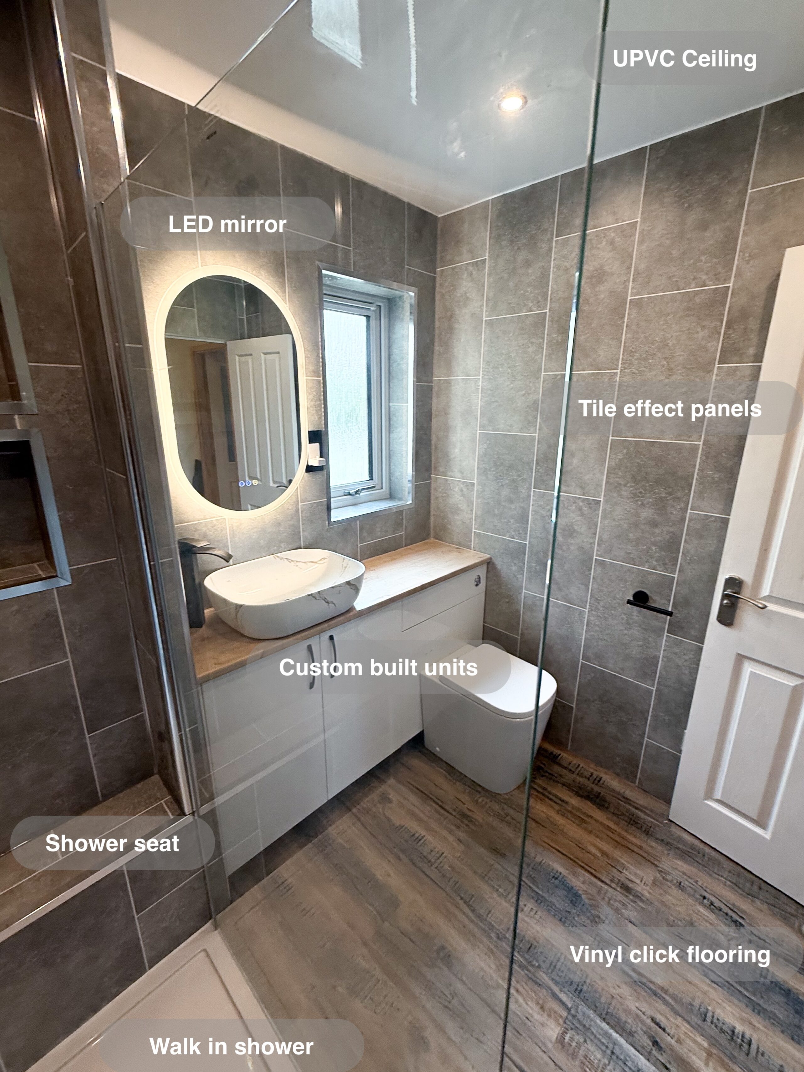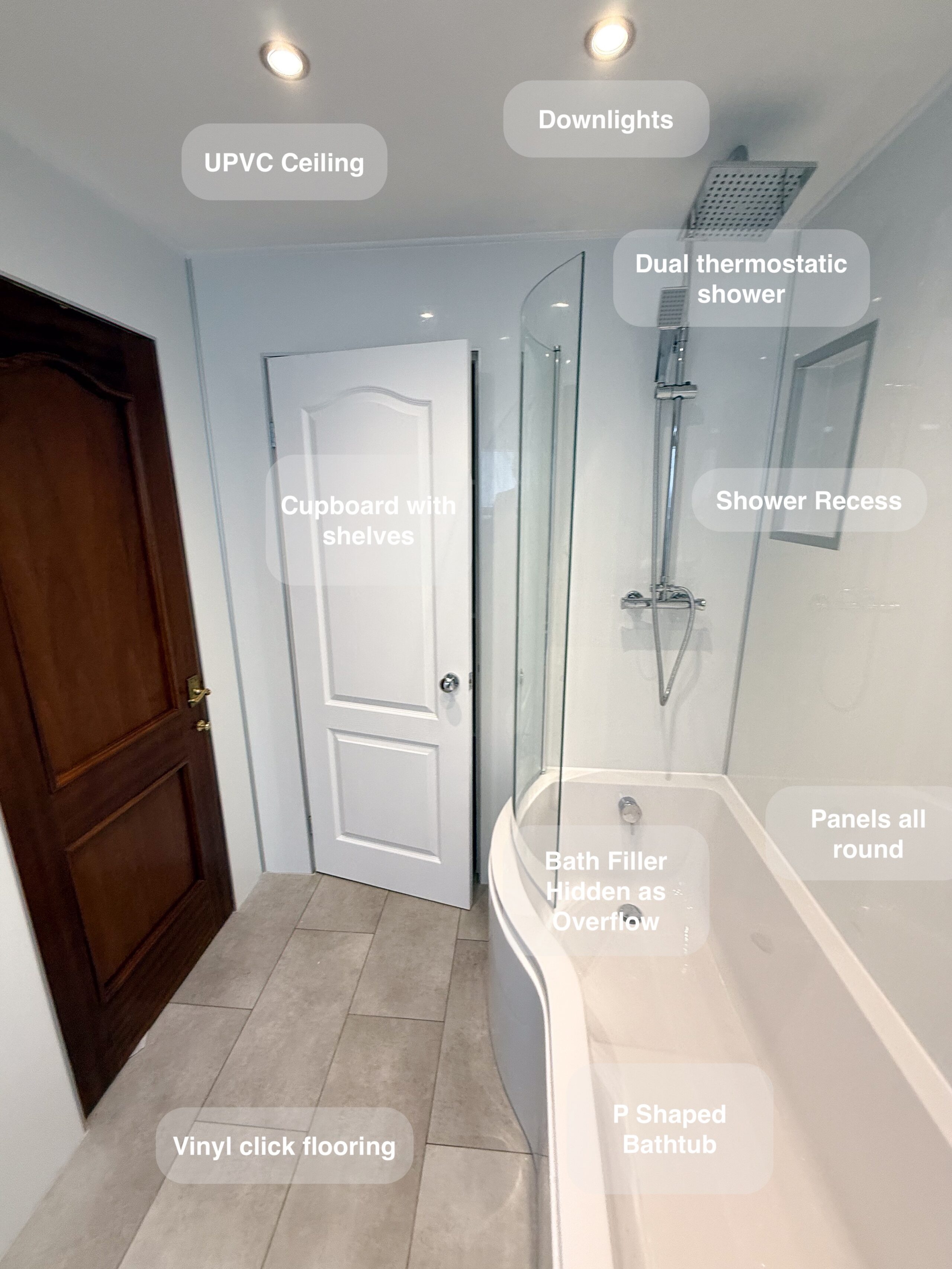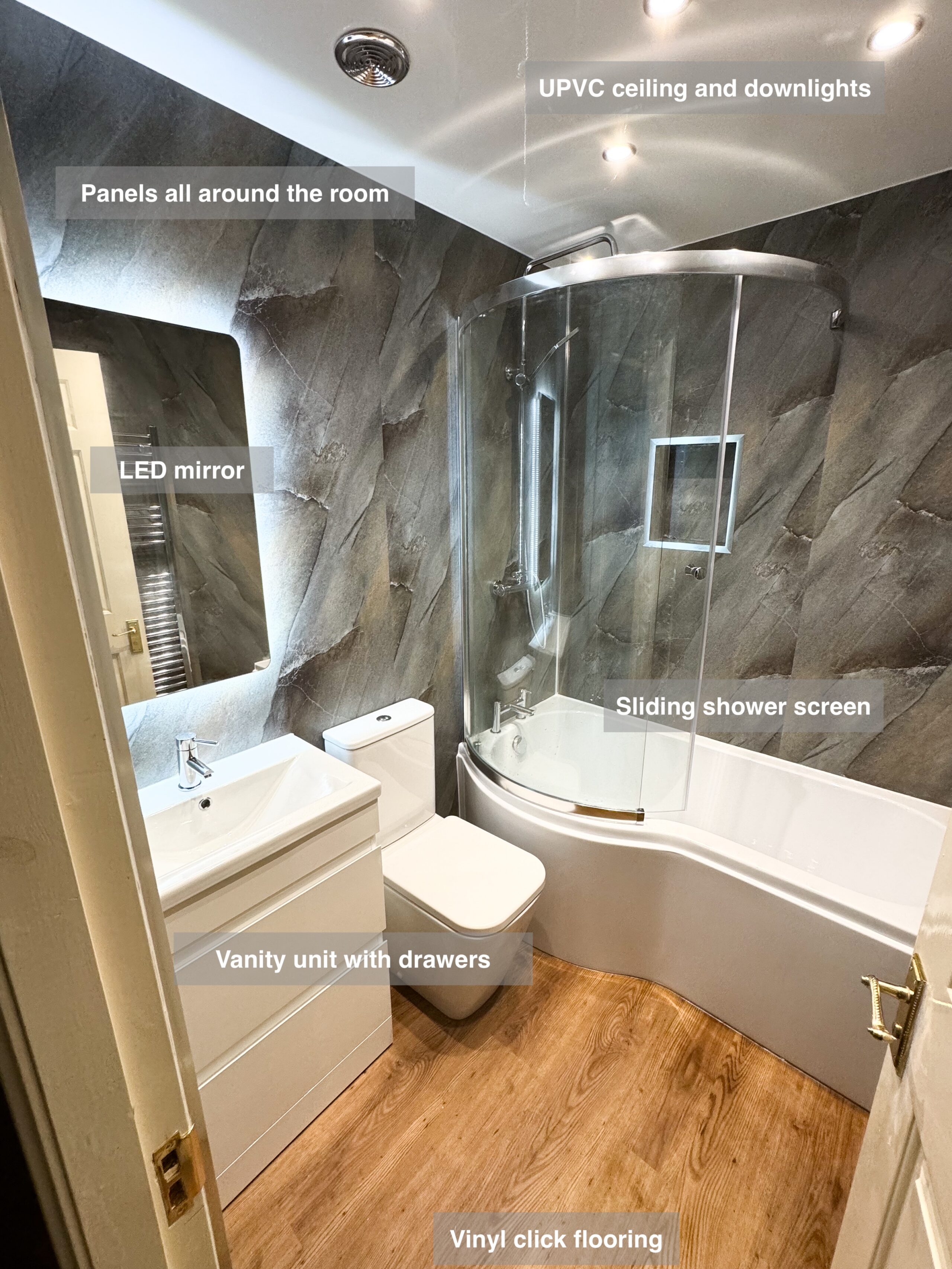 Full bathroom refurbishment with panels all around the room, P shaped bathtub (with glass forming an almost full enclosure, close coupled toilet, LED mirror, towel radiator, vinyl click flooring, downlights, new extractor fan, recess shower area. https://youtube.com/shorts/3RGqYXmdQOo
