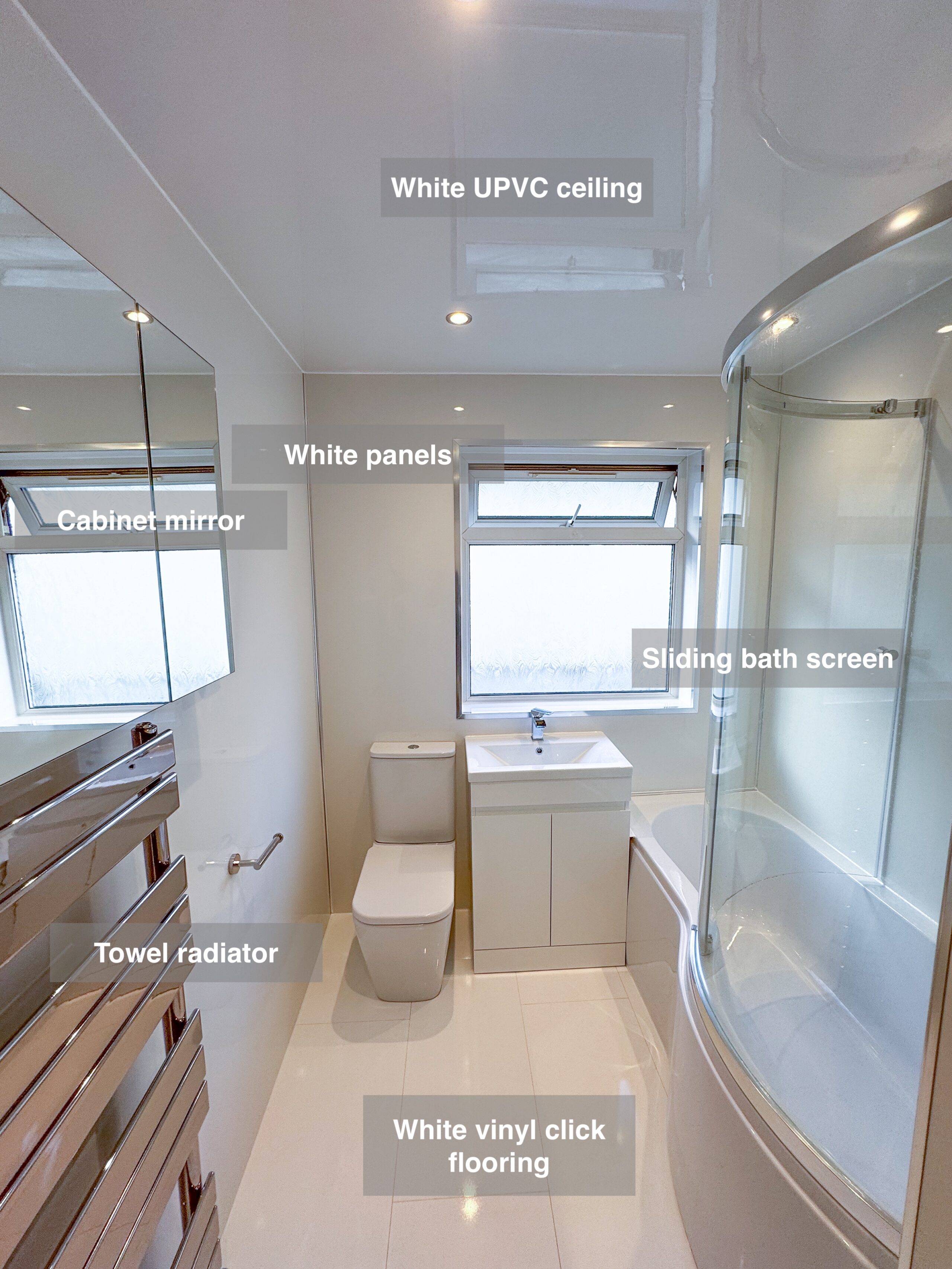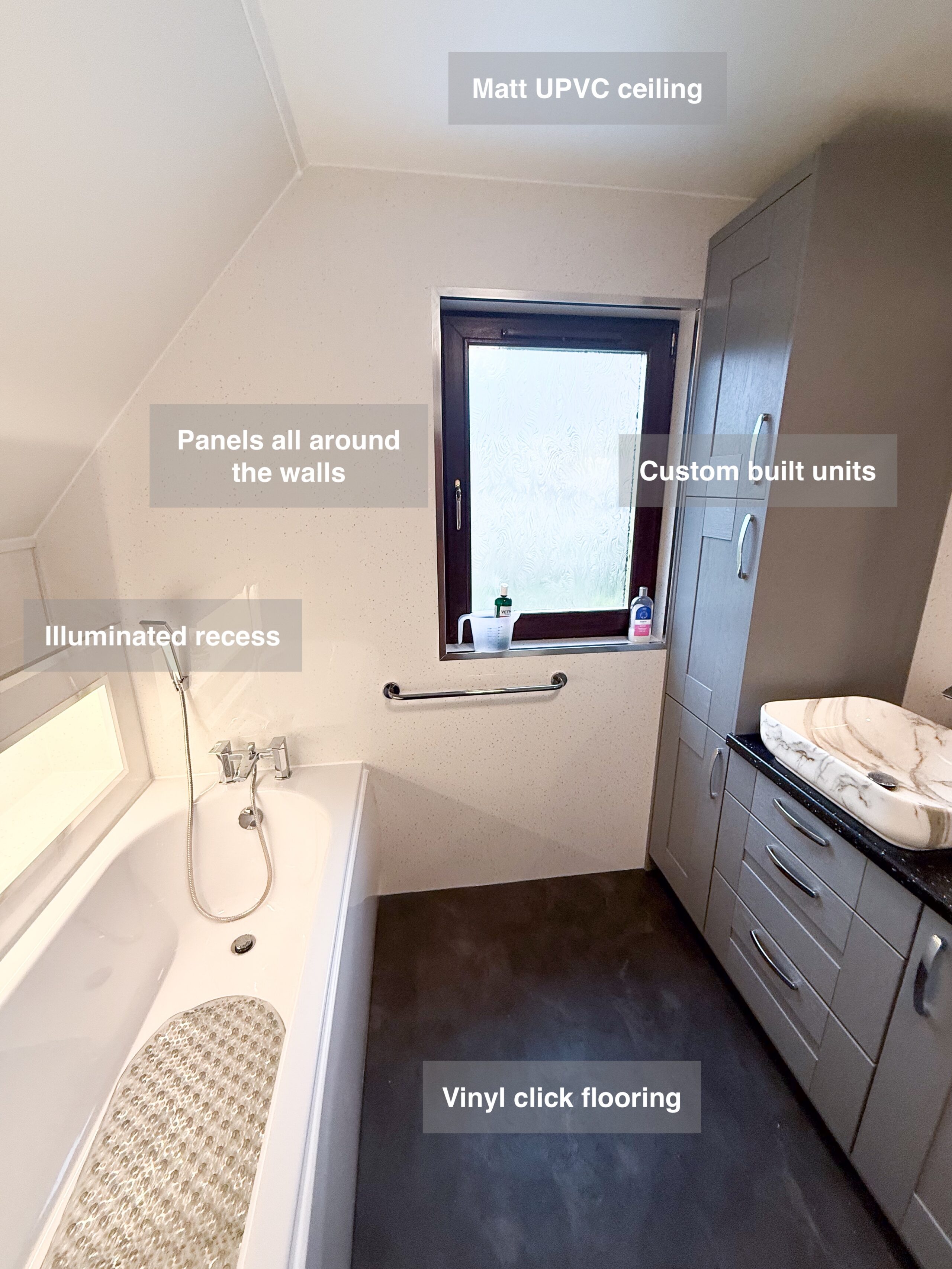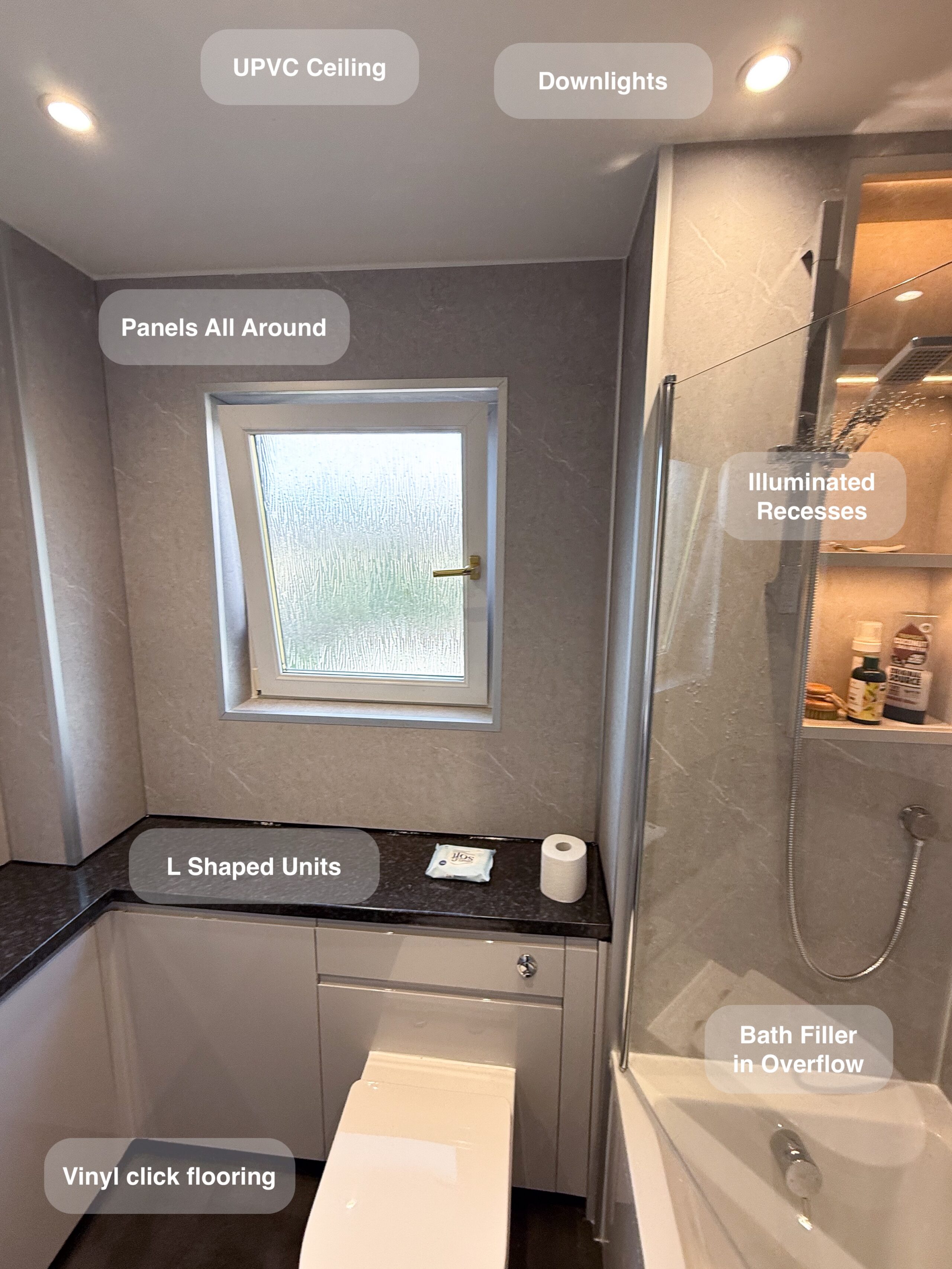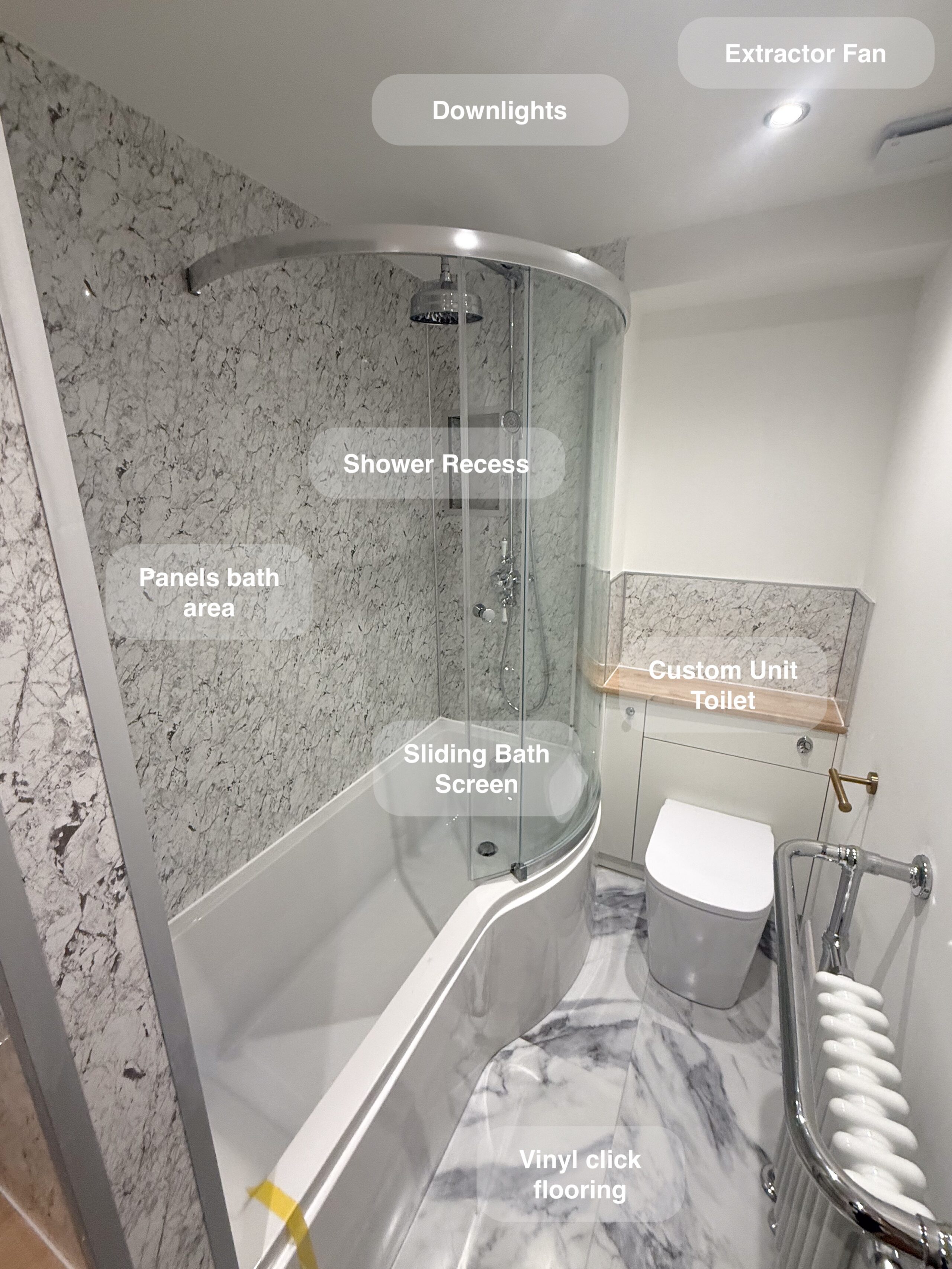 Full bathroom refurbishment with panels all around the room, P shaped bathtub (with glass forming an almost full enclosure, close coupled toilet, LED mirror, towel radiator, vinyl click flooring, downlights, new extractor fan, recess shower area. https://youtube.com/shorts/3RGqYXmdQOo