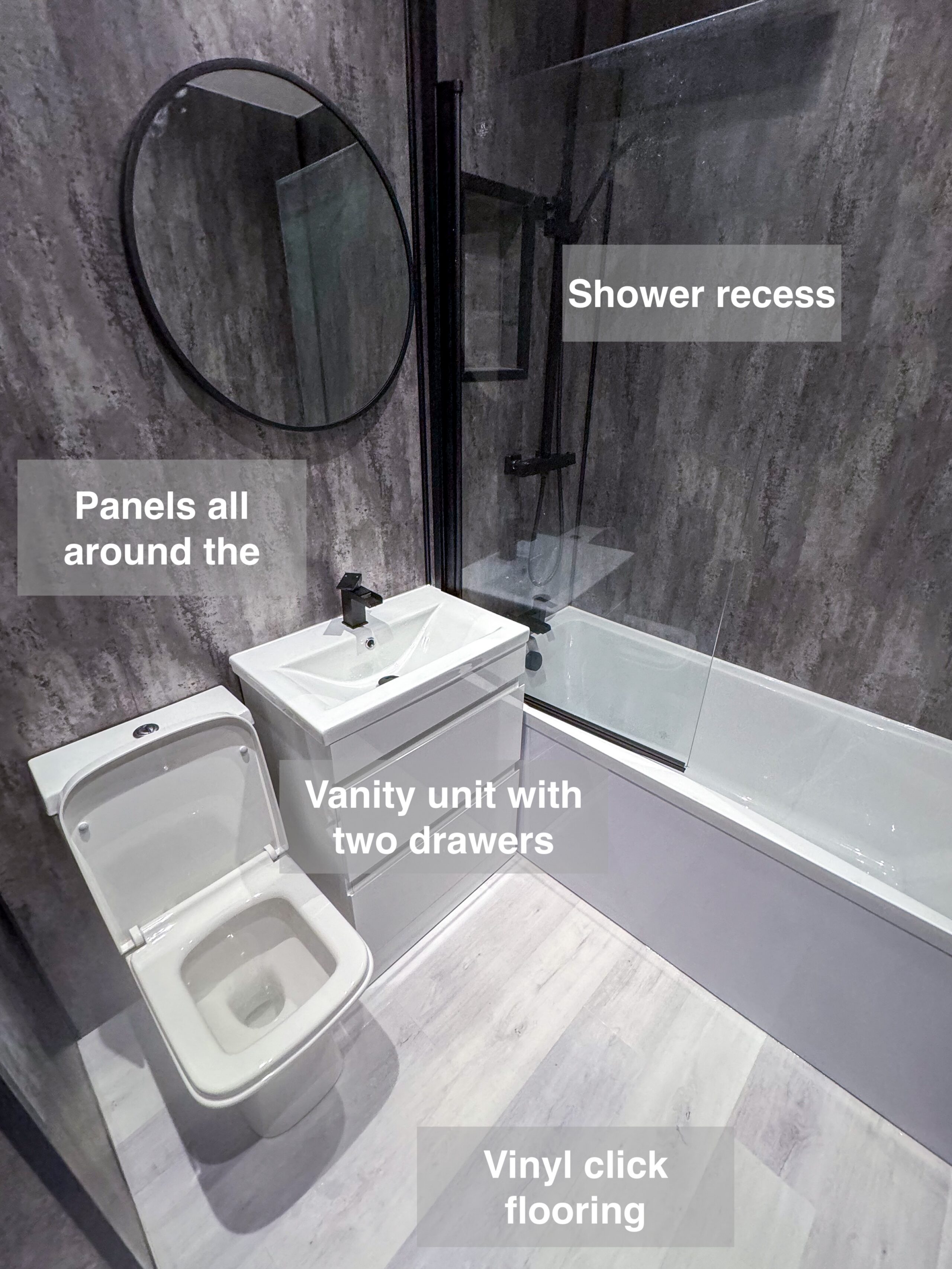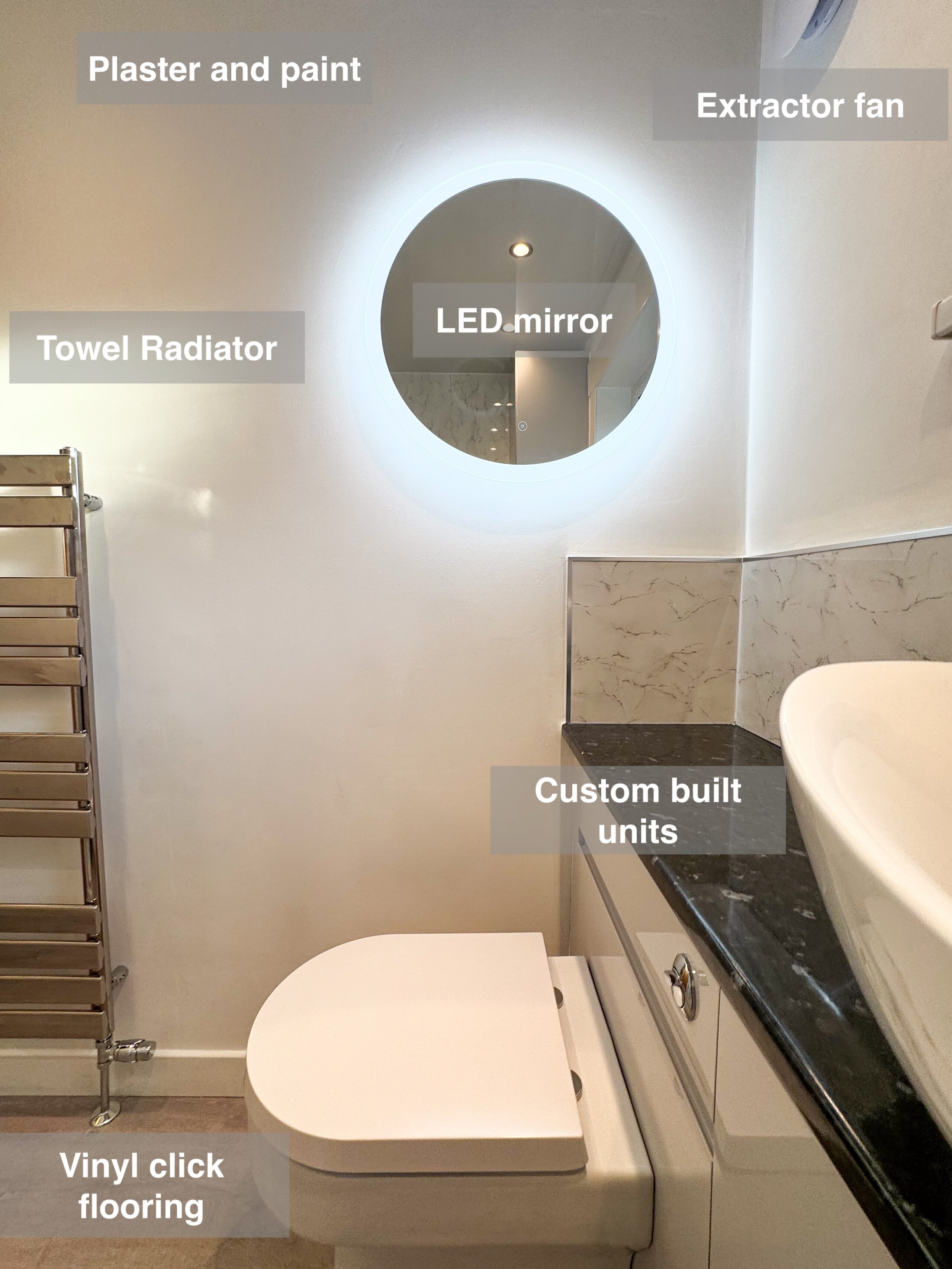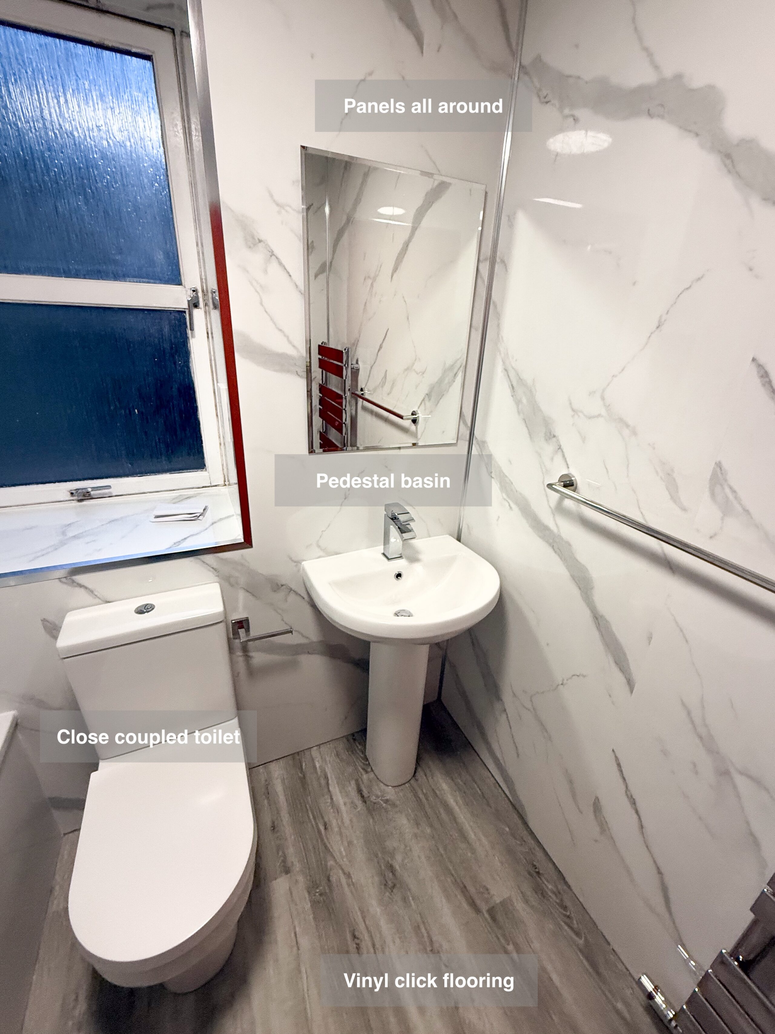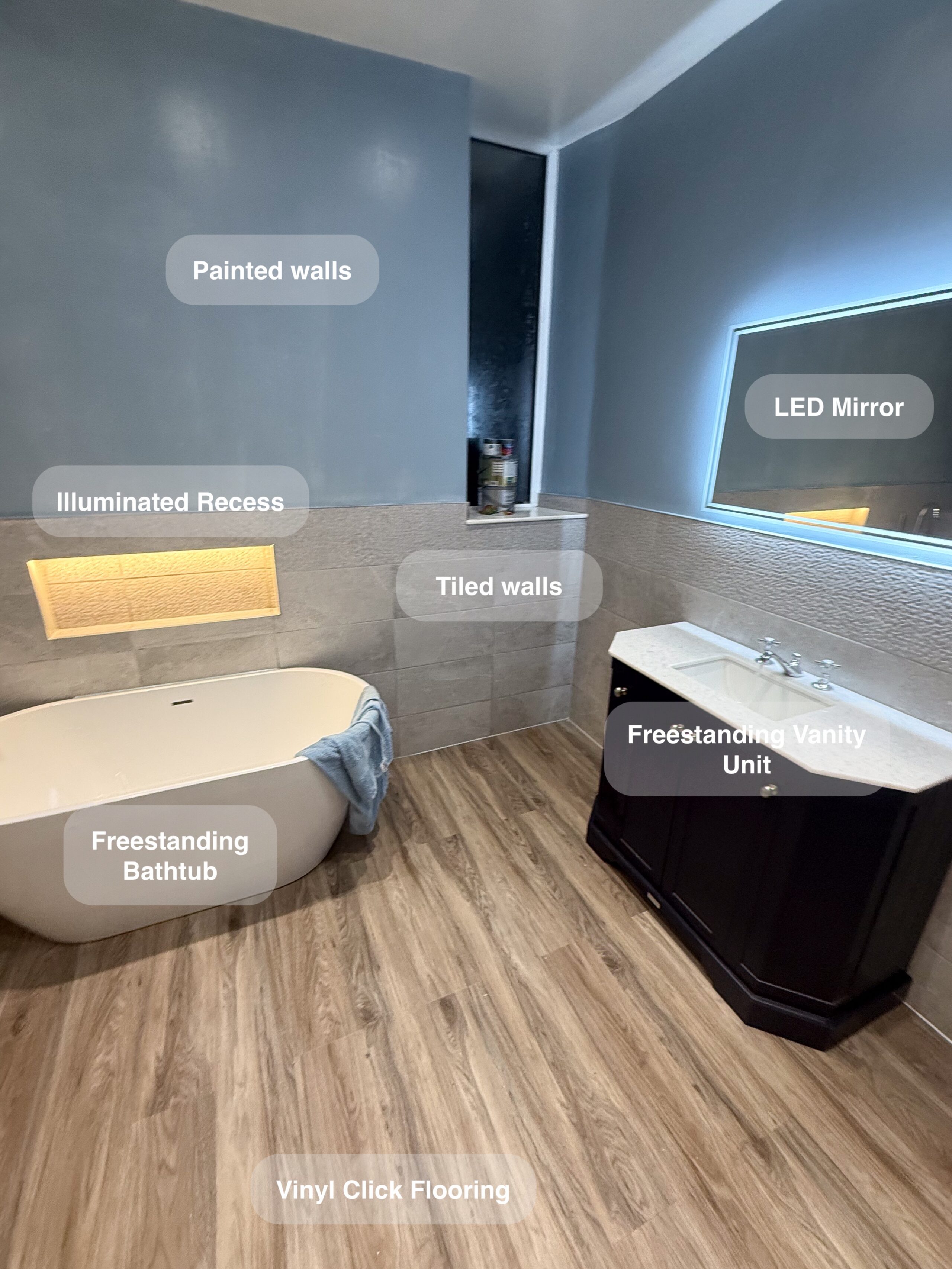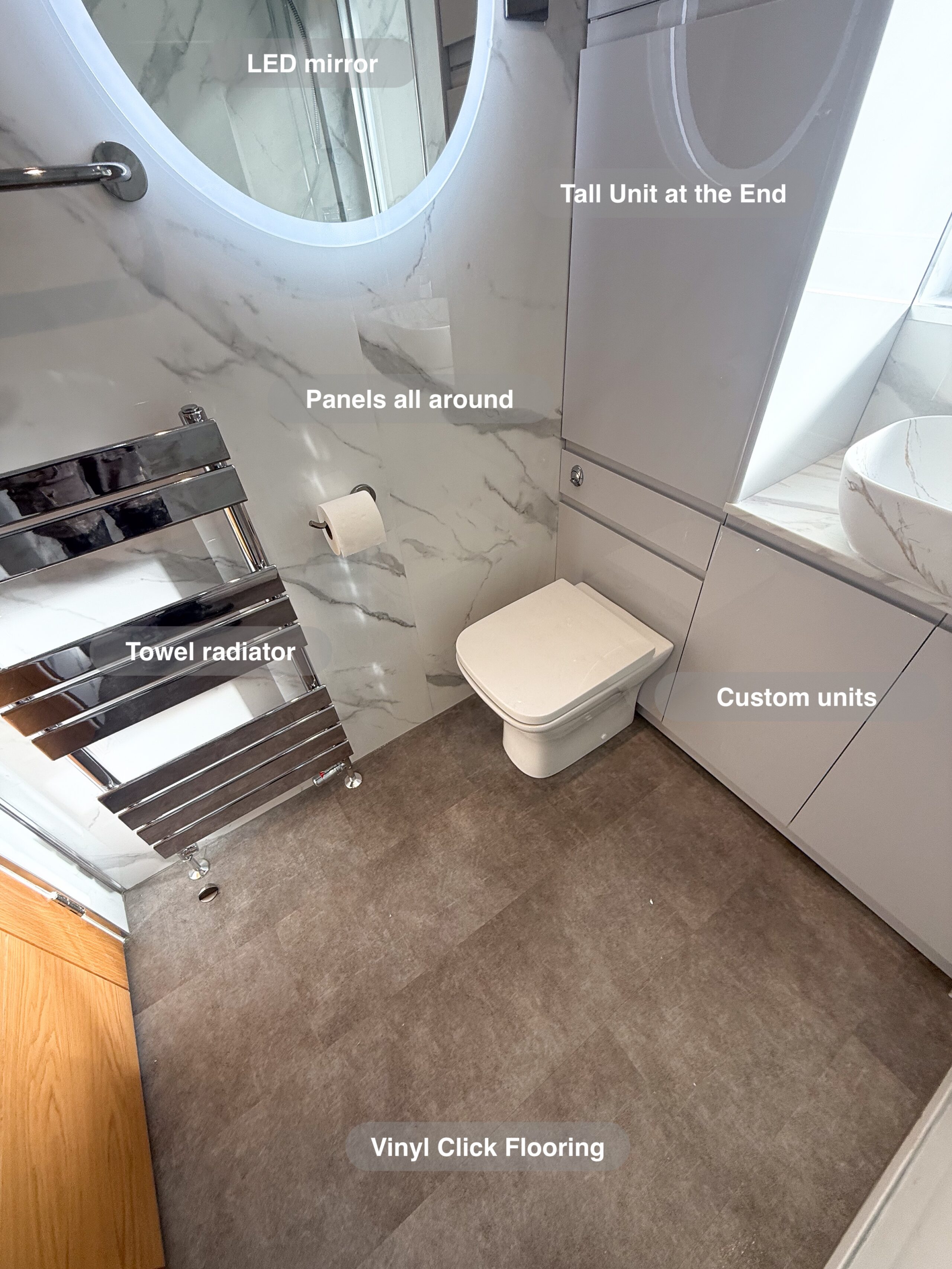 Full bathroom refurbishment with panels all around the room, P shaped bathtub (with glass forming an almost full enclosure, close coupled toilet, LED mirror, towel radiator, vinyl click flooring, downlights, new extractor fan, recess shower area. https://youtube.com/shorts/3RGqYXmdQOo