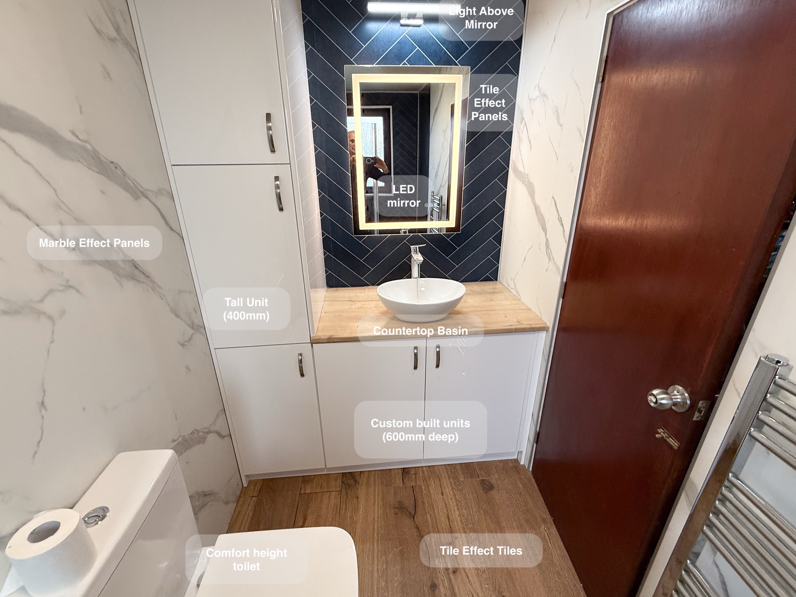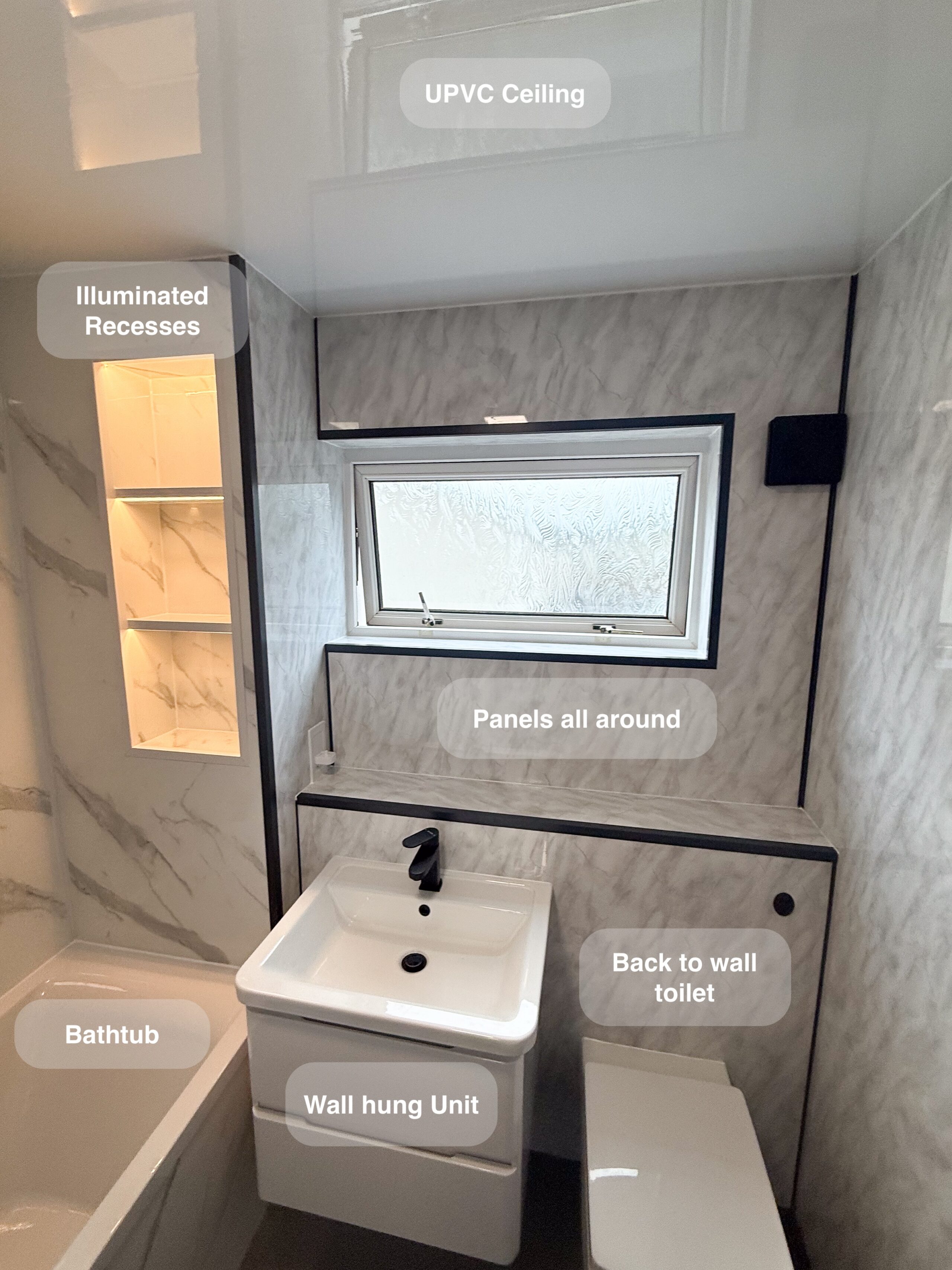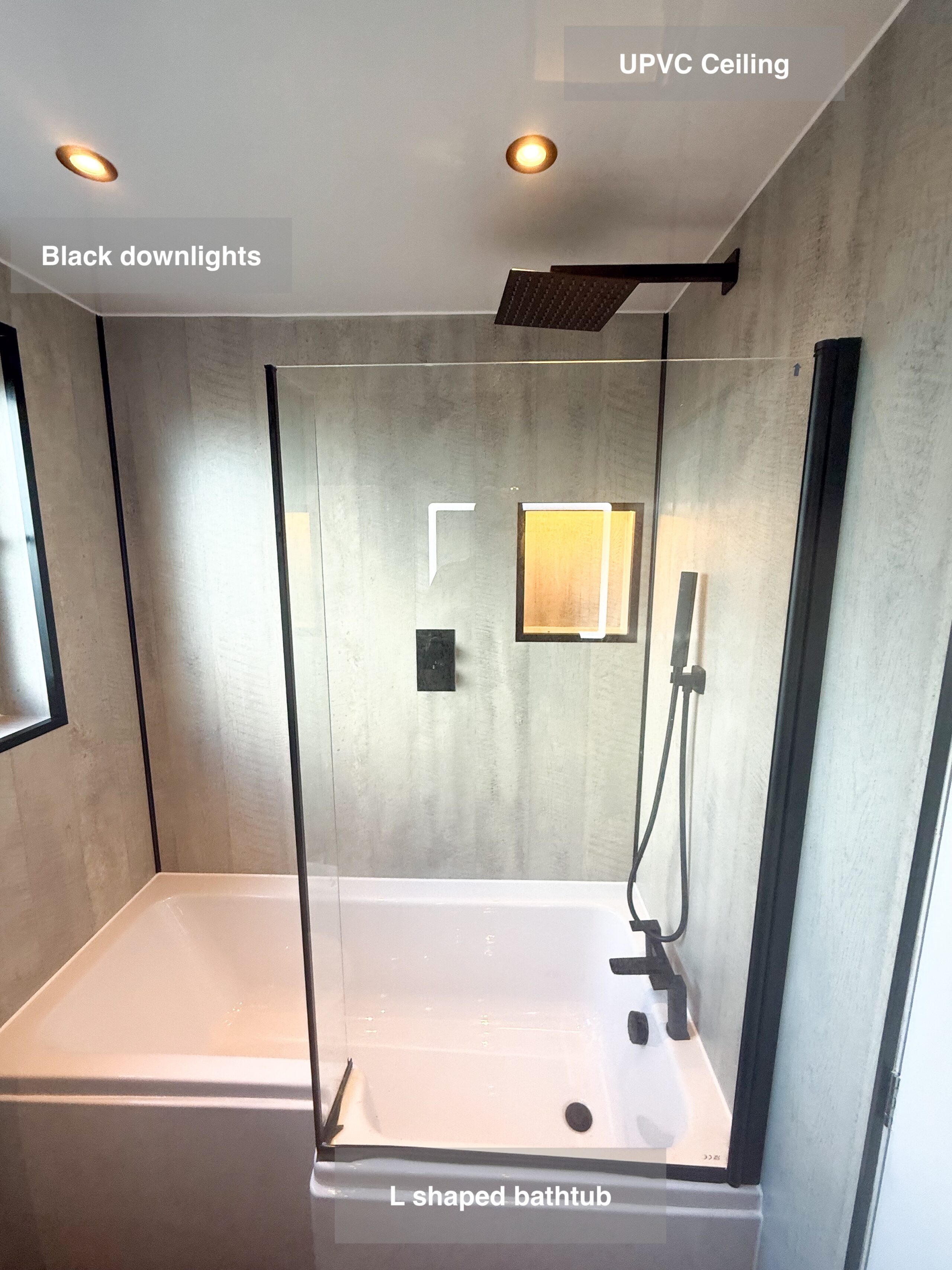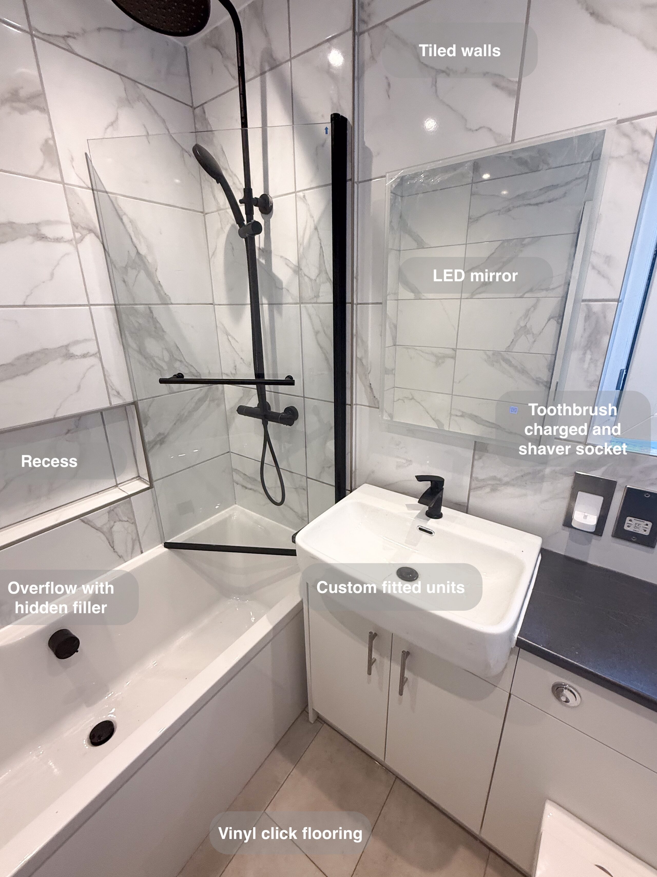 Full bathroom refurbishment with panels all around the room, P shaped bathtub (with glass forming an almost full enclosure, close coupled toilet, LED mirror, towel radiator, vinyl click flooring, downlights, new extractor fan, recess shower area. https://youtube.com/shorts/3RGqYXmdQOo