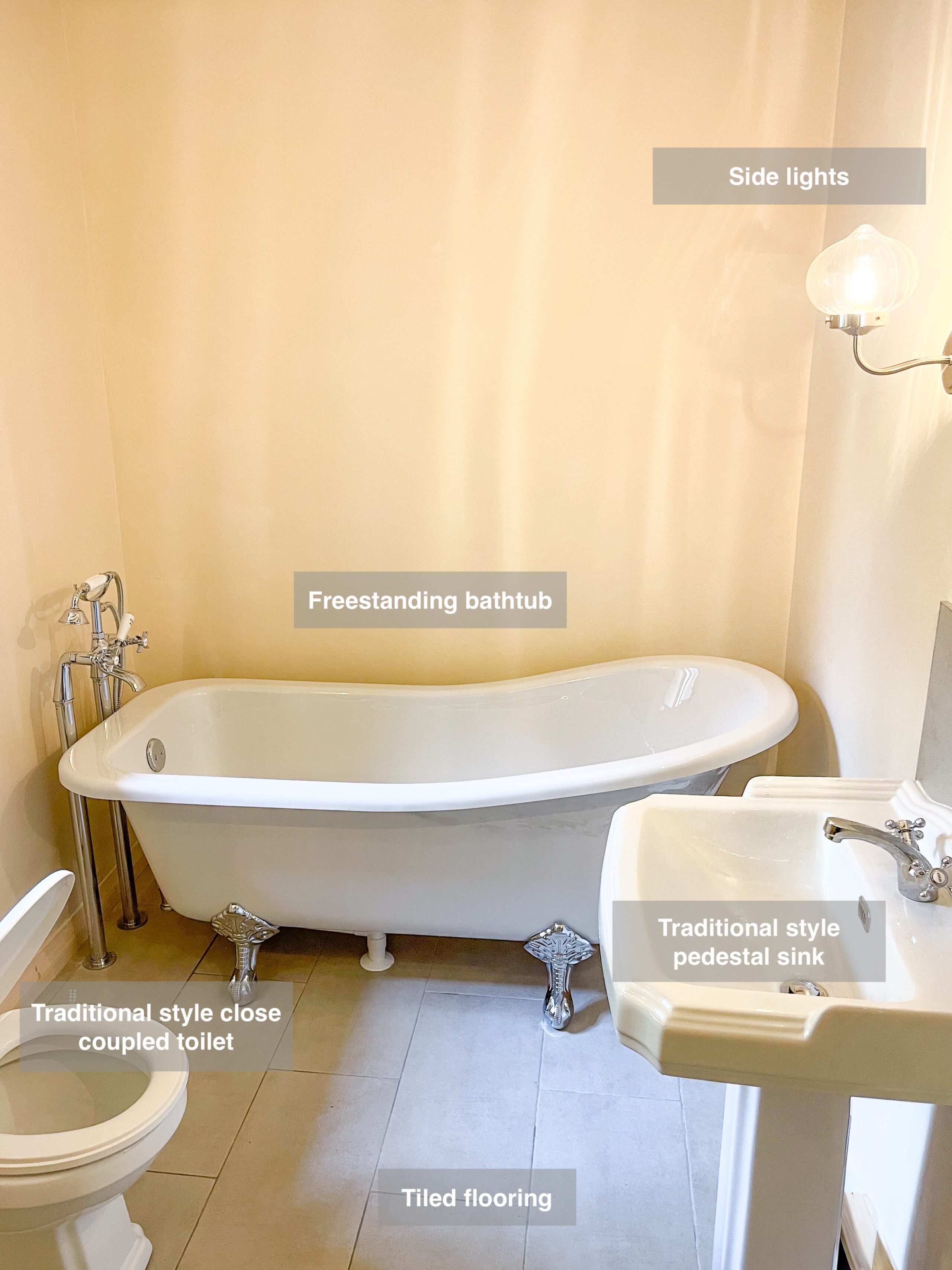 This bathroom blends timeless design with practical features. A freestanding bathtub with a floor-mounted filler creates a luxurious focal point, complemented by a traditional toilet and pedestal sink. Modern touches include a compact shower enclosure, deep storage units above the washing machine and tumble dryer, and side mirror lights for optimal lighting. The tiled floor ensures durability and easy cleaning, making the space as functional as it is stylish. https://youtu.be/Lh7qOdEd5b0