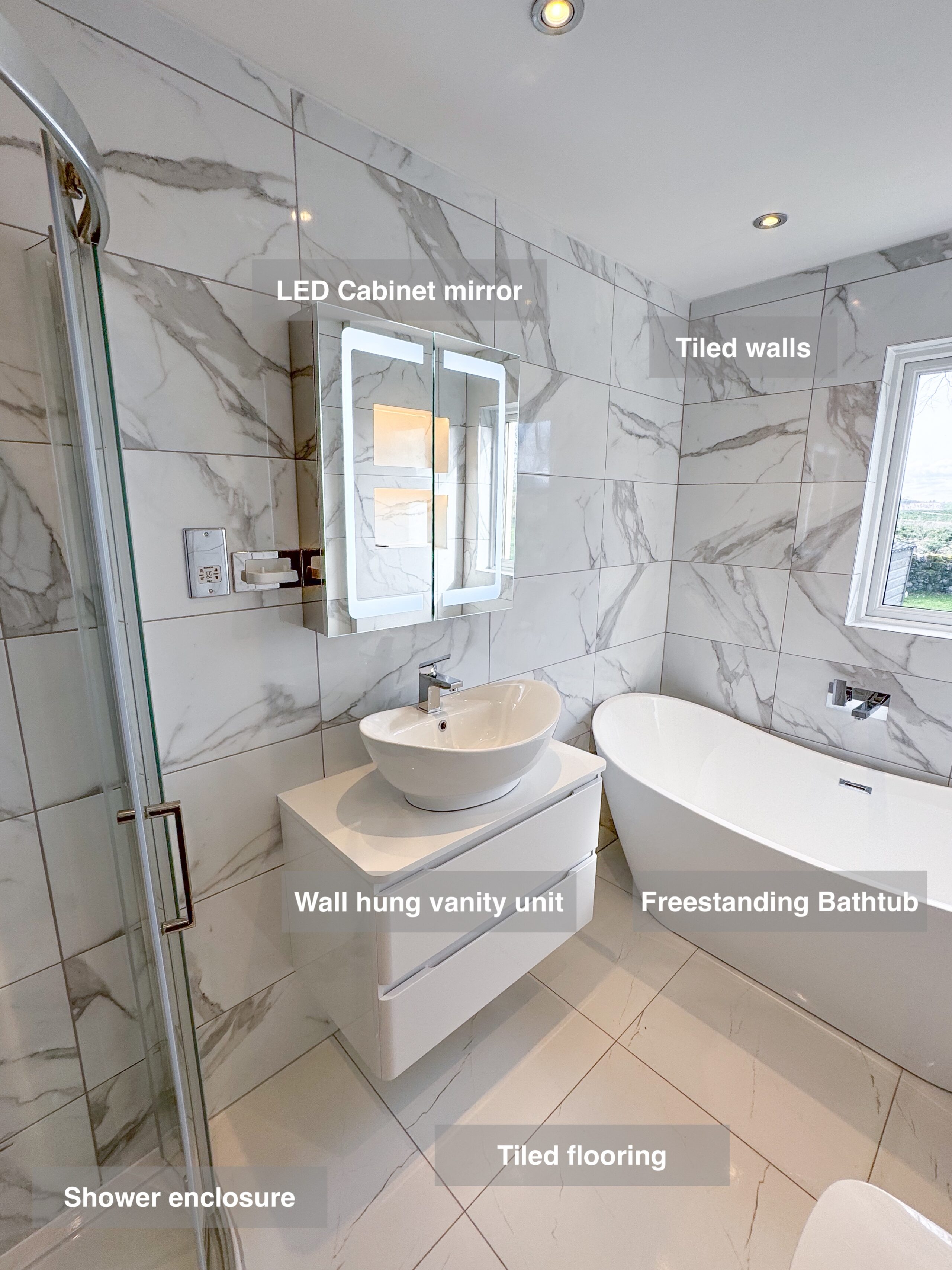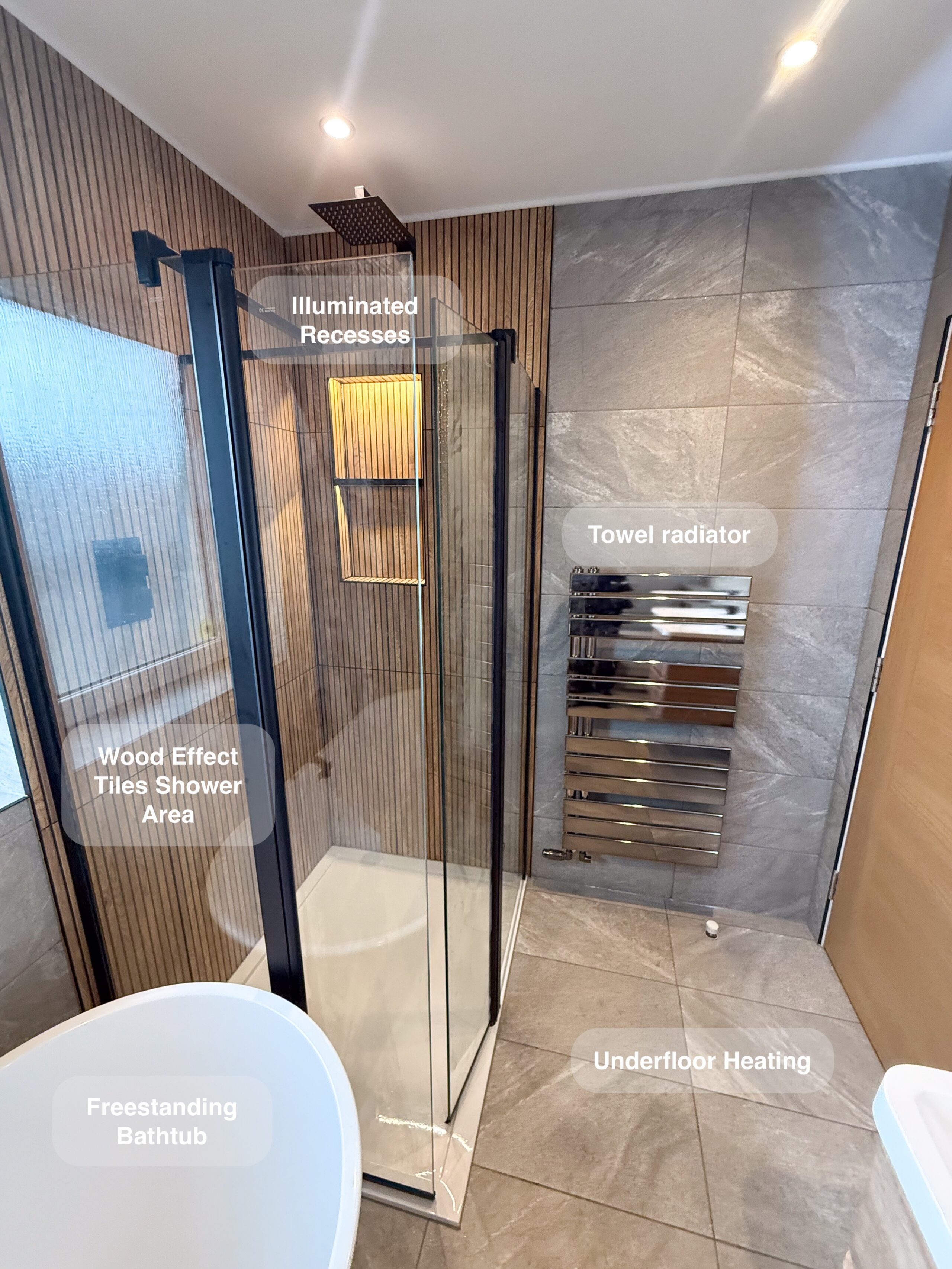 This was a full bathroom refurbishment where the layout stayed pretty much the same, but everything was updated to make the space more comfortable, practical and modern. We replaced the old enclosure with a large walk-in shower with a stone-effect tray and two illuminated recesses, which keeps things tidy and makes everyday use much easier. The corner bath was removed and replaced with a modern freestanding bath with an illuminated recess, opening the room up and turning the bath into a real feature. The old unit was swapped for a freestanding vanity with an LED mirror above, giving better storage…