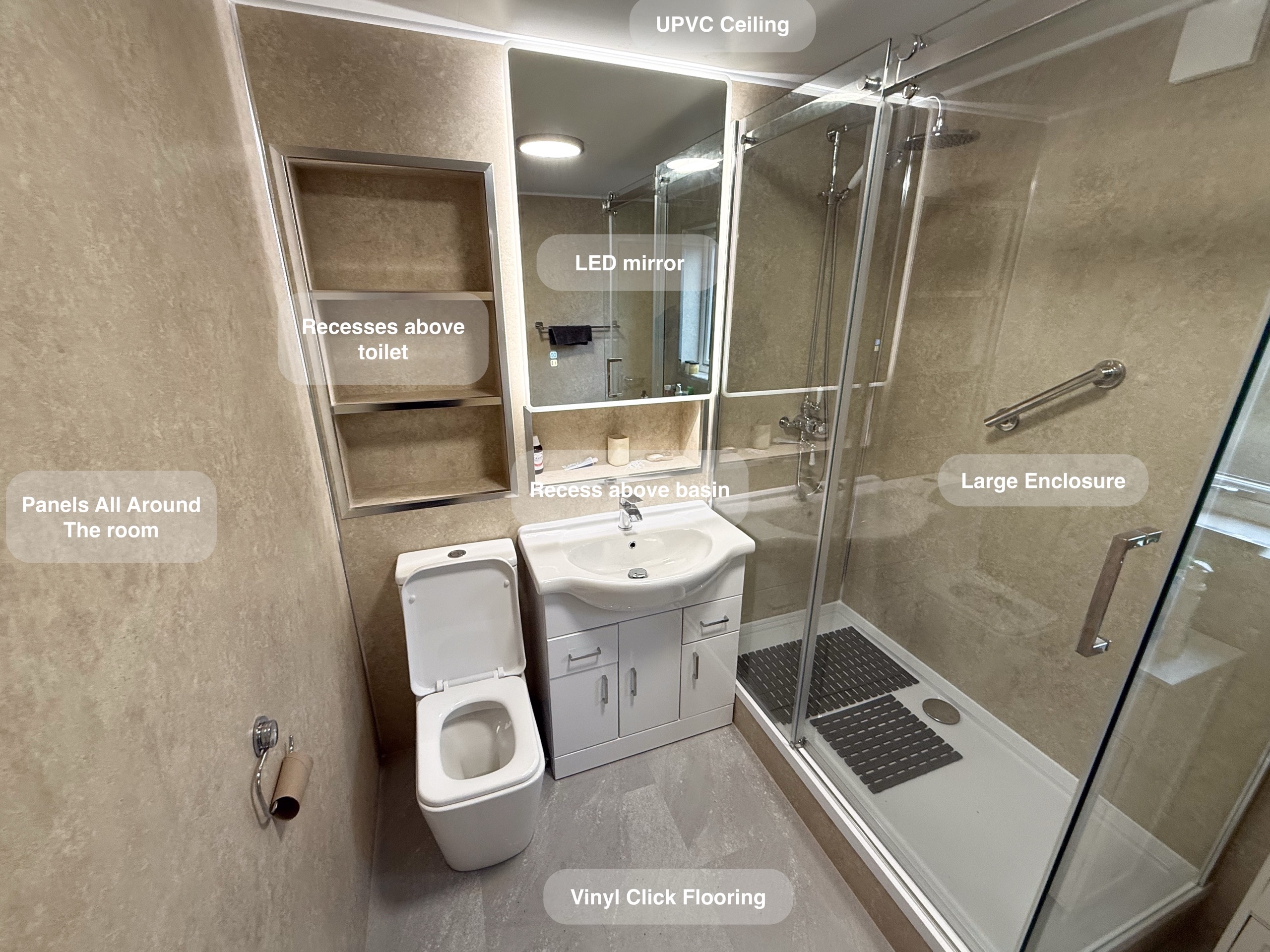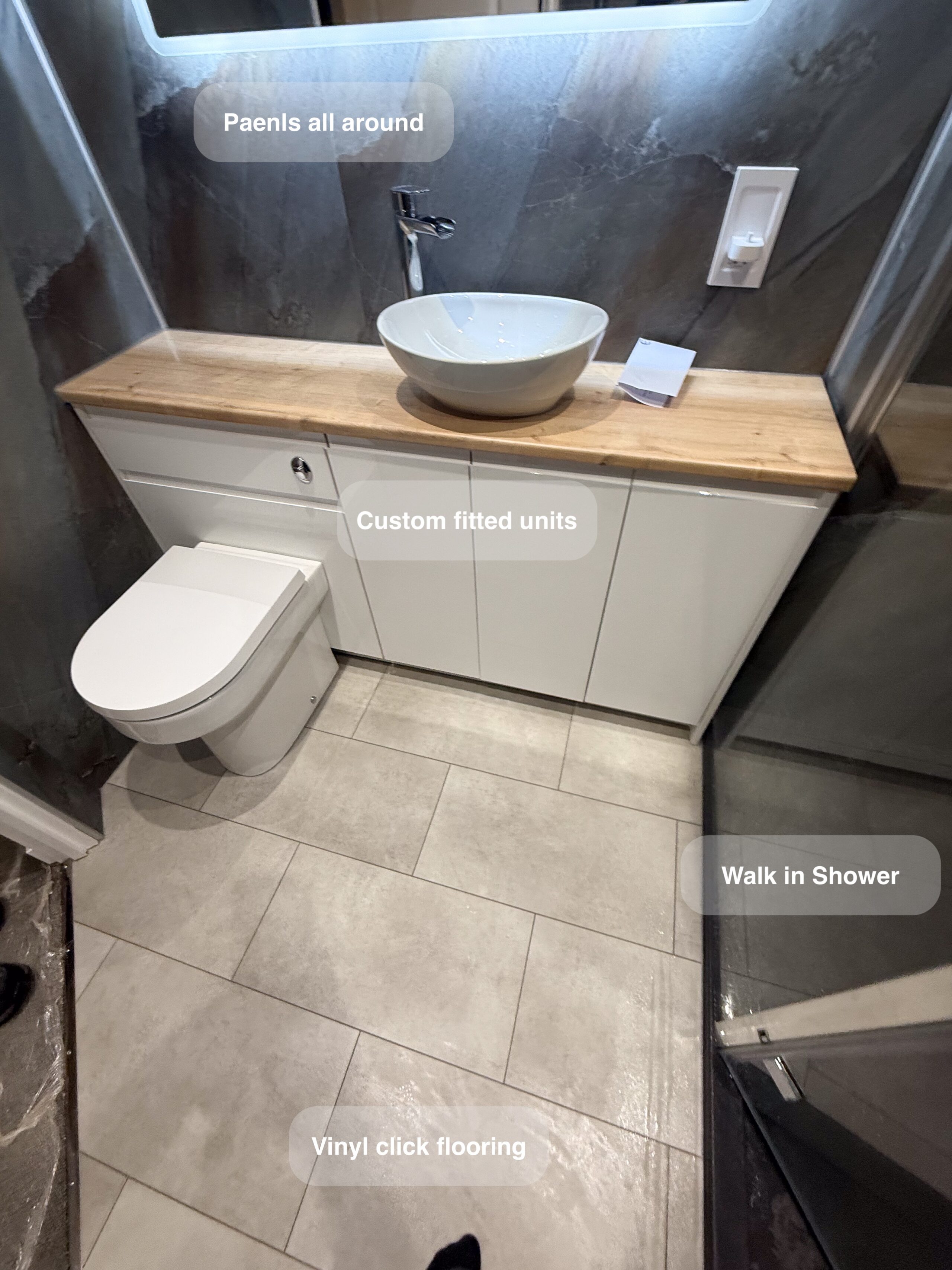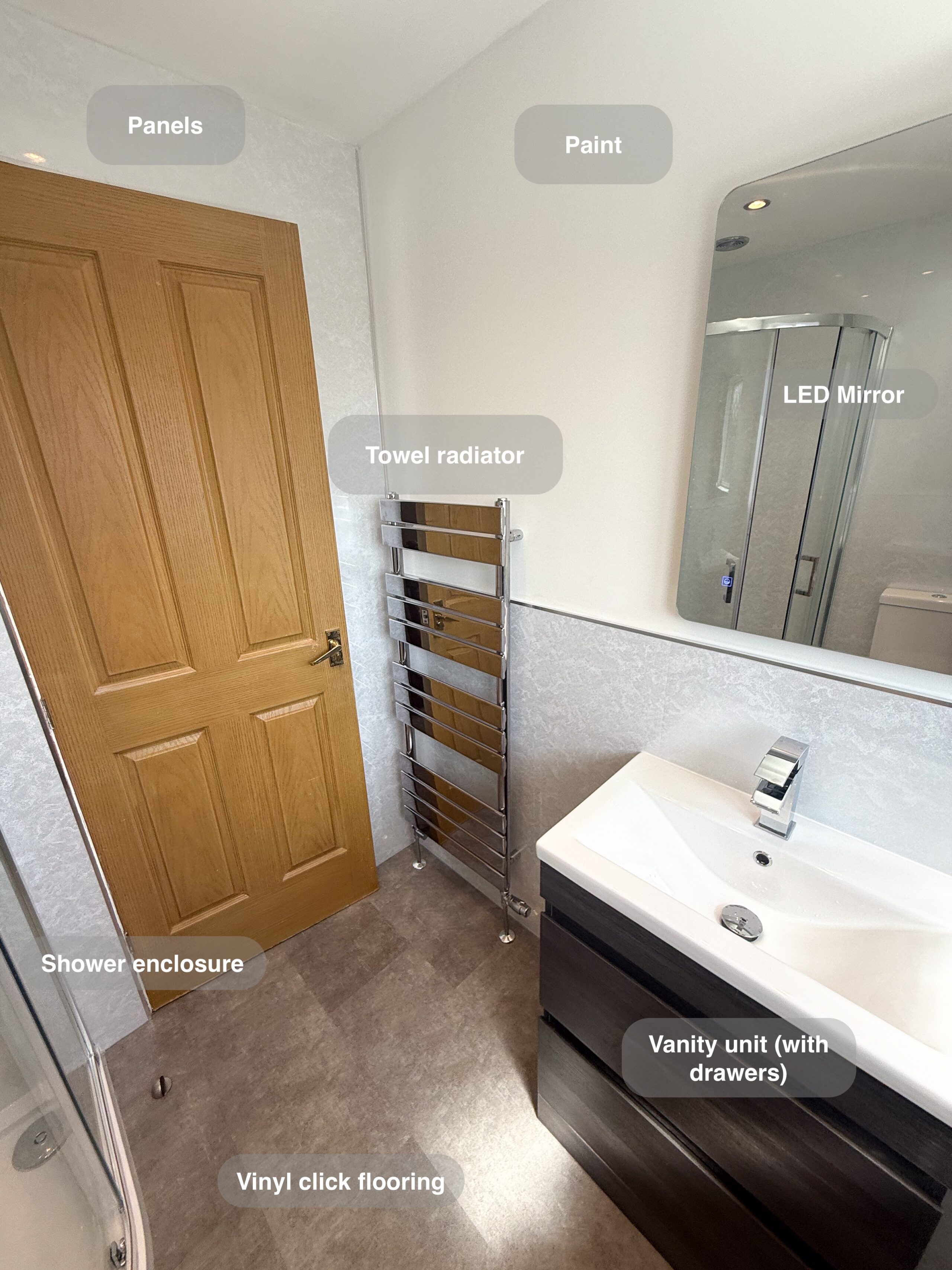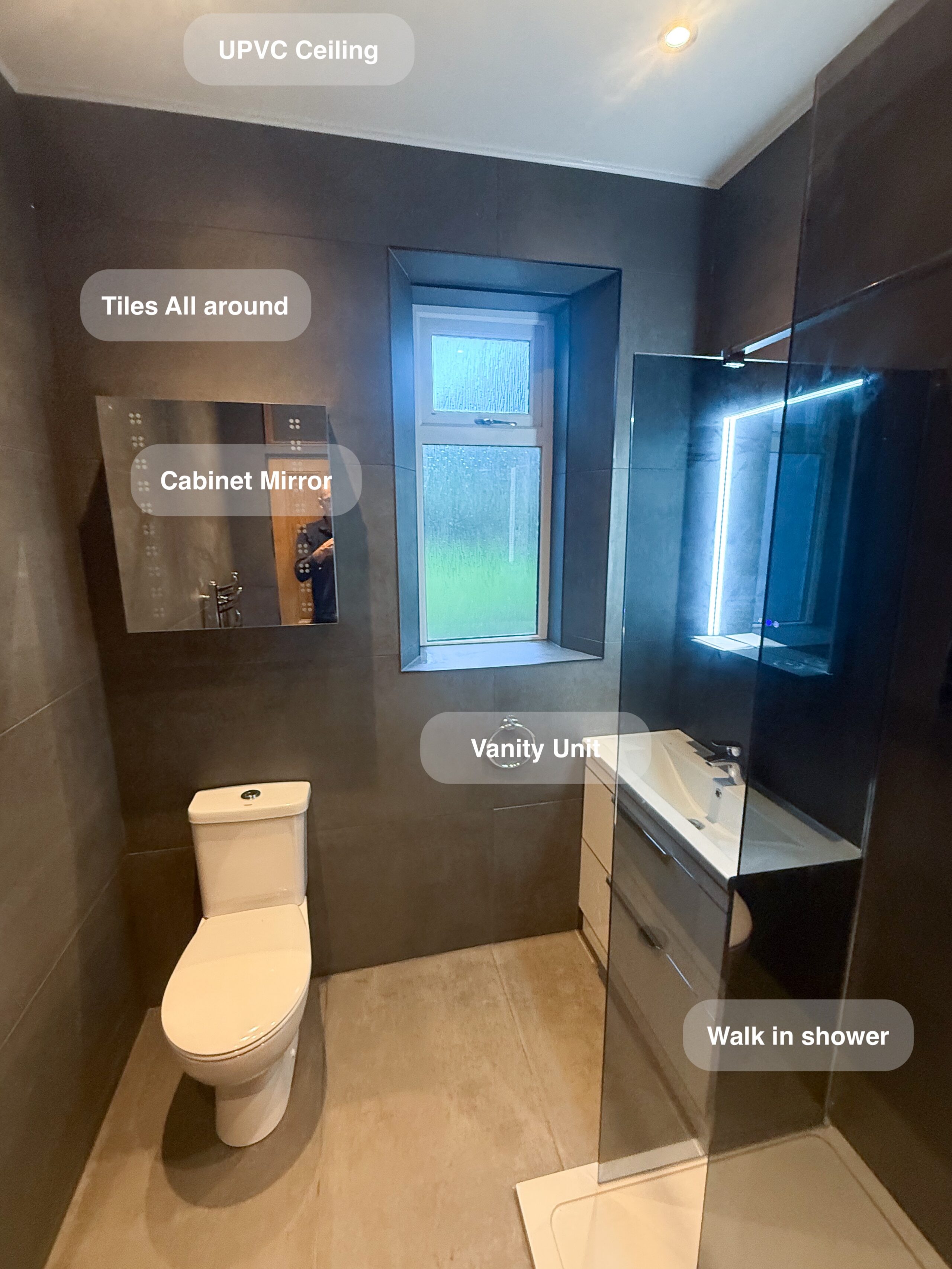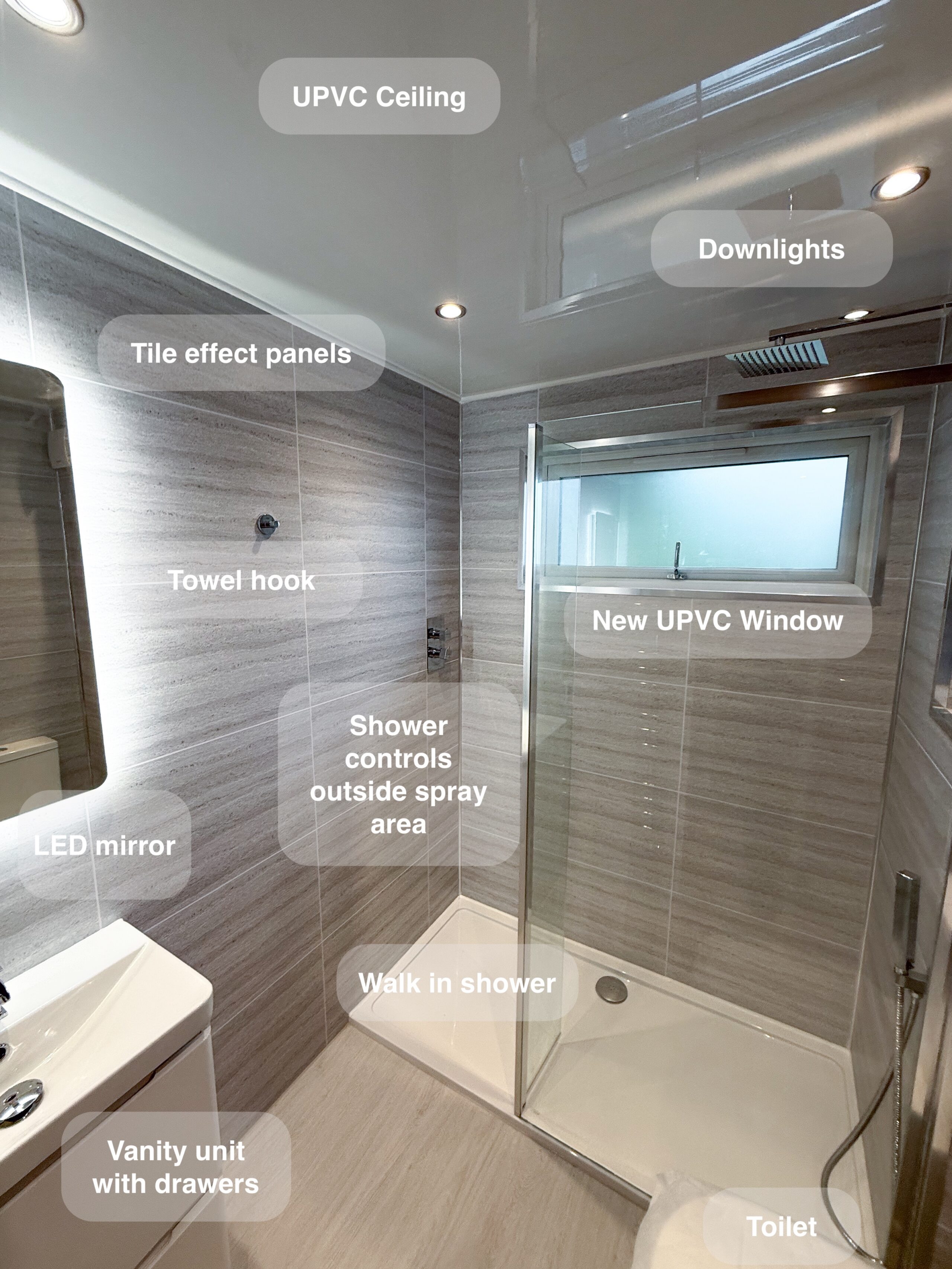 Complete refurbishment transforming the outdated wetroom into a sleek walk-in shower. We reoriented the vanity unit for improved functionality, installed durable solid-core panels throughout the room, laid stylish tiled flooring, and added a low-maintenance UPVC ceiling. The project was finished with a cabinet LED mirror and a second LED mirror positioned above the towel radiator for added convenience and elegance. 3D scan Plan After https://youtu.be/FJDeitzpFJk