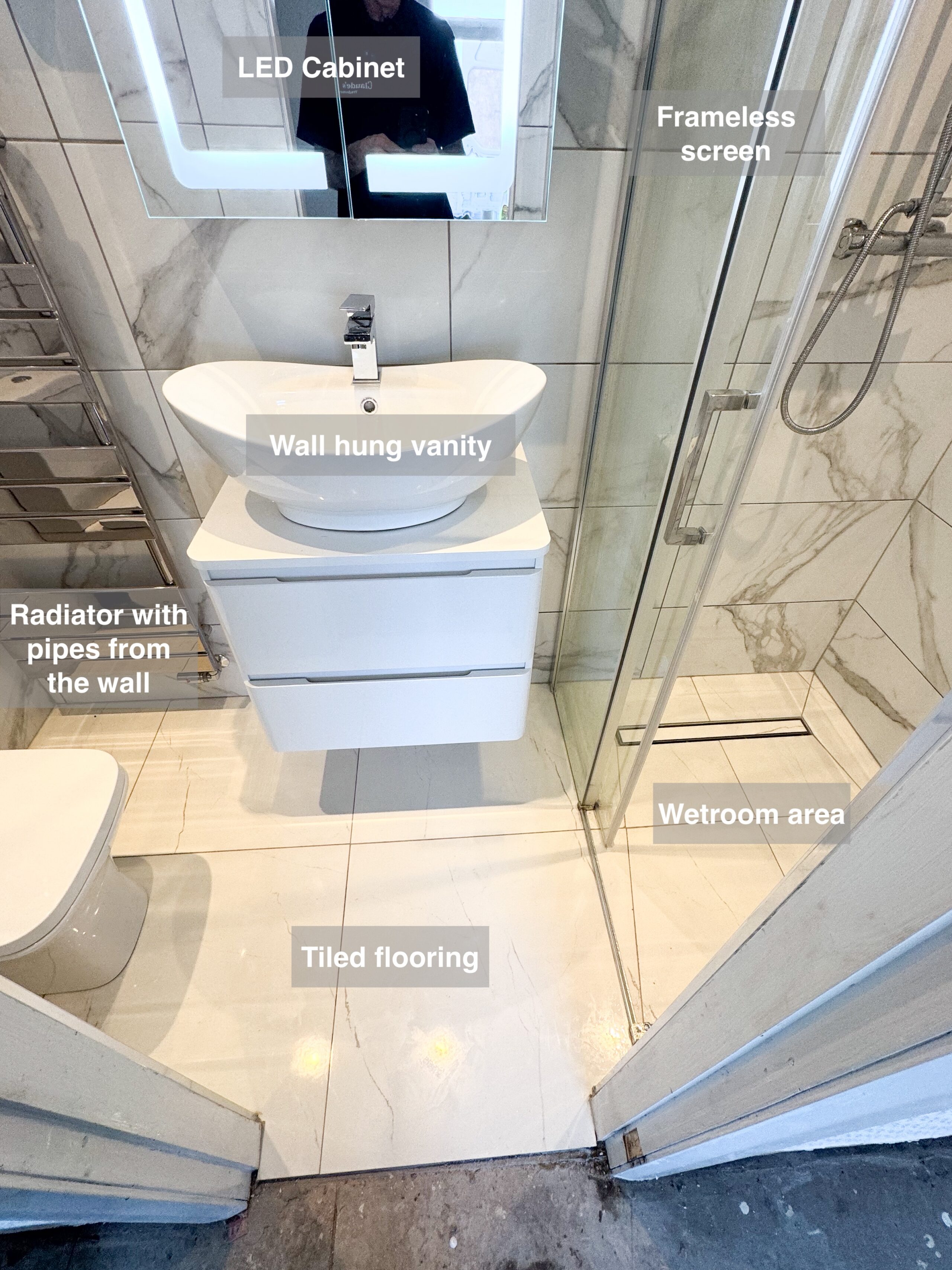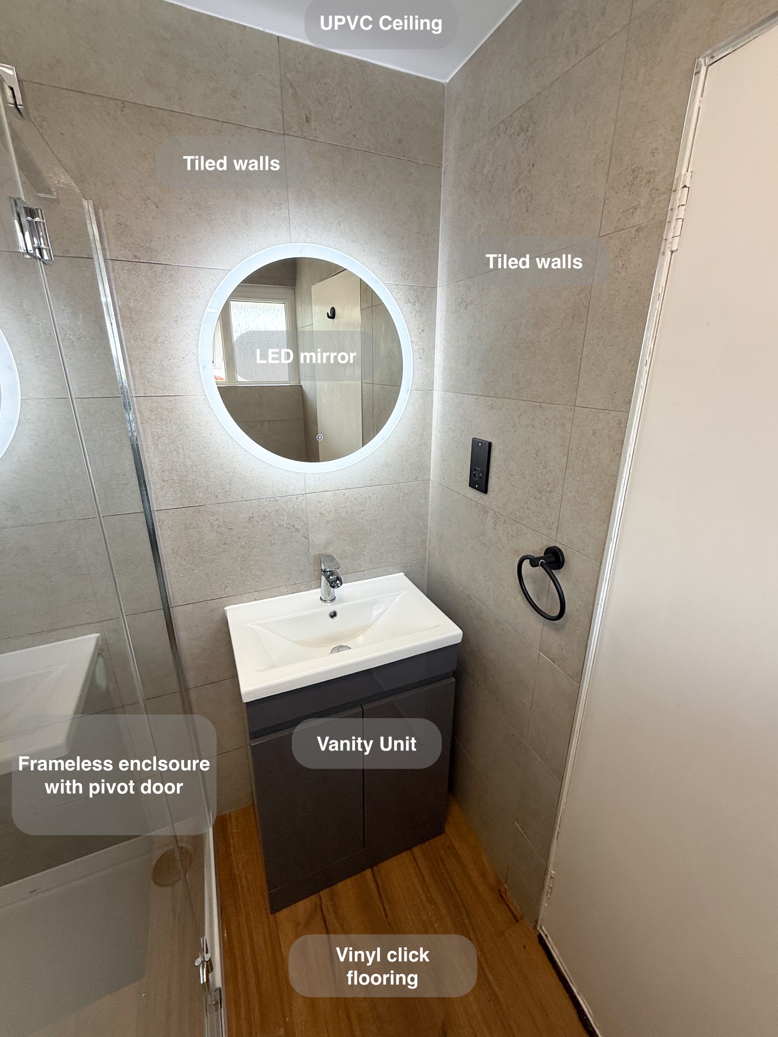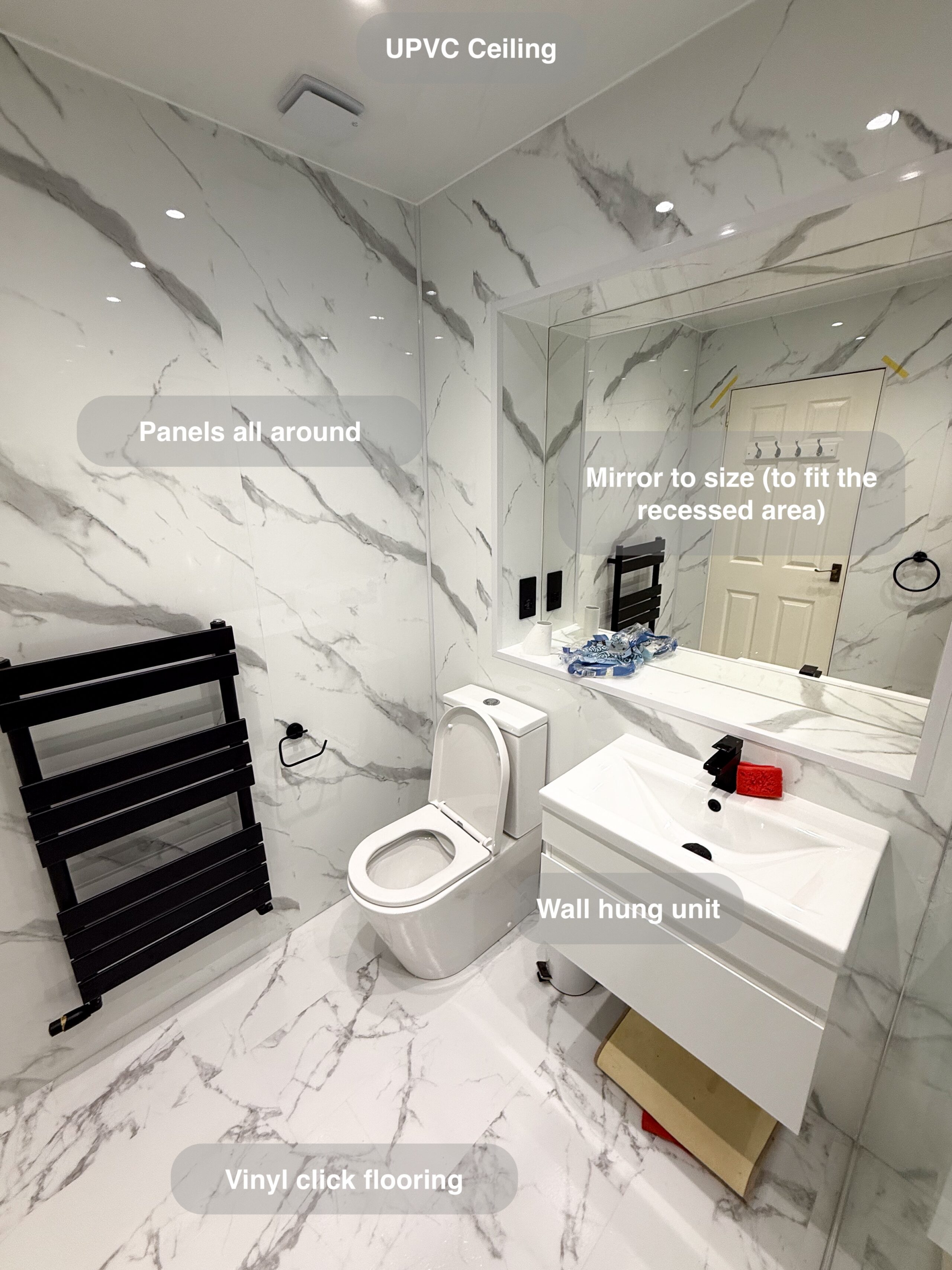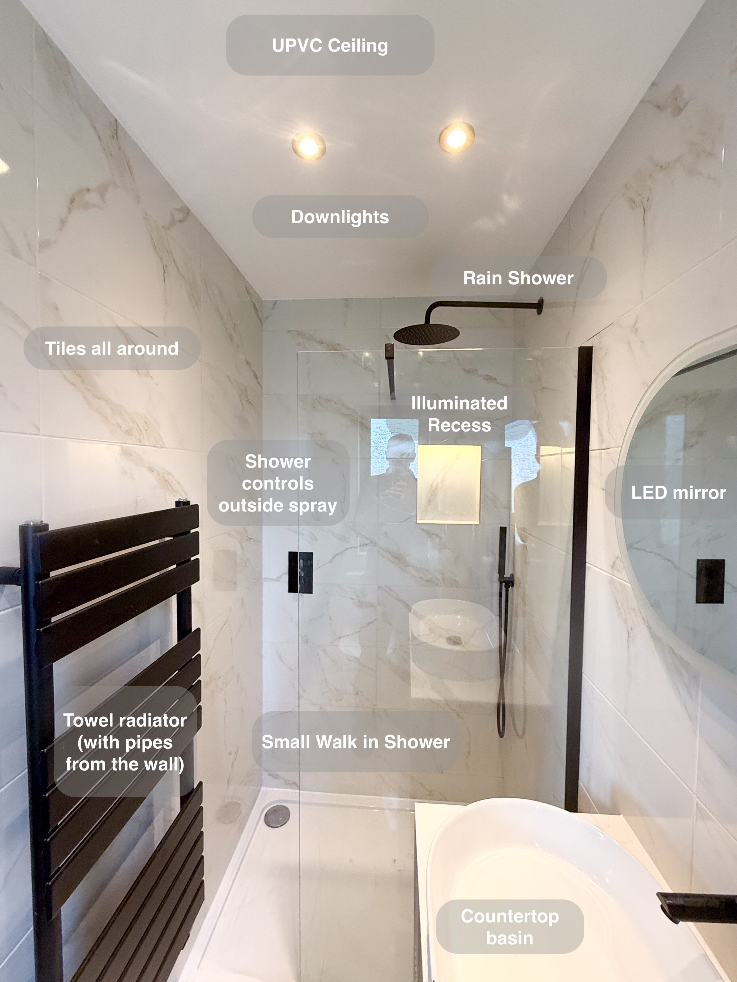 Complete refurbishment transforming the outdated wetroom into a sleek walk-in shower. We reoriented the vanity unit for improved functionality, installed durable solid-core panels throughout the room, laid stylish tiled flooring, and added a low-maintenance UPVC ceiling. The project was finished with a cabinet LED mirror and a second LED mirror positioned above the towel radiator for added convenience and elegance. 3D scan Plan After https://youtu.be/FJDeitzpFJk