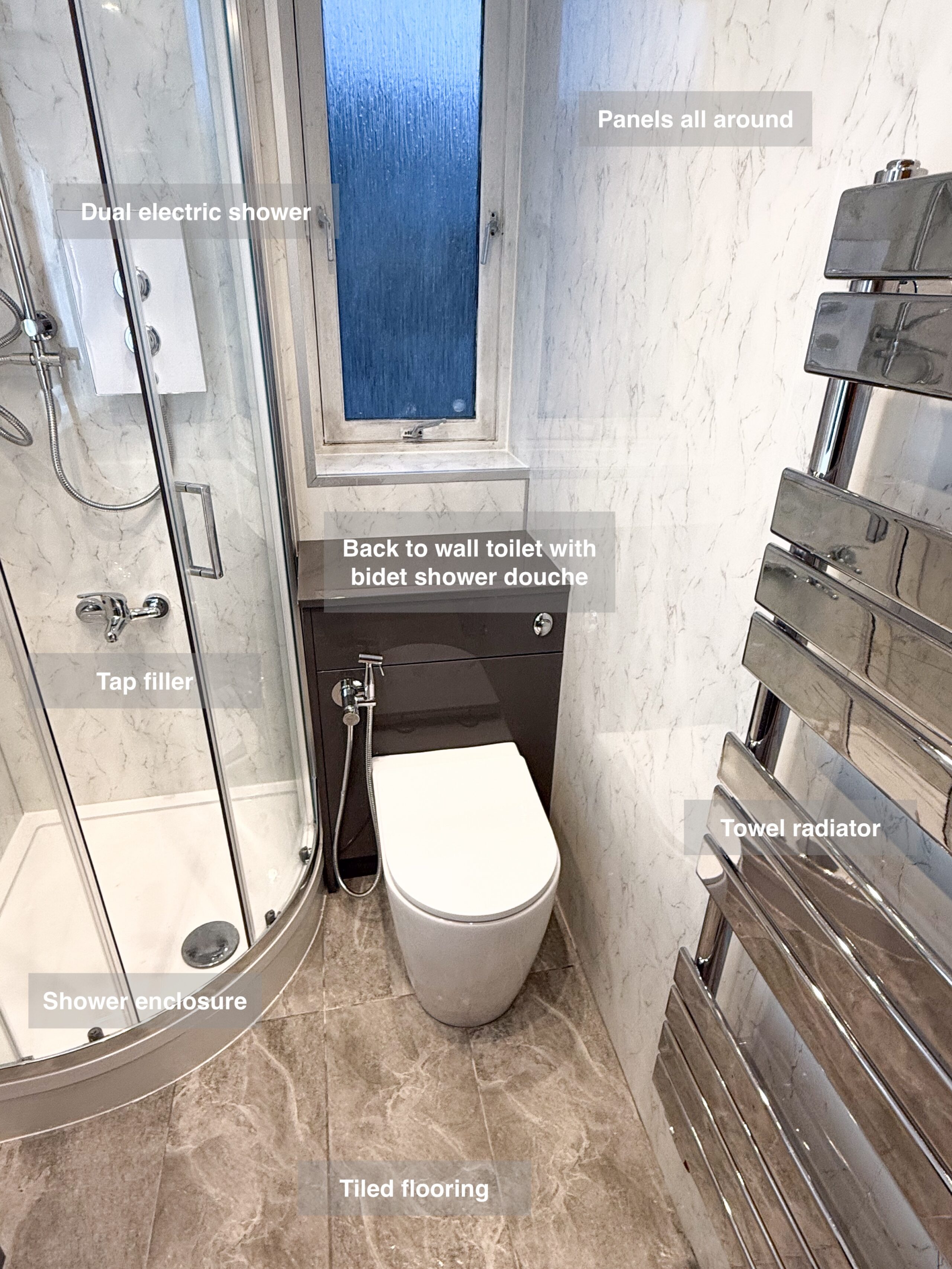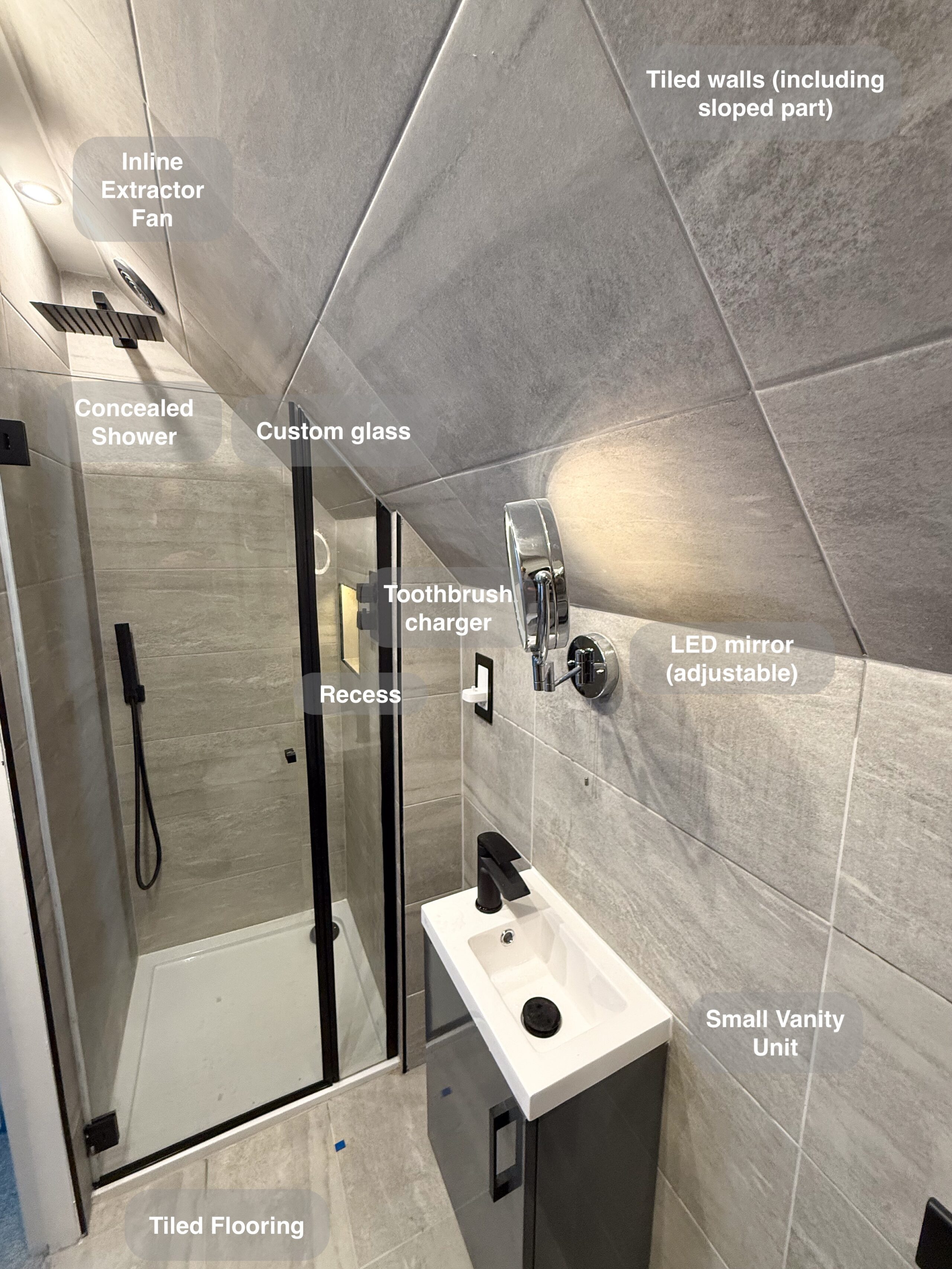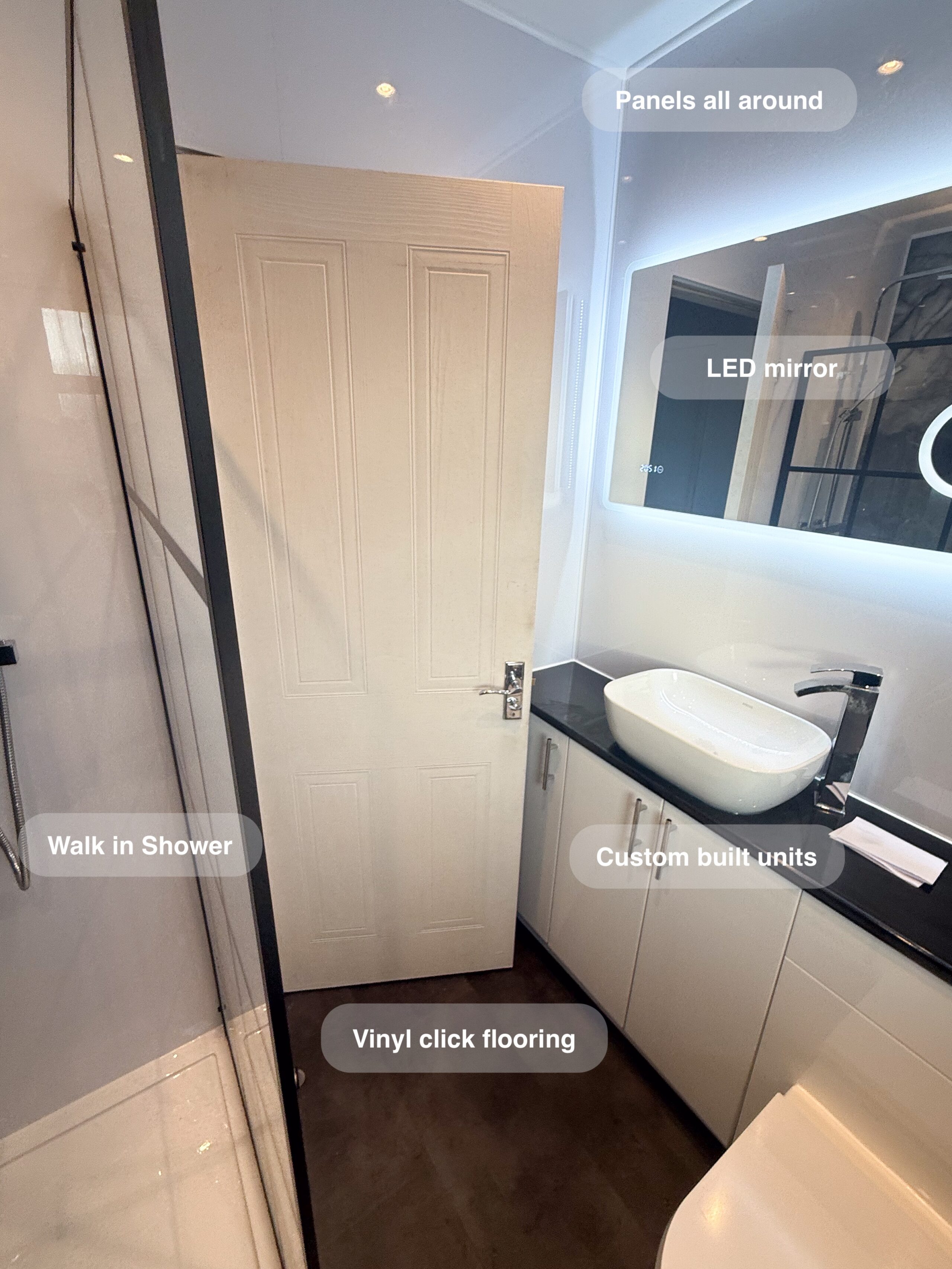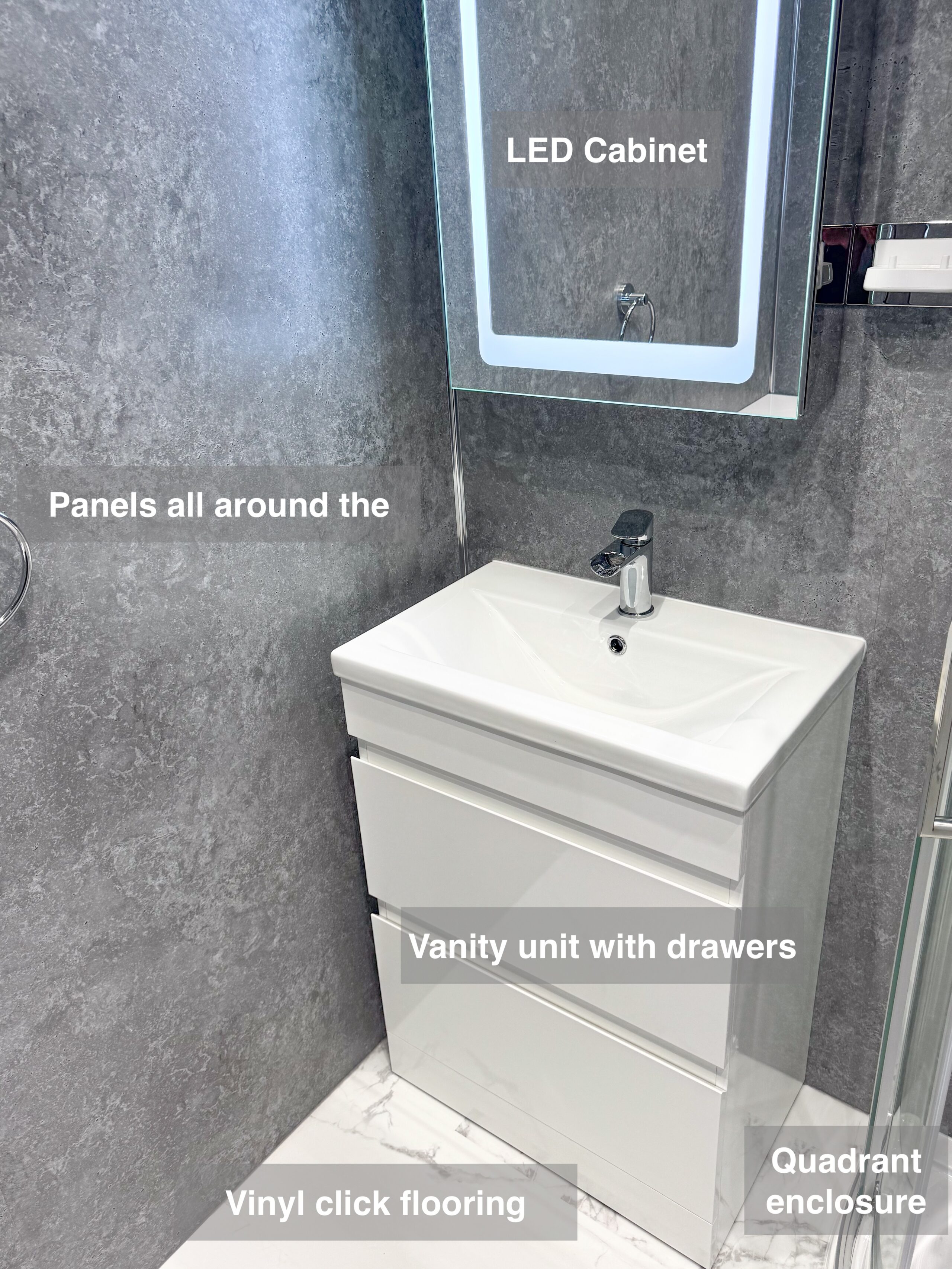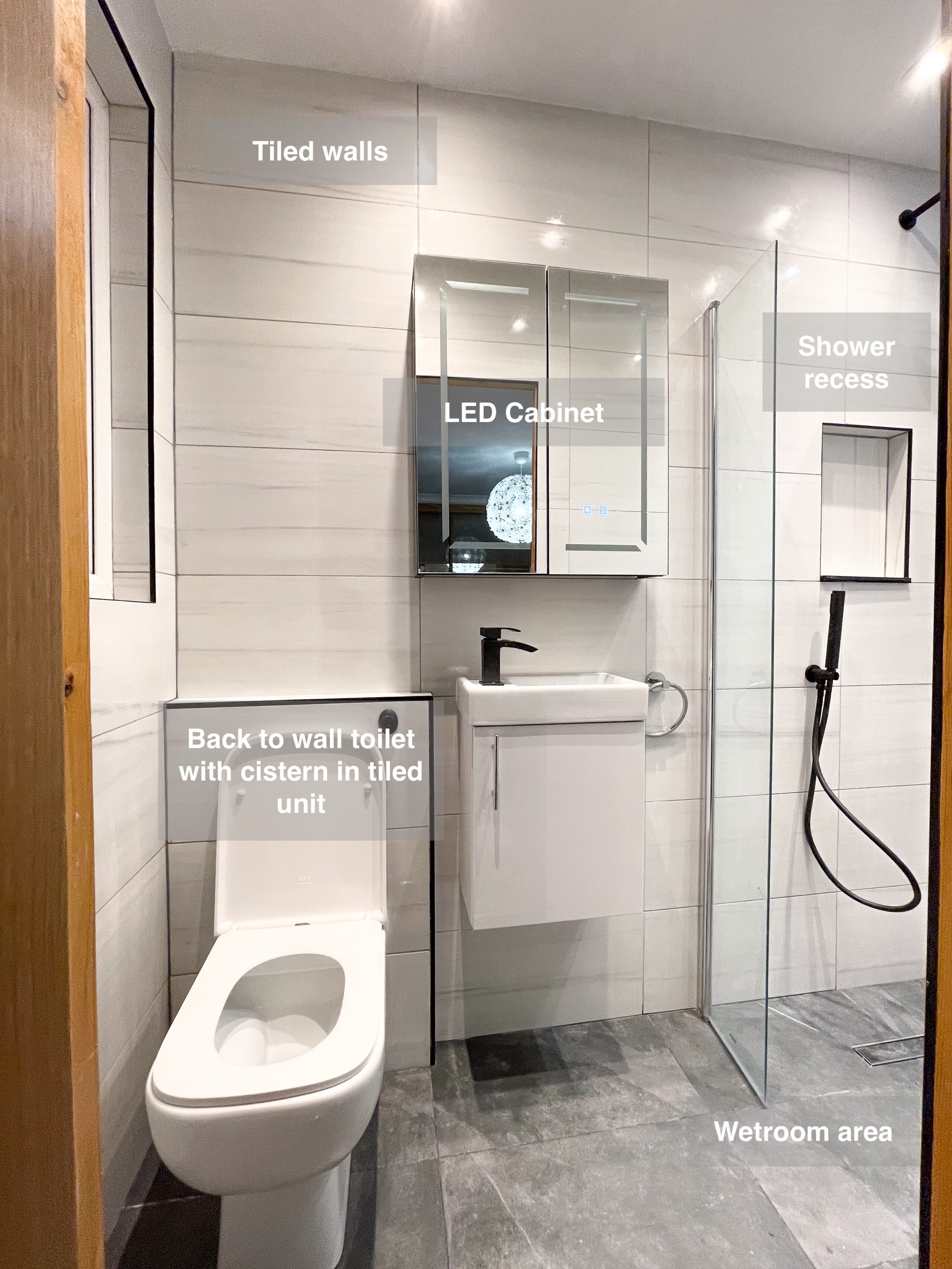Complete refurbishment transforming the outdated wetroom into a sleek walk-in shower. We reoriented the vanity unit for improved functionality, installed durable solid-core panels throughout the room, laid stylish tiled flooring, and added a low-maintenance UPVC ceiling. The project was finished with a cabinet LED mirror and a second LED mirror positioned above the towel radiator for added convenience and elegance. 3D scan Plan After https://youtu.be/FJDeitzpFJk
