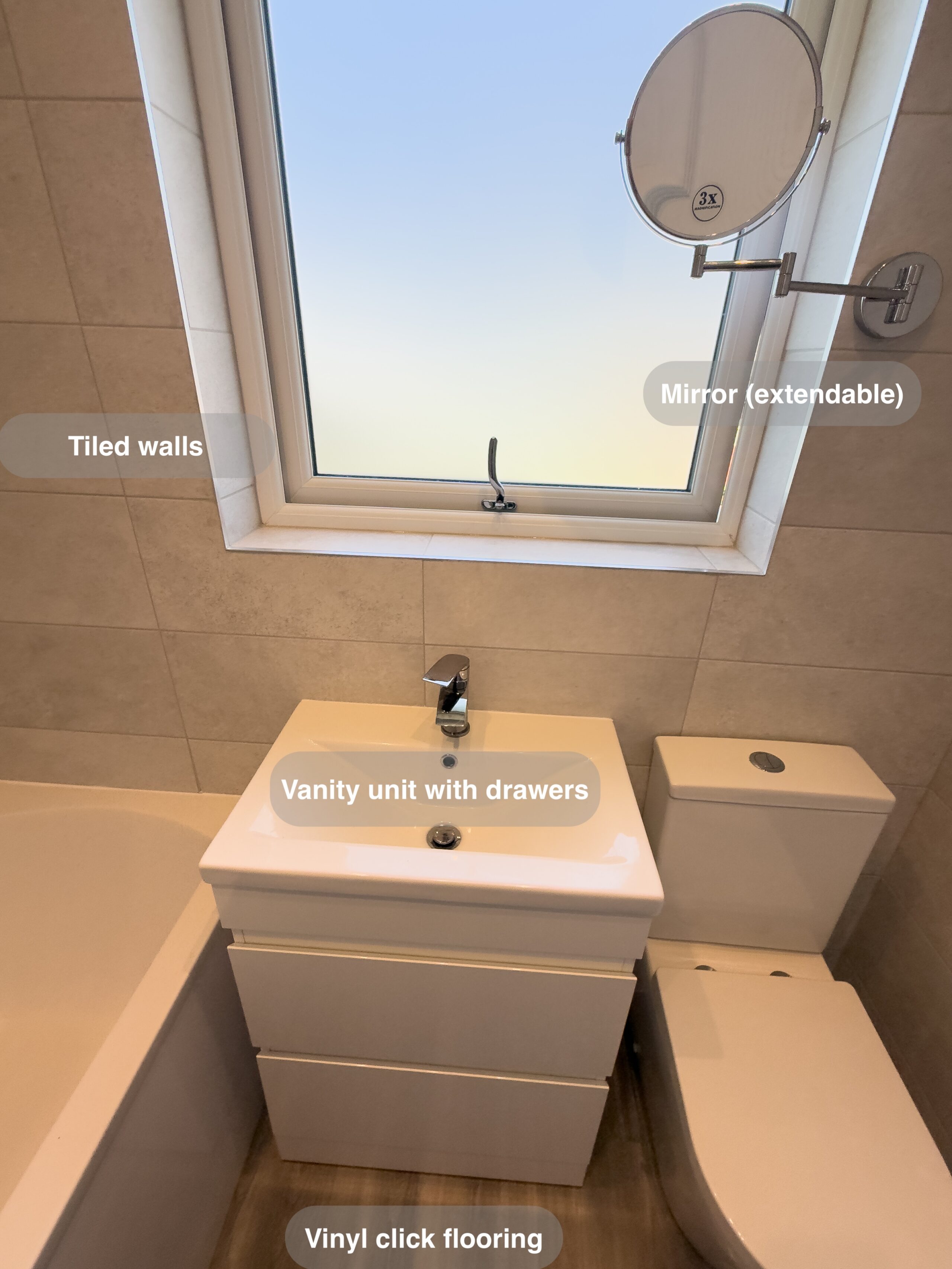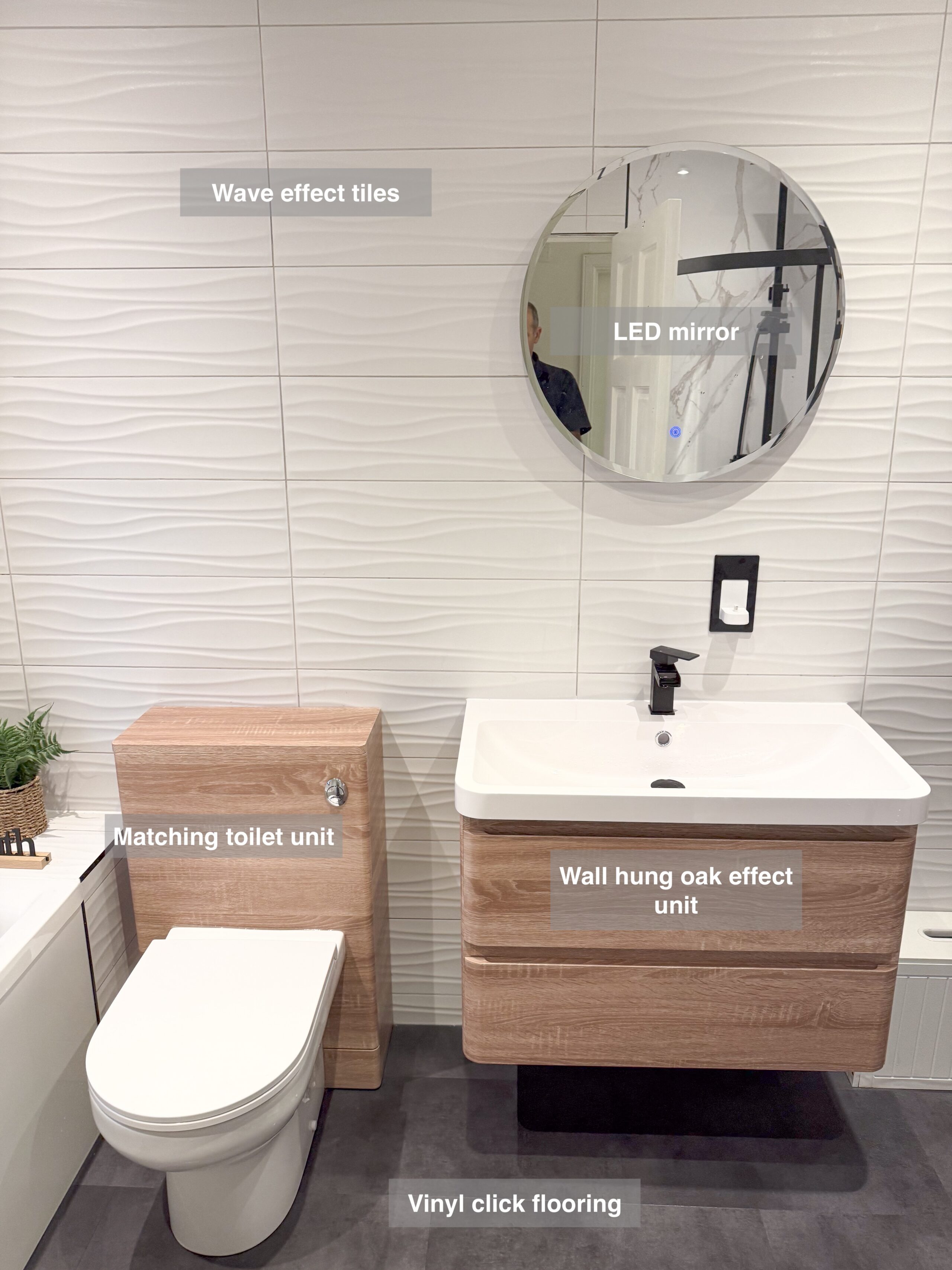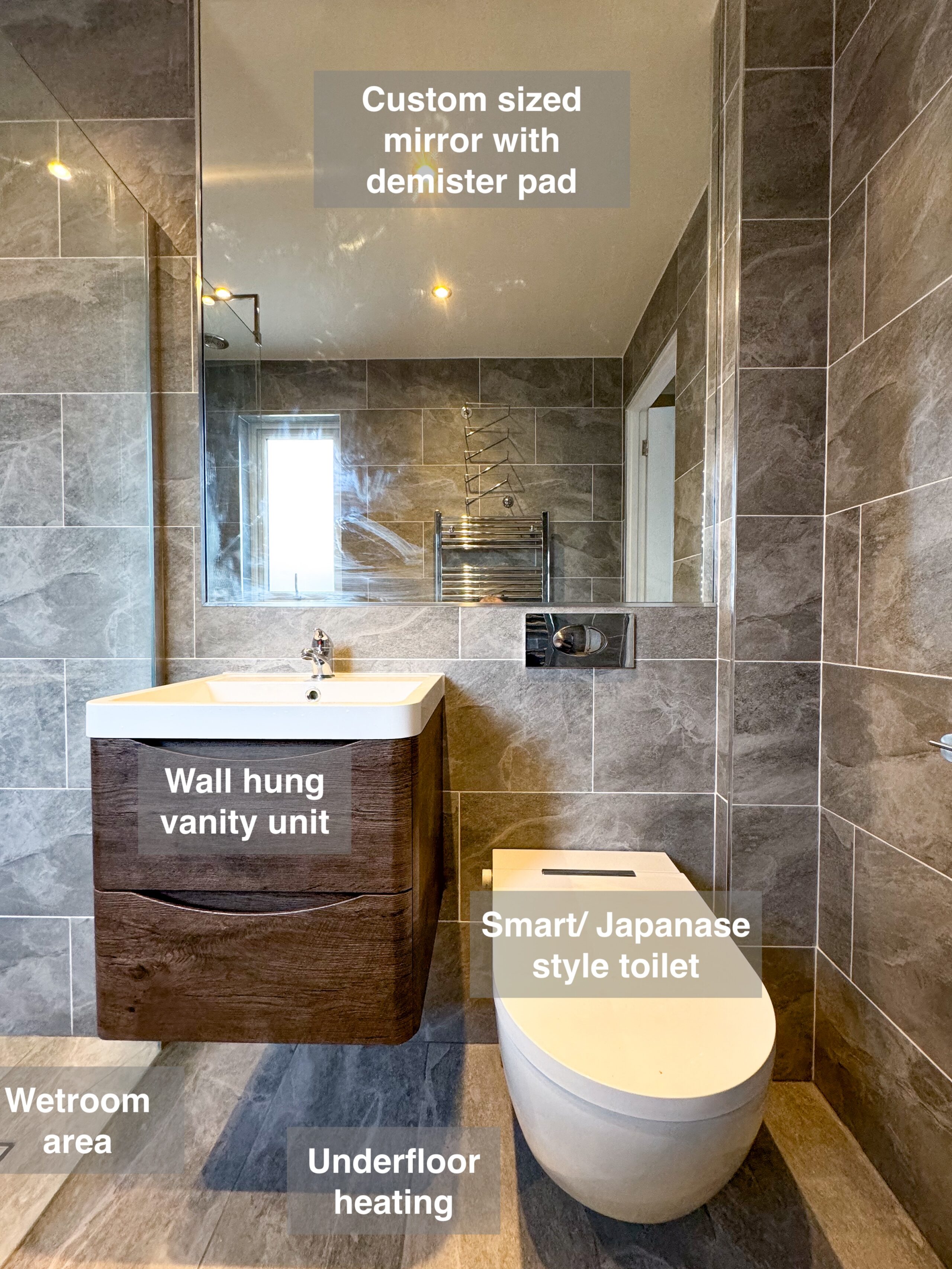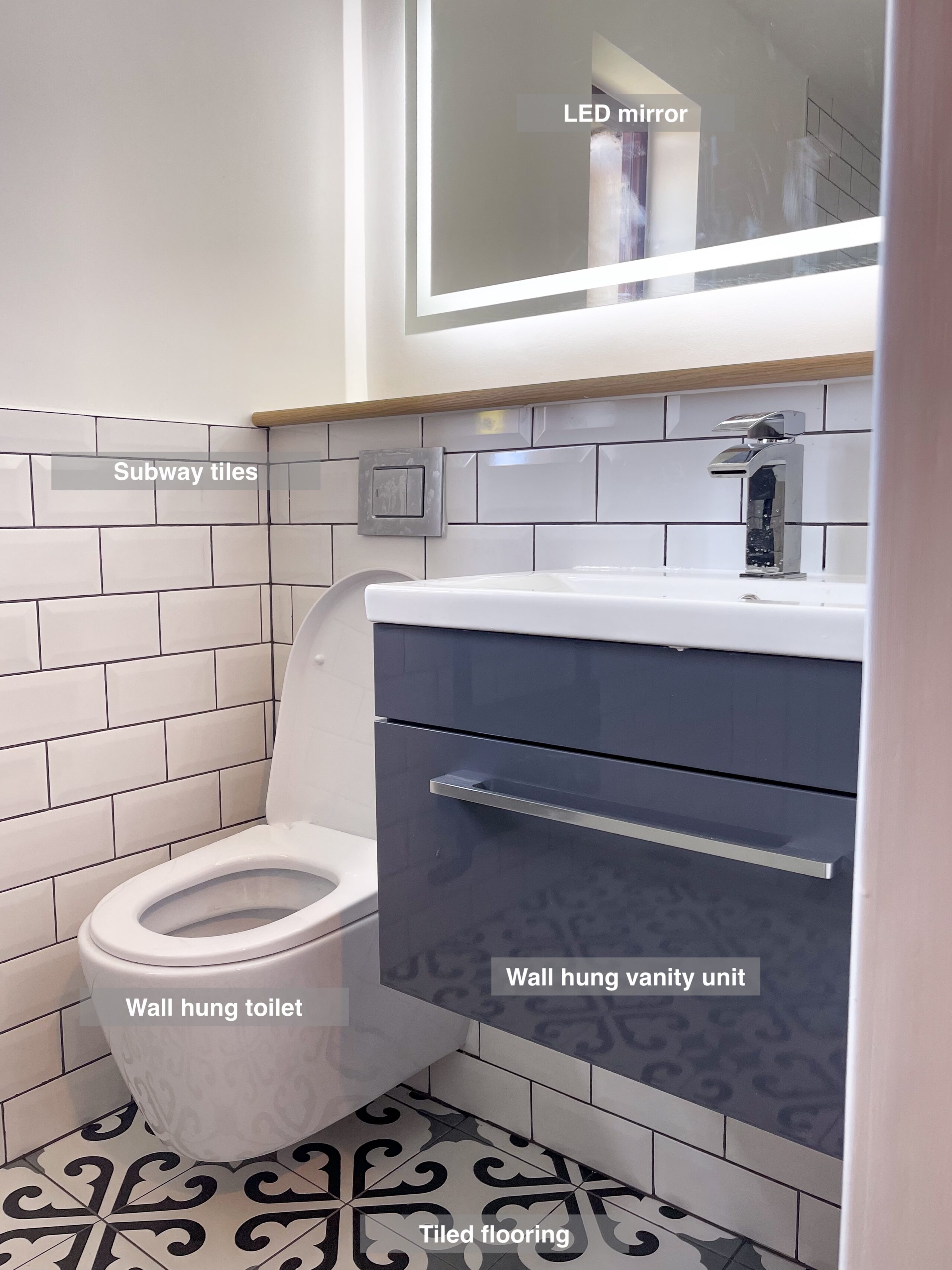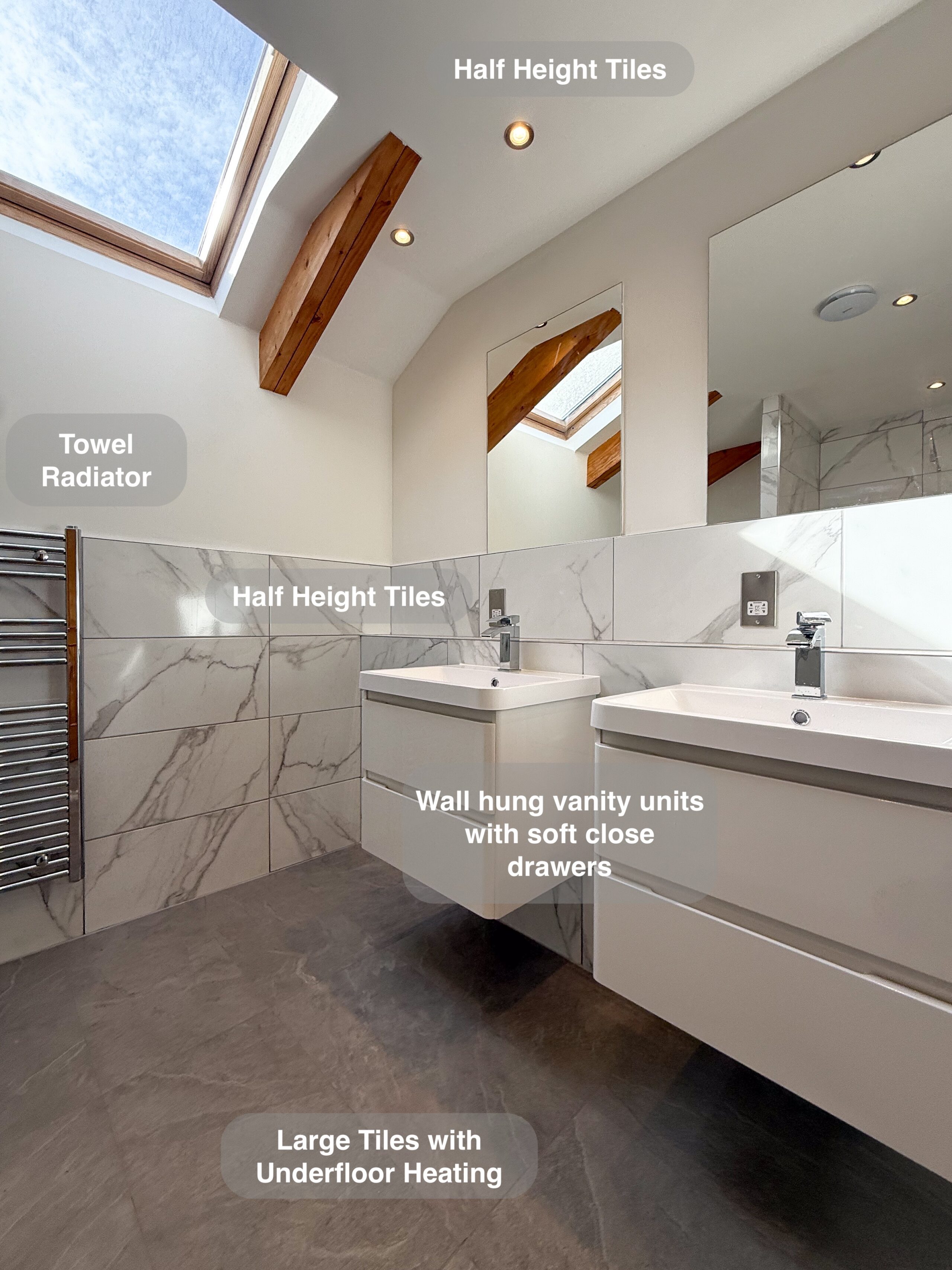 In this bathroom renovation, we addressed both comfort and functionality. The external wall was insulated to enhance warmth and energy efficiency, ensuring a cosy environment. Underfloor heating was installed beneath the vinyl click flooring, giving you a warm and welcoming feel as you step into the bathroom. We fitted an LED mirror (1000×500), perfect for adding a sense of space and featuring a demister function, making it easier to use after a steamy shower. The vanity unit with soft-close drawers provides convenient, easy-access storage for daily essentials like toothbrushes, while the matching wall-hung unit offers extra storage for items such…