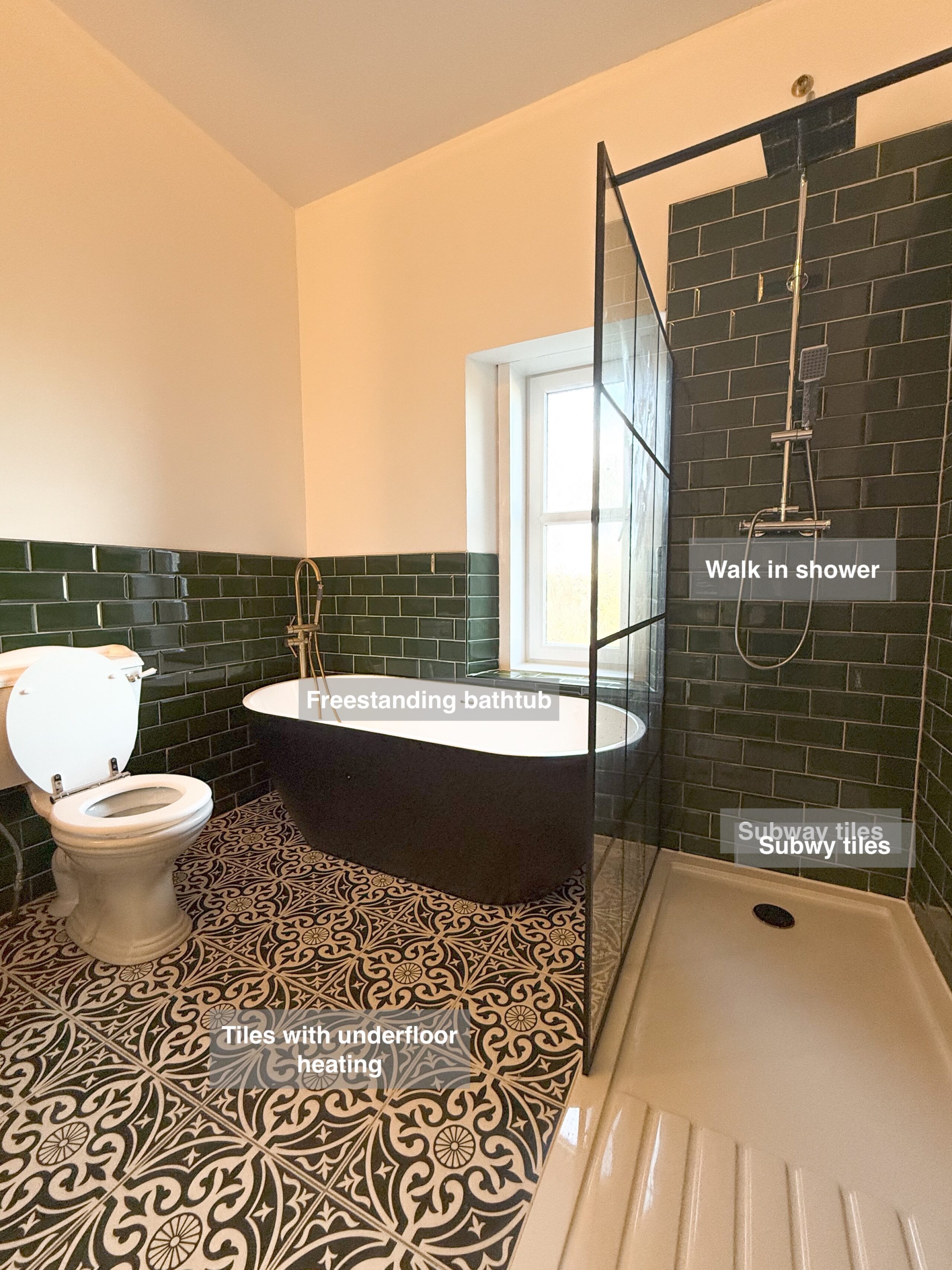This full bathroom refurbishment showcases a seamless blend of modern design with traditional charm, transforming the space into a stylish and functional sanctuary. Key traditional elements include a classic-style toilet, timeless subway tiles, and intricately patterned floor tiles that add character and warmth to the room. The layout was reimagined to enhance both aesthetics and practicality. The bathtub, previously positioned elsewhere, was relocated in front of the window, creating a striking centerpiece with a freestanding bathtub featuring a sleek black exterior. The shower area was also upgraded to a luxurious, oversized walk-in shower, providing both convenience and a touch of…