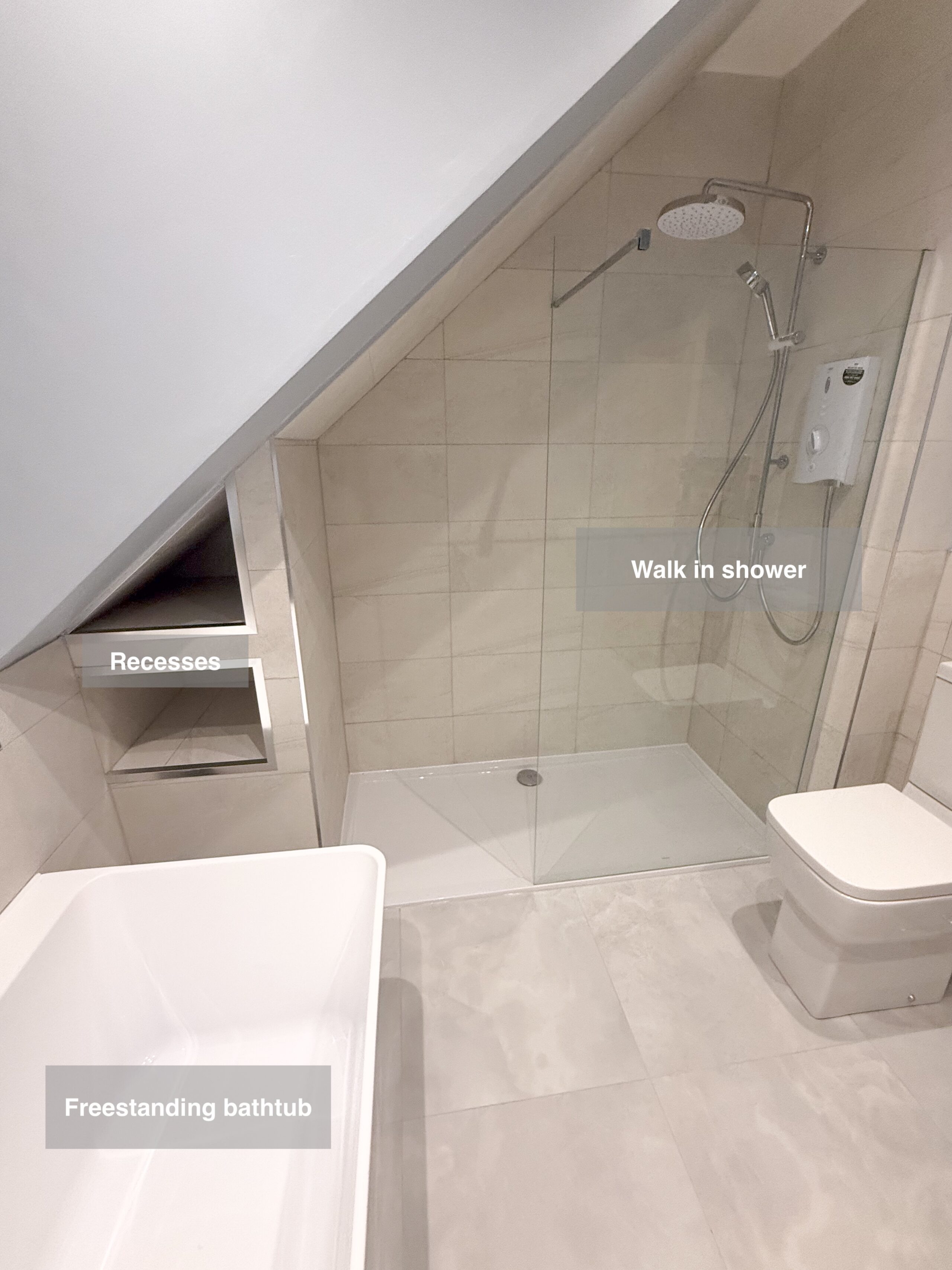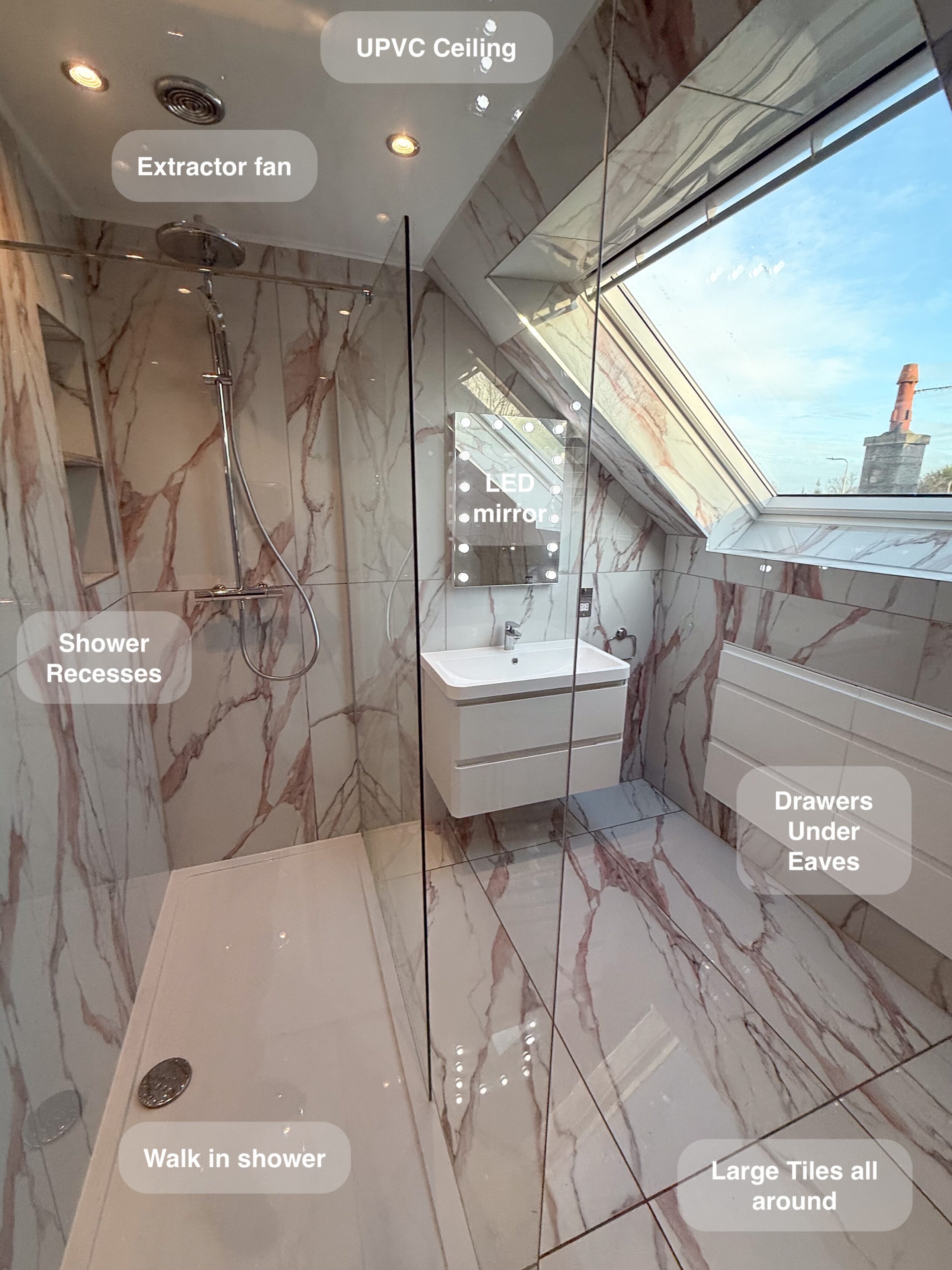 A leaking bathroom became the turning point for this customer, giving them the opportunity to create a space that’s far more practical and enjoyable to use day to day. Storage was a key priority, so we made full use of the space under the eaves by fitting two large 600 mm drawer units. This provides generous, easy-to-access storage and helps keep the bathroom clutter-free and calm. The oversized walk-in shower (1800 × 800) with a 1200 mm glass panel makes showering feel open, comfortable and effortless to maintain. Two built-in recesses keep toiletries neatly out of sight, while still within…