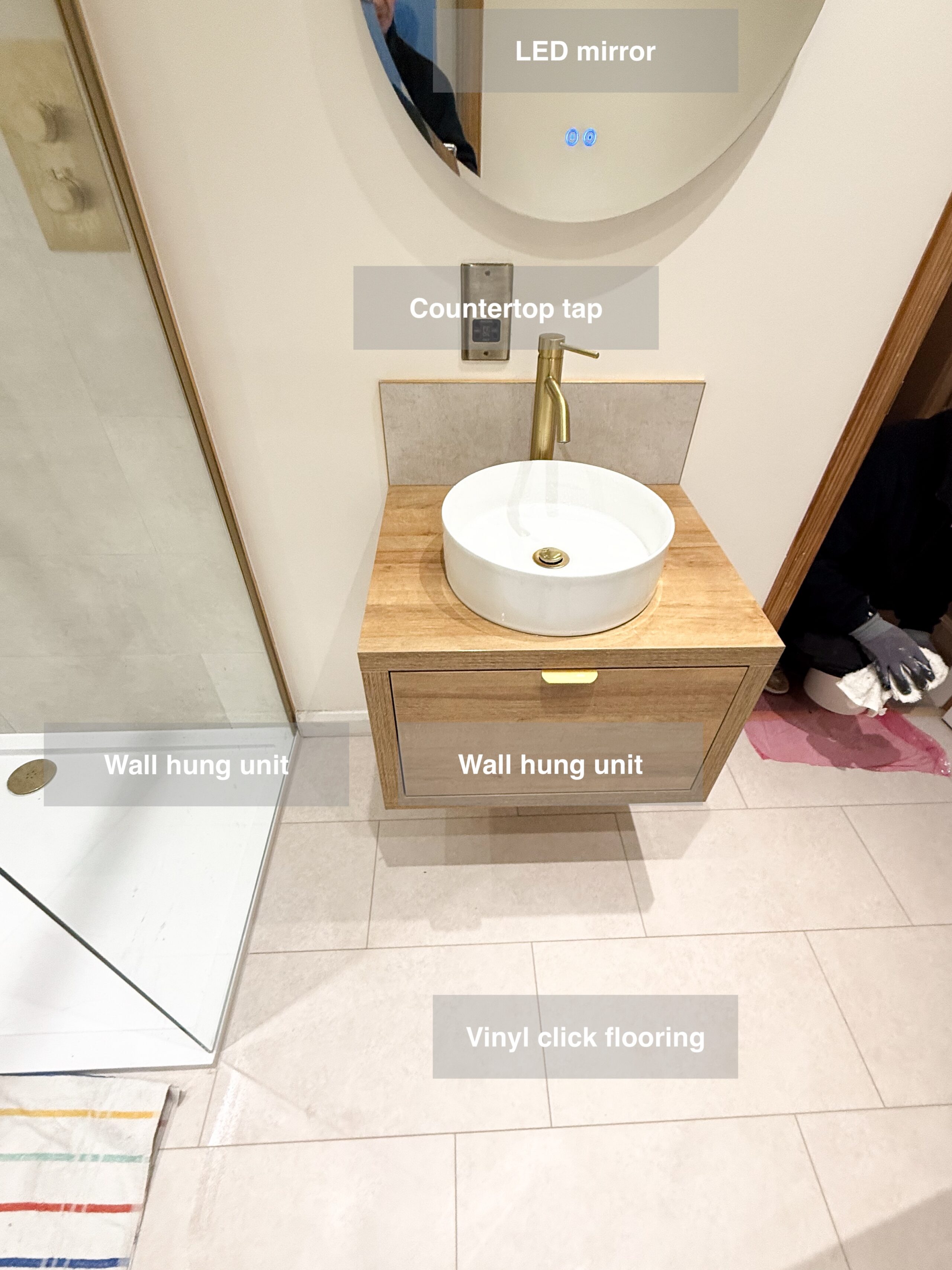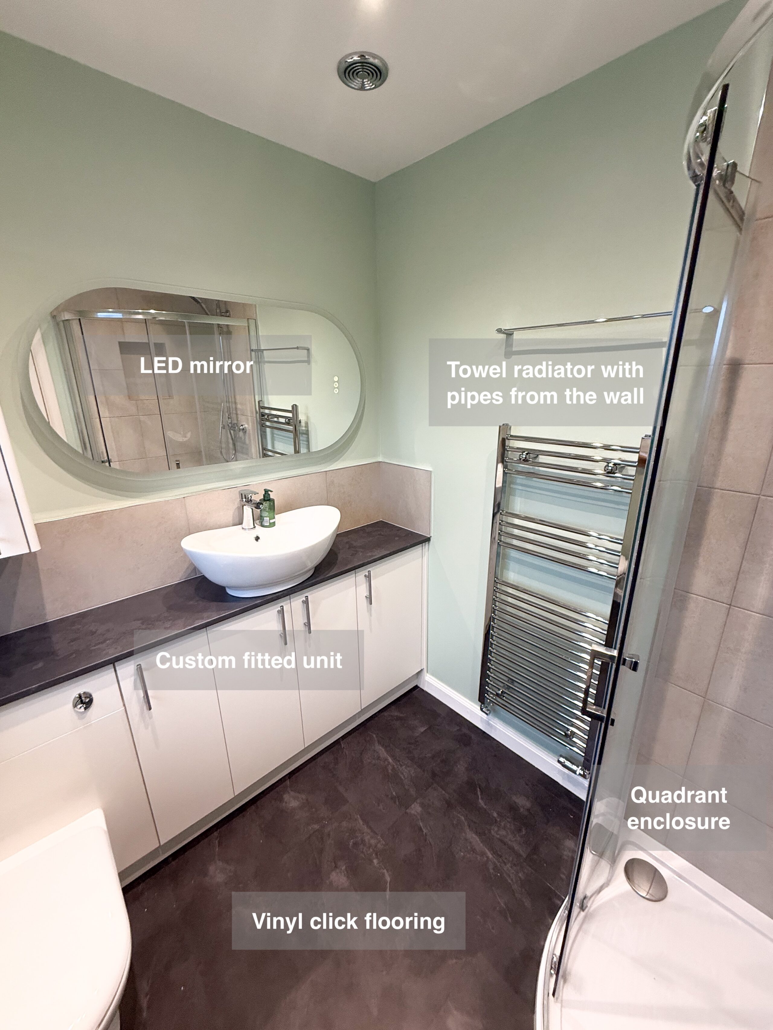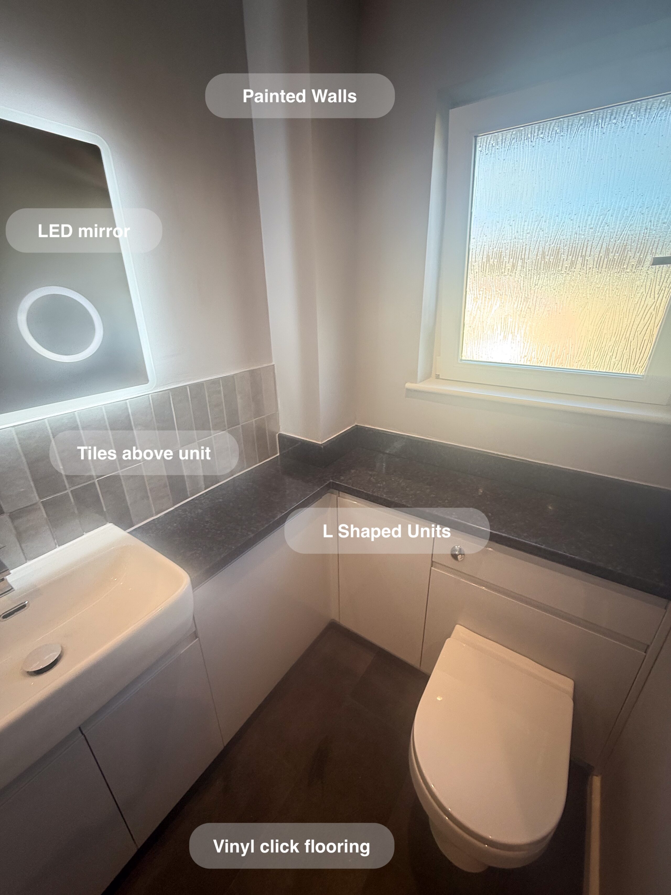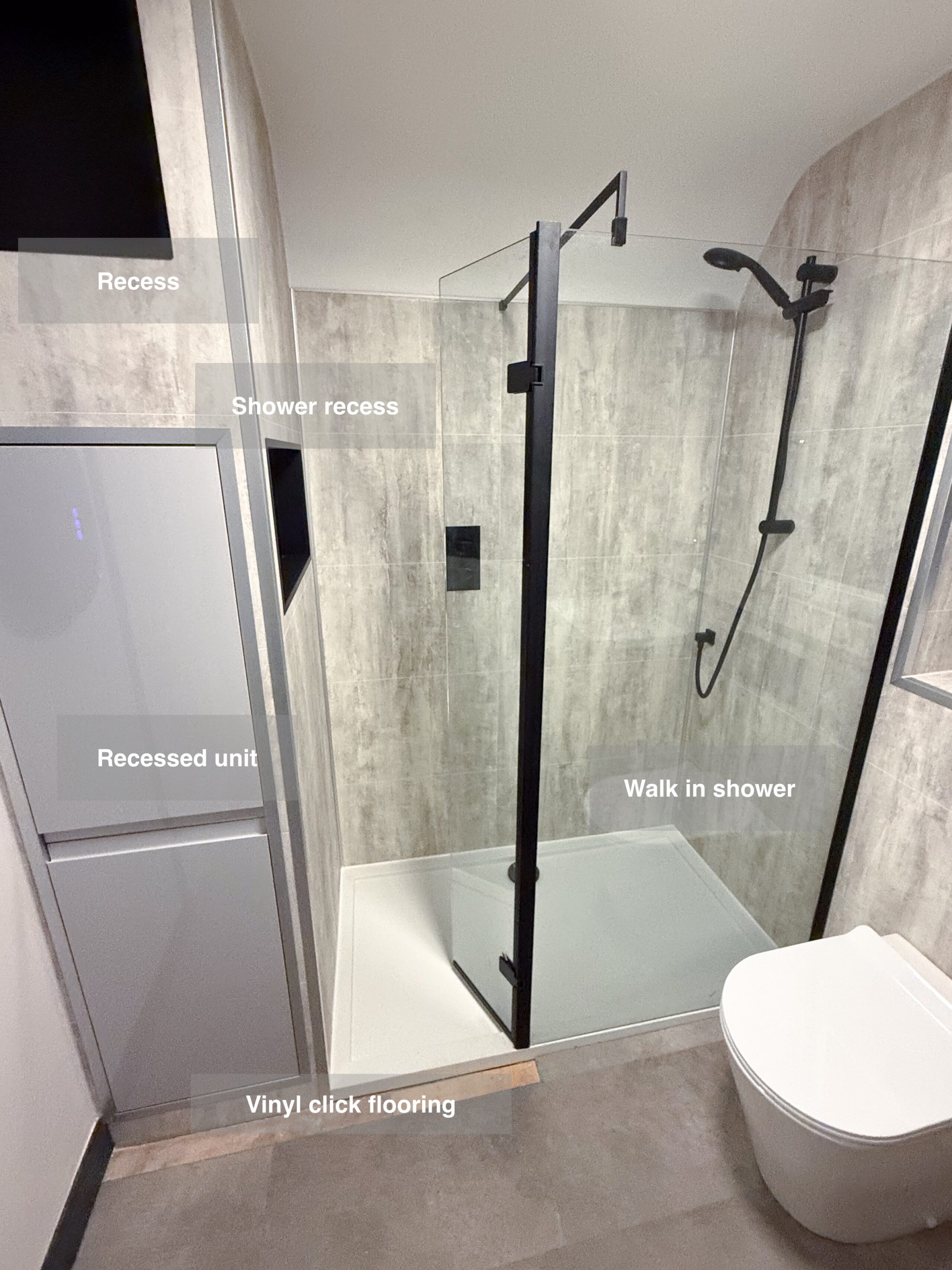 A full bathroom redesign where we installed a sleek shower enclosure, repositioned the shower door for better access, and fitted stylish units along the toilet wall. The transformation also includes a modern LED mirror, a wall-hung vanity unit with a countertop basin, and durable vinyl click flooring. We added a practical shower recess for extra storage, refreshed the space with a fresh coat of paint, and installed a thermostatic shower for precise temperature control. To complete the look, we fitted a contemporary towel radiator with neatly concealed pipework for a clean finish. Scan of the old room Plan https://youtube.com/shorts/9qunNL7sdIQ