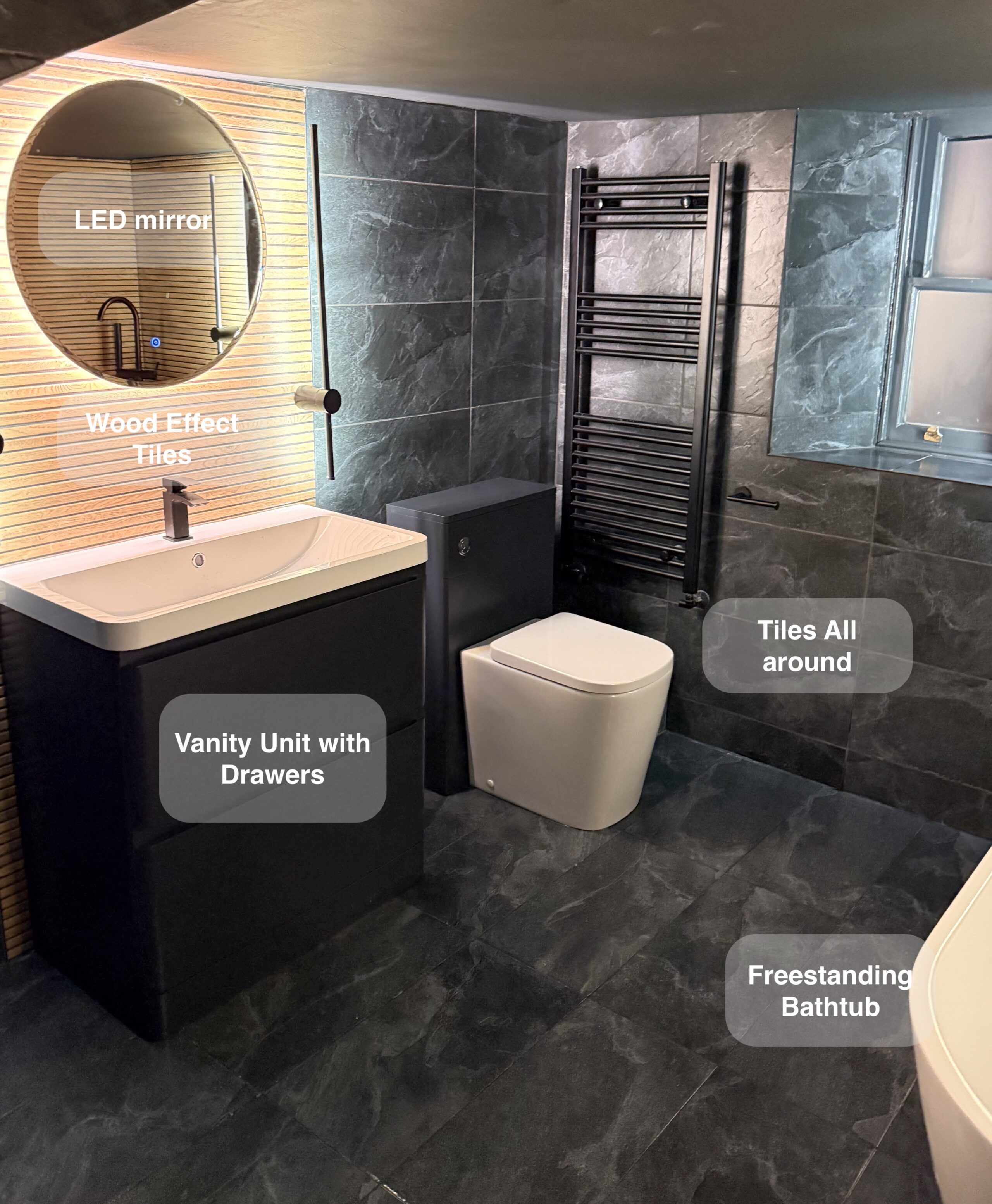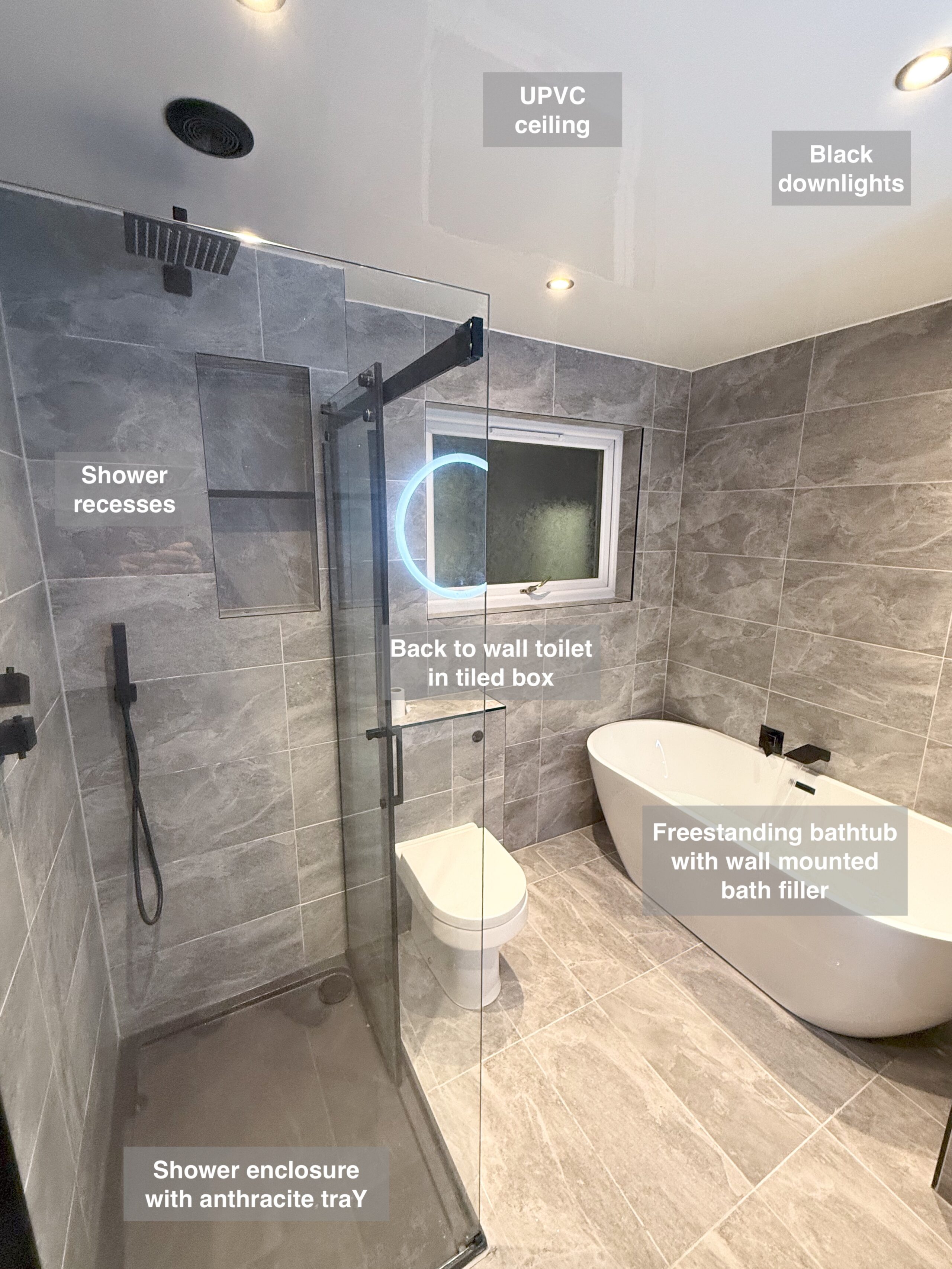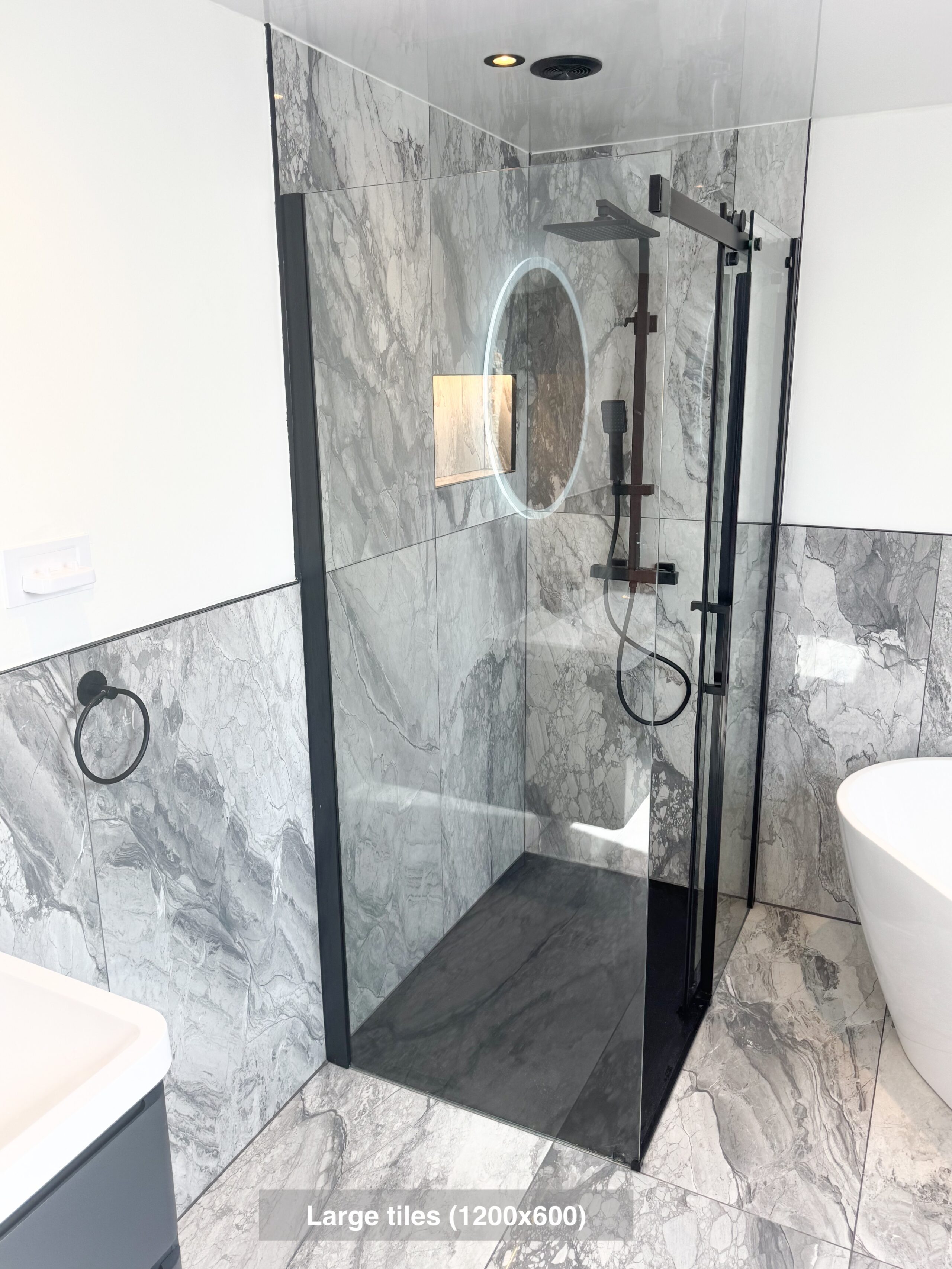 In this full bathroom refurbishment, we transformed the space by replacing the bathtub with a modern shower enclosure, perfect for those seeking convenience and ease of access. We used elegant grey tiles throughout, finished with durable epoxy grout for a stylish yet easy-to-clean surface that maintains its look for years to come. An LED mirror adds a touch of luxury, while the large black towel radiator (measuring 1800×600) ensures towels are warm and dry, enhancing comfort after every shower. We installed downlights for bright, evenly distributed lighting, and added a convenient shower recess for practical storage, keeping toiletries within easy…