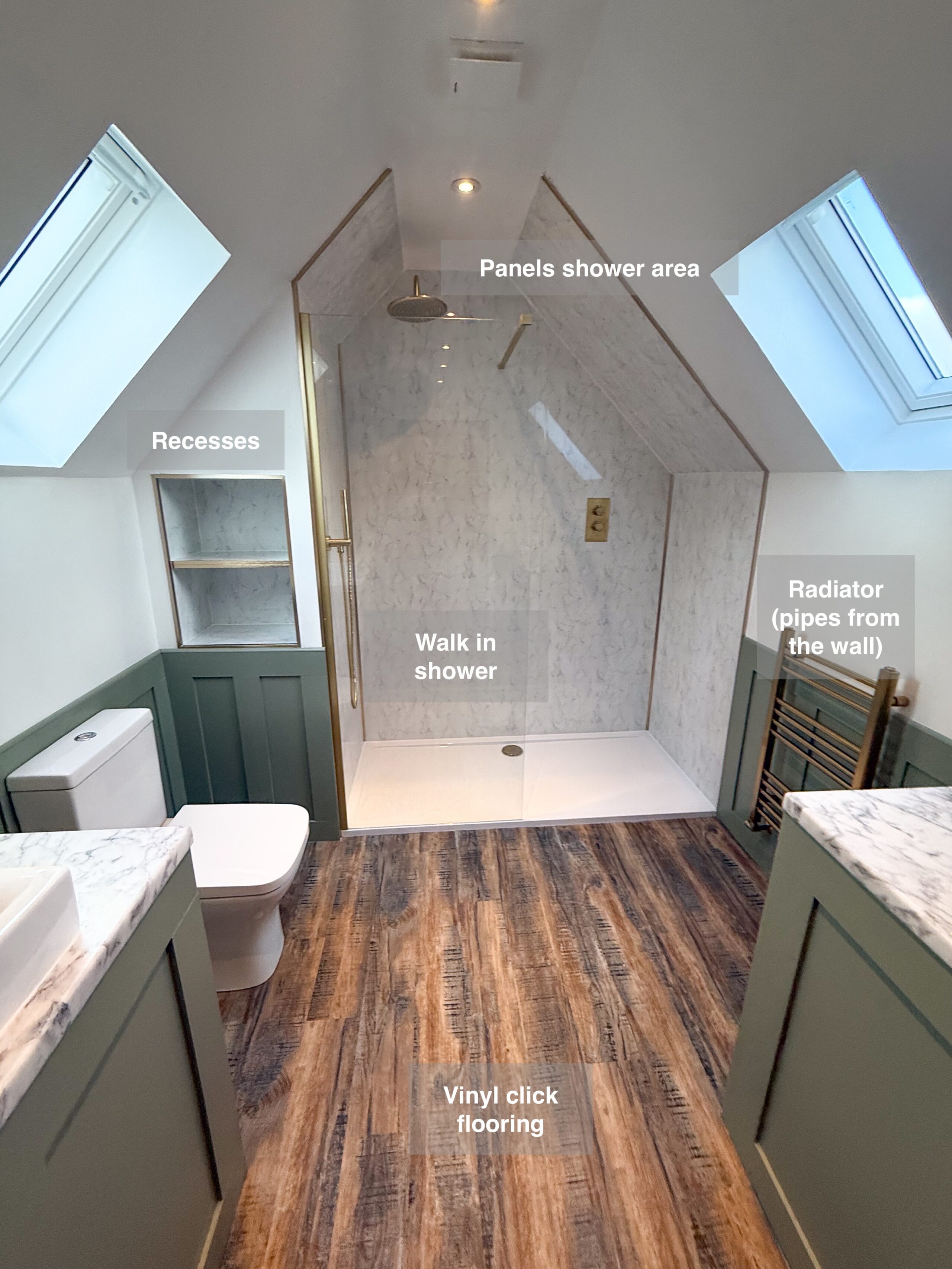 For this project, we reconfigured the layout by repositioning the sink closer to the toilet, making use of previously blocked space beneath the roof structure to install a sleek worktop and basin on a boxed area. The old bathtub was removed and replaced with a stylish walk-in shower, featuring modern shower panels, a concealed shower system, and convenient recessed shelving at both the shower’s end and the side of the unit. We installed click vinyl flooring for a durable and contemporary finish, along with new downlights, an upgraded extractor fan, and a heated towel radiator for added comfort. To enhance…
