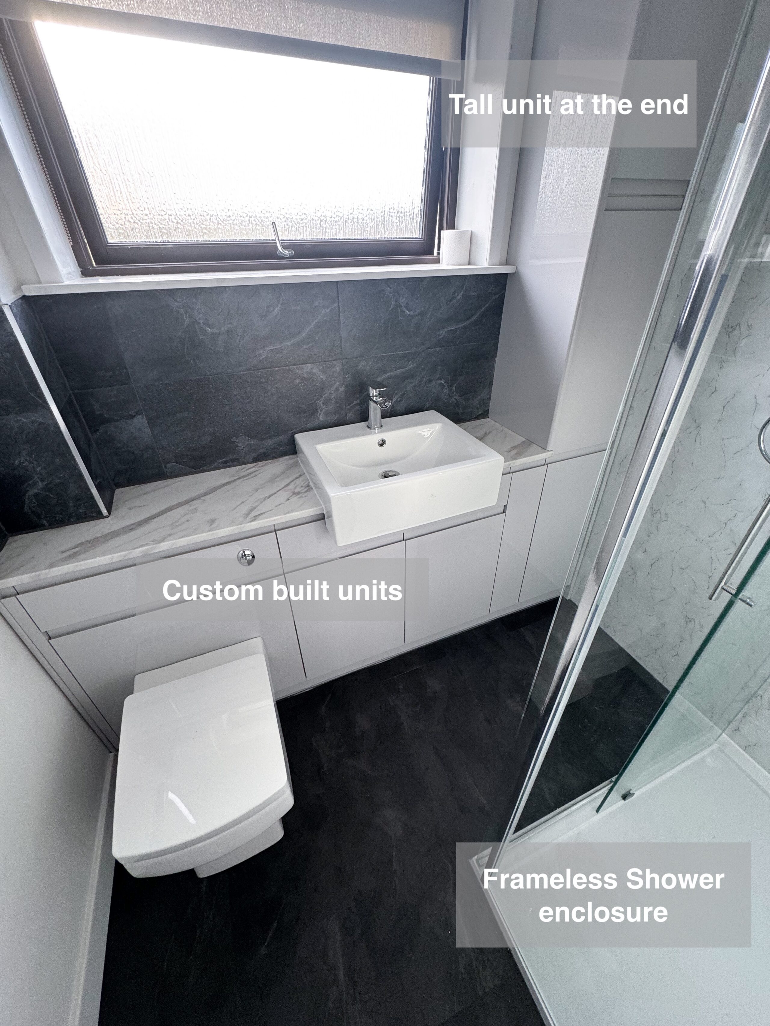 Our customer wanted a mix of modern practicality with a touch of traditional style. Here’s how we brought it together. Screenshot Shower area – fitted with easy-clean panels, so no grout lines to maintain. Classic features – a traditional style toilet and radiator to keep some timeless character. Bespoke vanity – custom fitted at 600mm deep, with four drawers to give plenty of storage and keep everything neat. Flooring – vinyl click laid throughout, warm underfoot and durable for everyday use. Wall finish – Dulux Egyptian Cotton paint, adding a soft, calming backdrop. Tile detail – metro tiles above the…