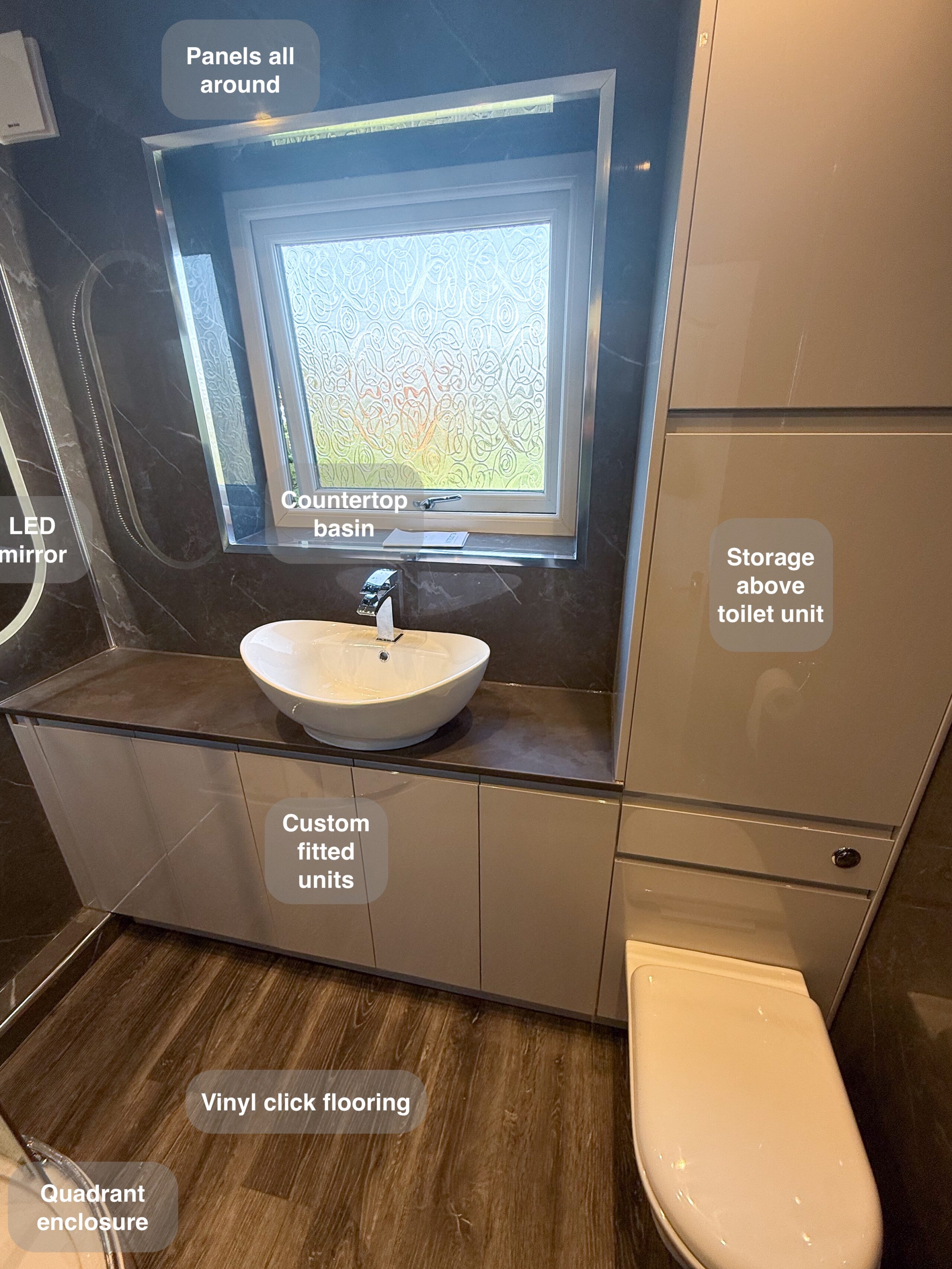 We transformed this bathroom while maintaining the familiar layout, focusing on enhancing both functionality and ease of maintenance for the homeowner. For effortless cleaning, we installed UPVC panels on all walls, and fitted the ceiling with sleek white gloss panels, complete with modern downlights. The flooring was upgraded to durable, easy-to-clean vinyl click flooring, offering a warm feel underfoot and providing moderate anti-slip properties for added safety. The toilet and standard vanity unit were replaced with a bespoke vanity unit featuring an elegant countertop basin and matching tap. The vanity doors were finished in a sophisticated anthracite, which was complemented…