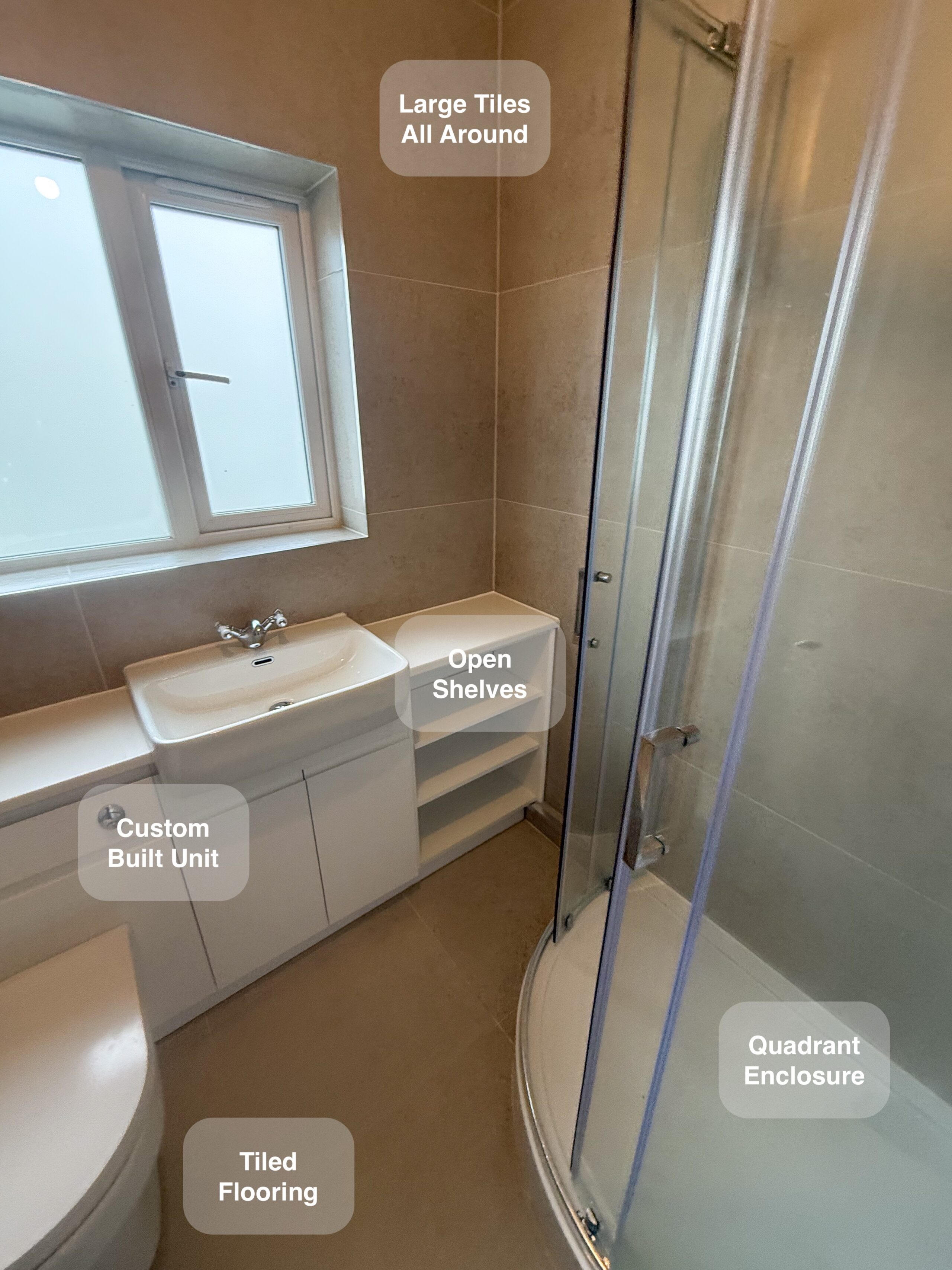 This full bathroom refurbishment was all about making the space easier to use and far more practical day to day. Previously, the room had virtually no storage and a bathtub that was awkward to use as a shower. We redesigned the layout to create a comfortable, easy-access shower within a quadrant enclosure, making daily routines simpler and safer. Large format tiles with epoxy grout were used throughout, giving the bathroom a clean, modern look while keeping maintenance to a minimum. Custom-built units now provide much-needed storage, with open shelves positioned for easy reach from the shower – ideal for everyday…