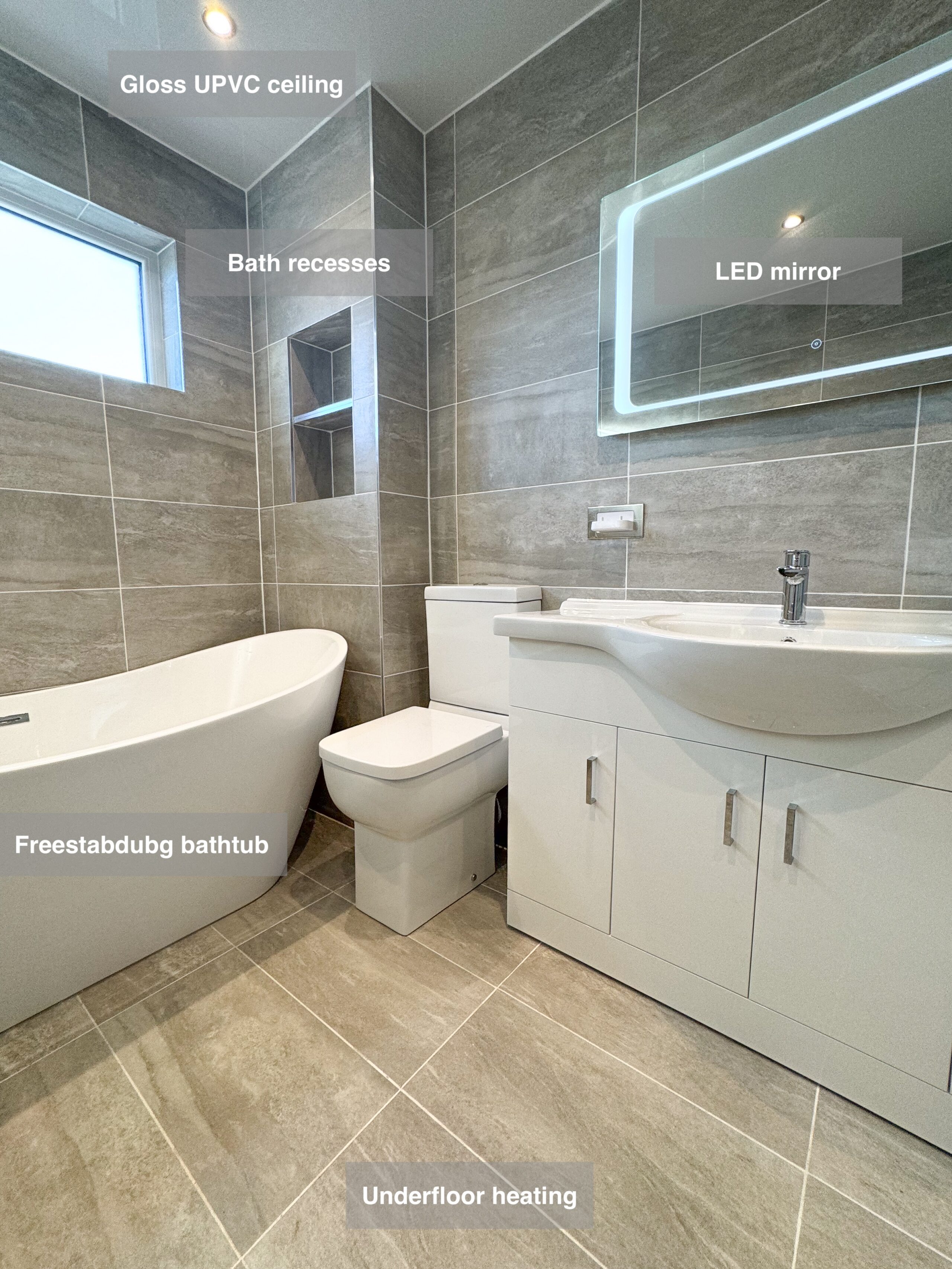 Tailored for a growing family: Bathtub installed instead of shower – perfect for bathing the new baby and practical for family use. Tiled walls throughout – easy to wipe clean, protecting against splashes and daily wear. Vinyl click flooring – warm, durable and safer underfoot. Recess in the bath area – handy storage for baby products and toiletries. Custom-built units – designed to give extra storage for all the family’s essentials. New UPVC window – energy-efficient, modern and low-maintenance. Towel radiator – keeps towels warm and adds comfort after bath time. UPVC ceiling with downlights – bright, fresh finish that’s…