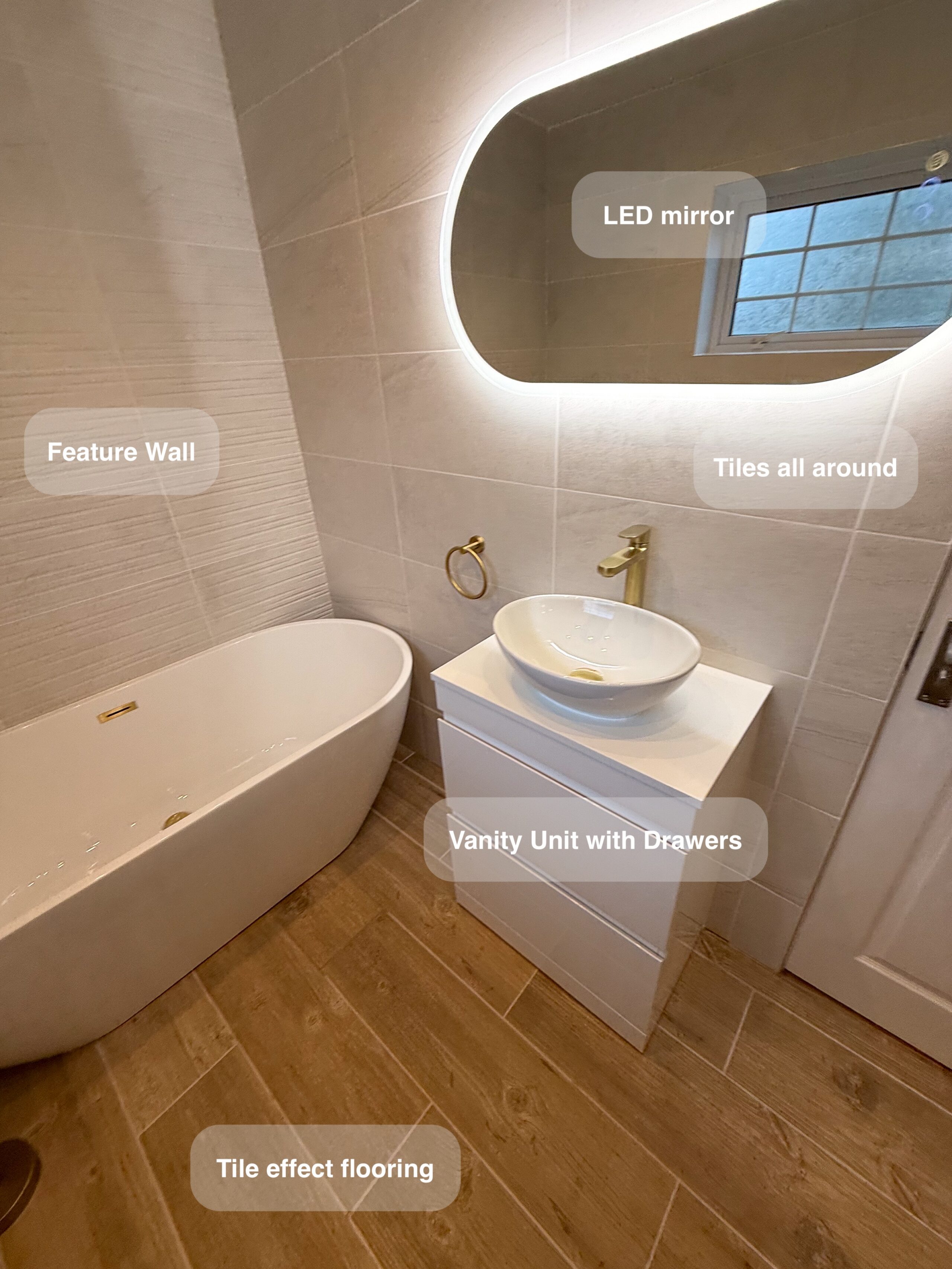 Full bathroom refurbishment, including an extension to create a more spacious and practical layout. We installed durable wood-effect floor tiles for a warm, modern look, along with fully tiled walls and a feature wall to add character and make the space feel more high-end. The new vanity unit with deep drawers provides excellent storage, paired with a sleek countertop basin for a clean, contemporary finish. A freestanding bathtub with a floor-mounted bath filler creates a real luxury focal point, while brass fittings add a premium feel throughout. Comfort and practicality were improved with a towel radiator, an inline extractor fan…