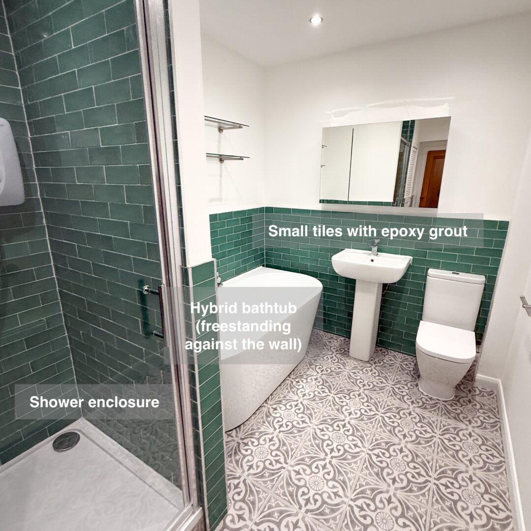 To enhance comfort and convenience, we installed downlights, a towel radiator, and a feature tile wall in the shower area. A close-coupled toilet and vanity unit provided both practicality and elegance, while an LED cabinet and vinyl click flooring added extra storage and warmth underfoot.