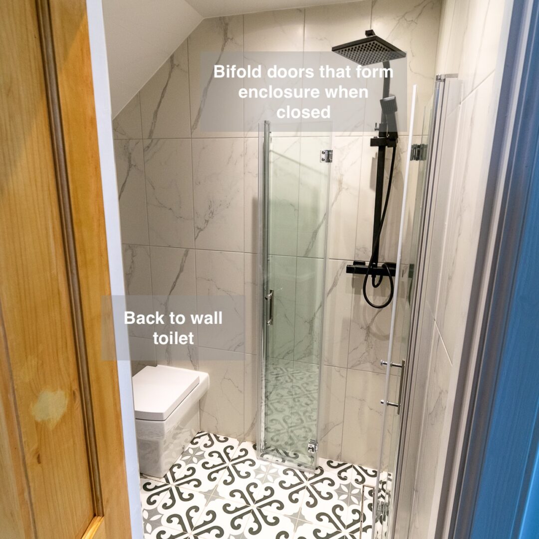 Tiled flooring and panels all around (including on the ceiling) makes this a less expensive wetroom, with very little maintenance in terms of cleaning.