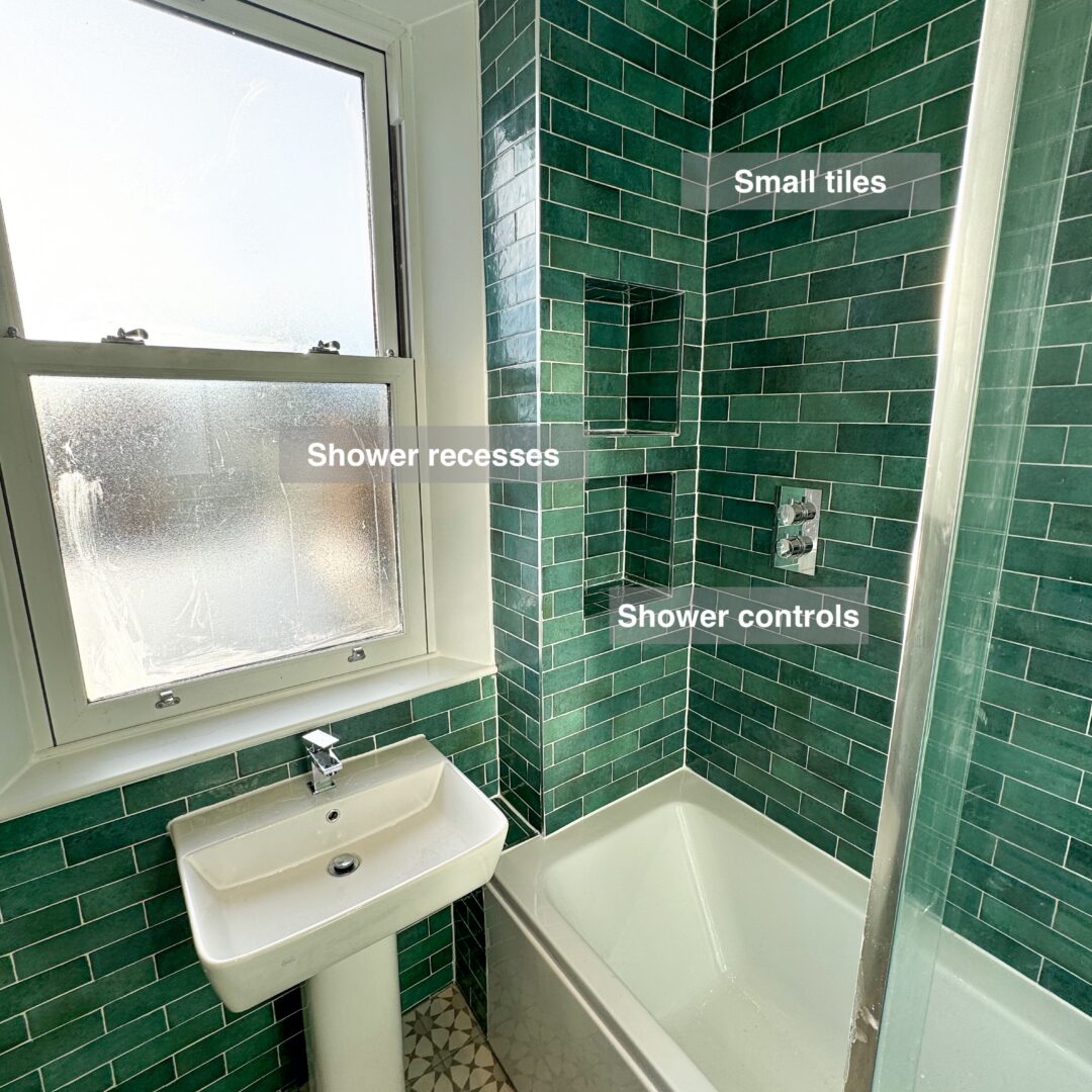 For convenience and aesthetics, we installed a back-to-wall close-coupled toilet and an 800mm anthracite vanity unit with two spacious, soft-close drawers, perfect for organised storage. In the shower area, we used mid-grey large tiles (600×300) for a contemporary look, continuing half-height tiling on the remaining walls for a seamless design. The window surround was fully tiled to ensure long-lasting waterproofing, ideal for maintaining a low-maintenance, clean look.