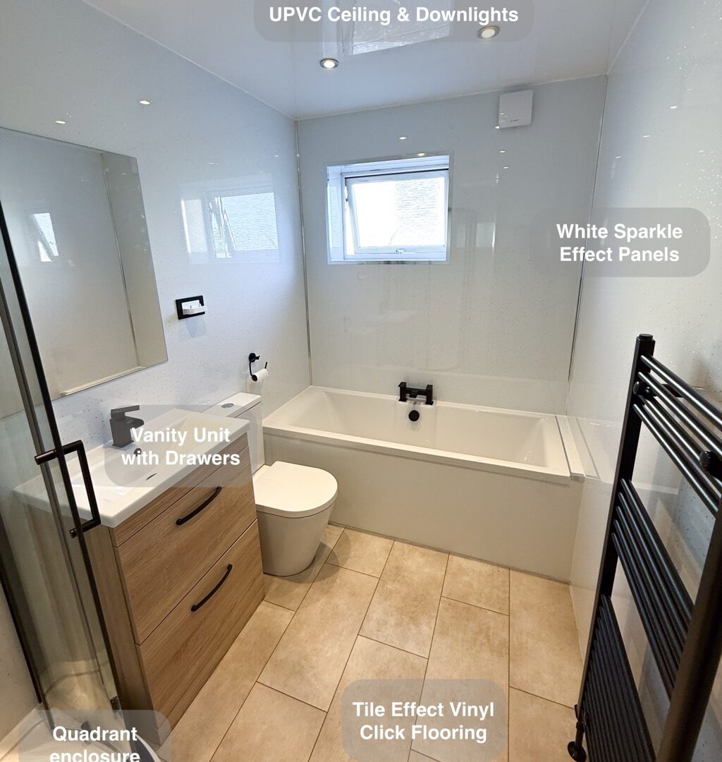 A chrome thermostatic dual shower offers luxurious control of temperature and water flow, while a larger LED mirror with demister function adds both style and practicality. Dark slate vinyl click flooring enhances durability and ease of cleaning, perfect for busy households. The untiled sections of the walls were plastered and painted white to create a crisp, fresh finish.