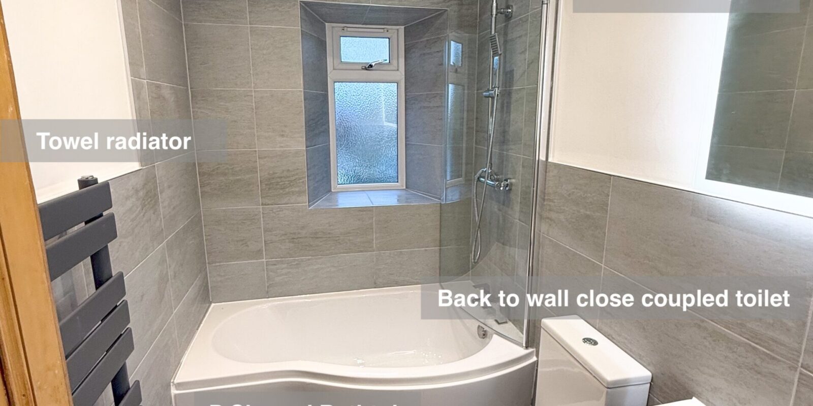 For convenience and aesthetics, we installed a back-to-wall close-coupled toilet and an 800mm anthracite vanity unit with two spacious, soft-close drawers, perfect for organised storage. In the shower area, we used mid-grey large tiles (600×300) for a contemporary look, continuing half-height tiling on the remaining walls for a seamless design. The window surround was fully tiled to ensure long-lasting waterproofing, ideal for maintaining a low-maintenance, clean look.