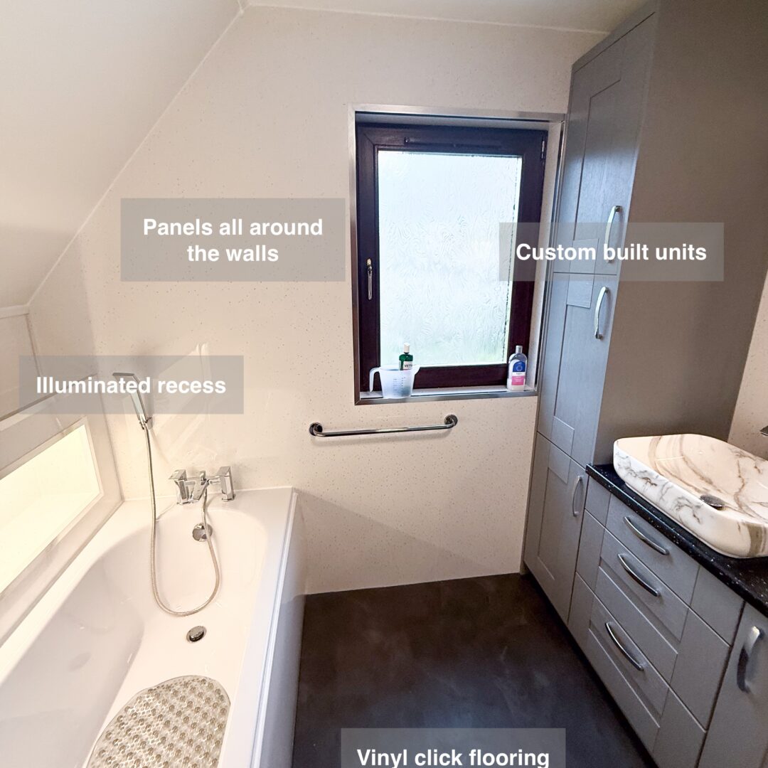 Complete bathroom refurbishment featuring modern wall panels throughout the room for a sleek, seamless look. Highlights include a stylish J-shaped…