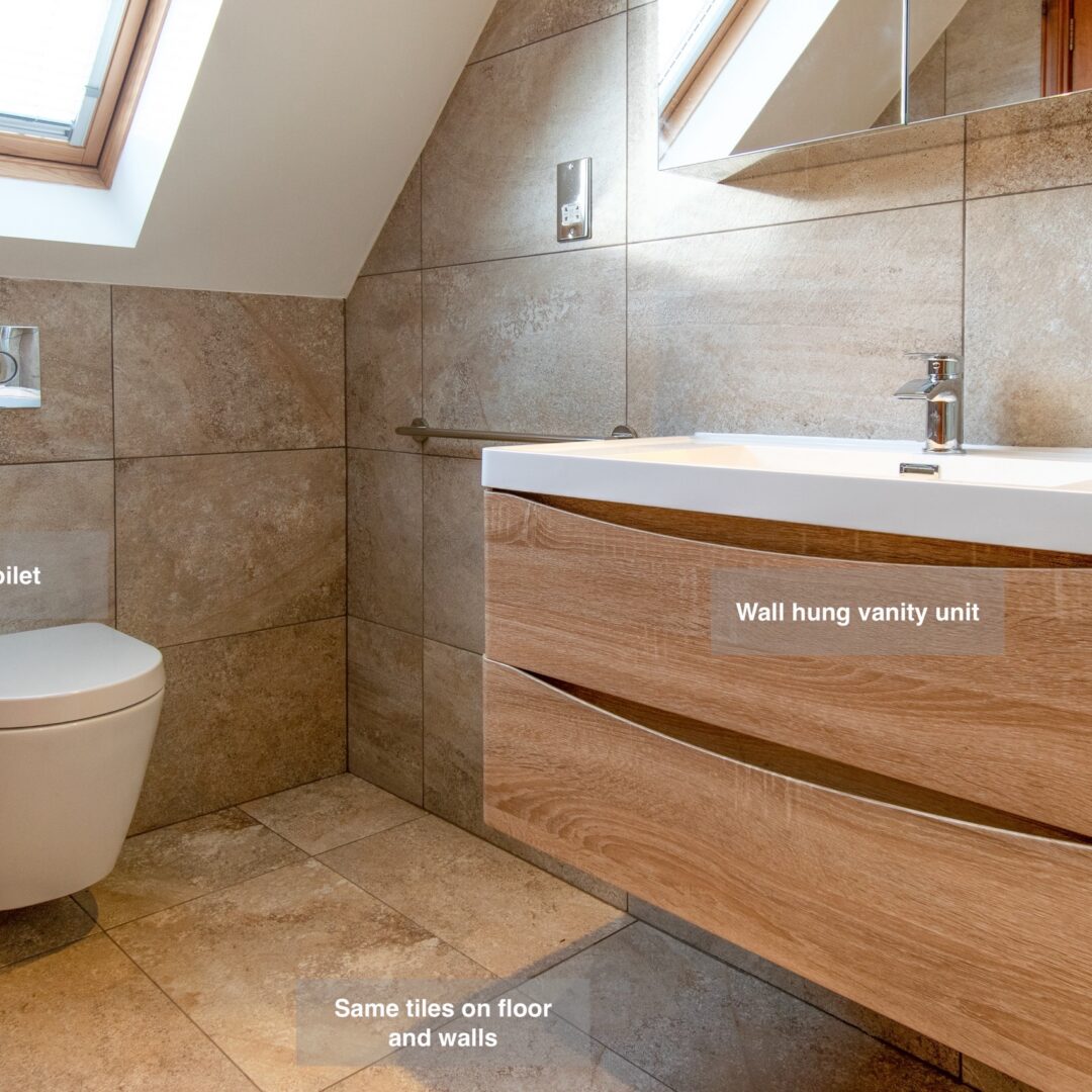 This bathroom is designed for both style and functionality, featuring custom-built units for efficient storage, a walk-in shower for easy access, and a wall-hung toilet for a sleek, space-saving look.