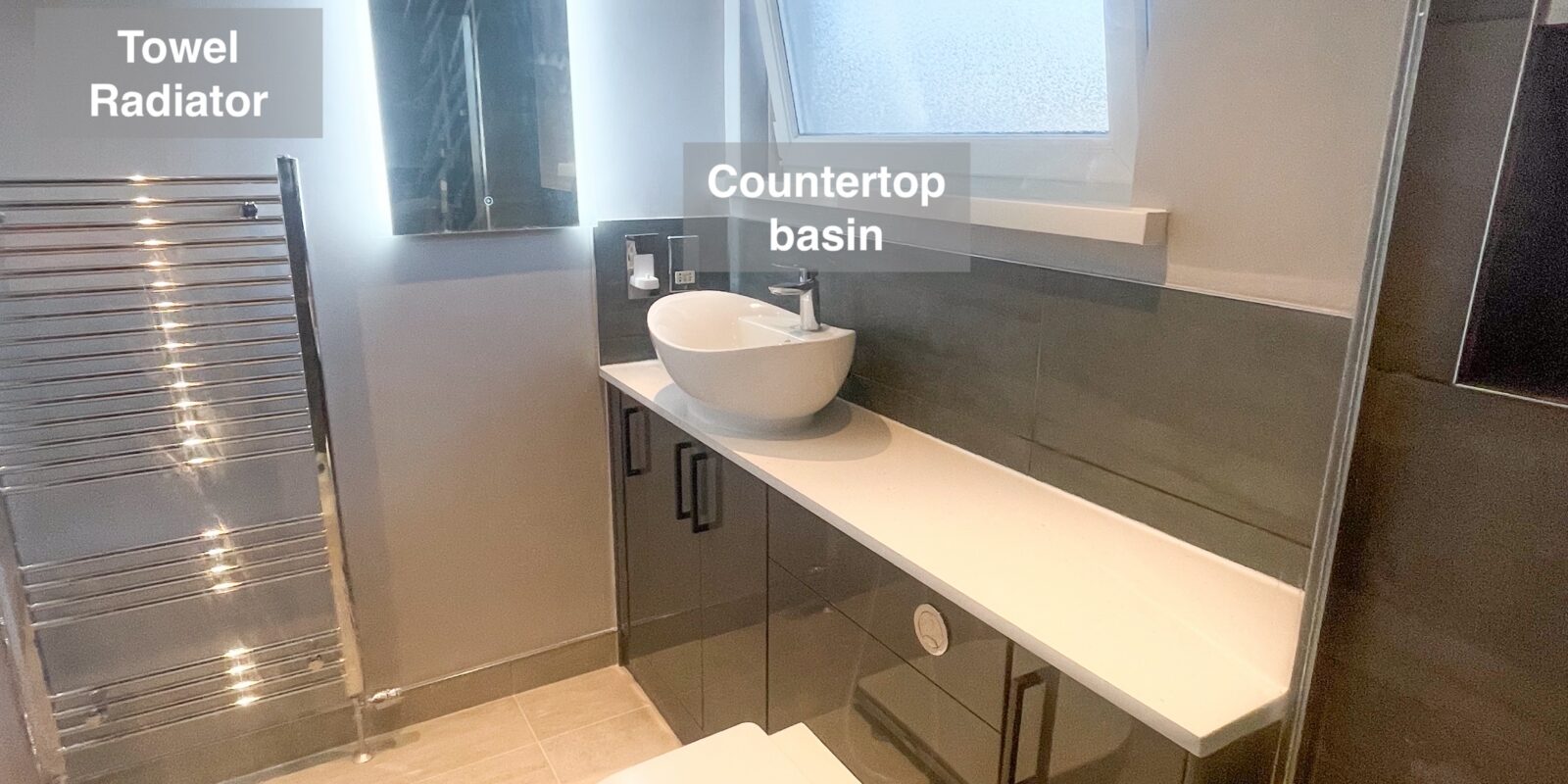 The overmounted basin and towel radiator add comfort, while tiled surfaces in the shower area, on the floor, and above the vanity enhance durability and ease of cleaning. The side wall LED mirror ensures optimal lighting.