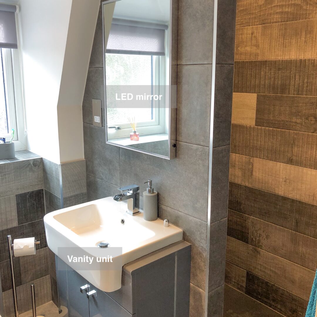 The shower area features stylish tiles for added texture and a thermostatic system for a luxurious experience. Vinyl click flooring provides warmth and comfort underfoot, completing the transformation into a modern, functional, and stylish space.