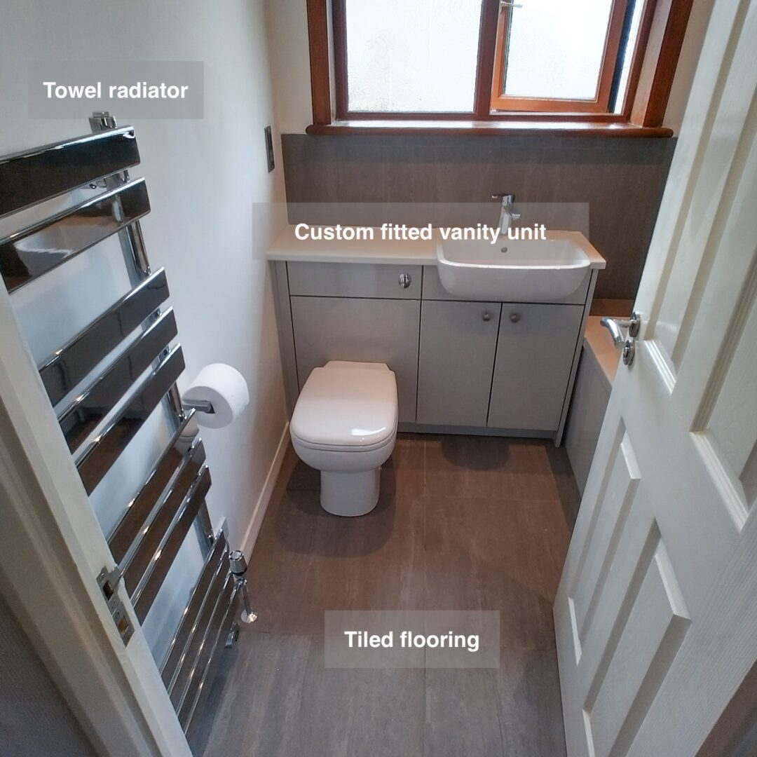 The toilet and standard vanity unit were replaced with a bespoke vanity unit featuring an elegant countertop basin and matching tap. The vanity doors were finished in a sophisticated anthracite, which was complemented by a stylish anthracite towel radiator, adding a touch of contemporary flair.