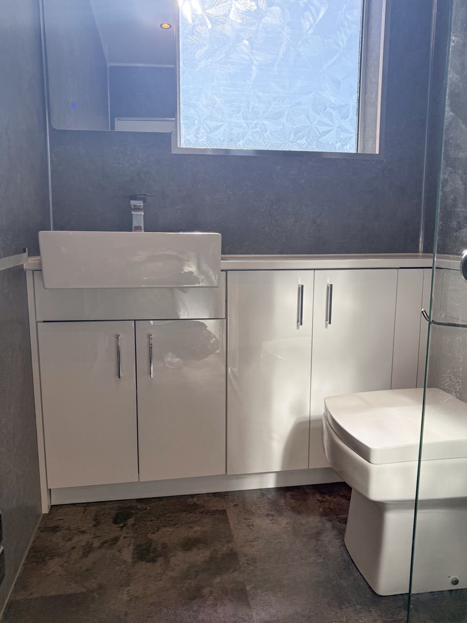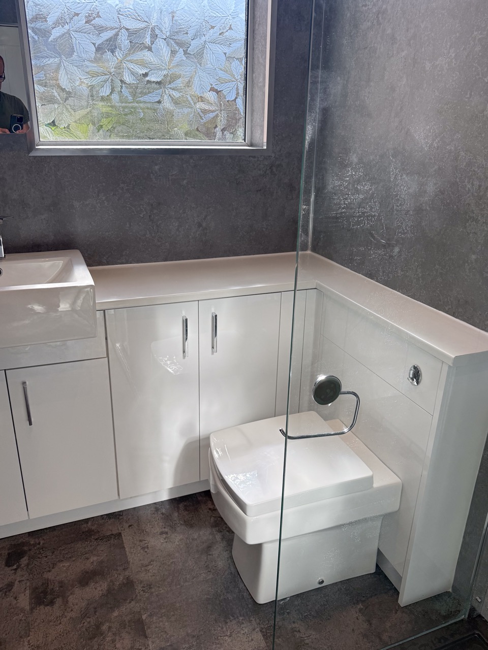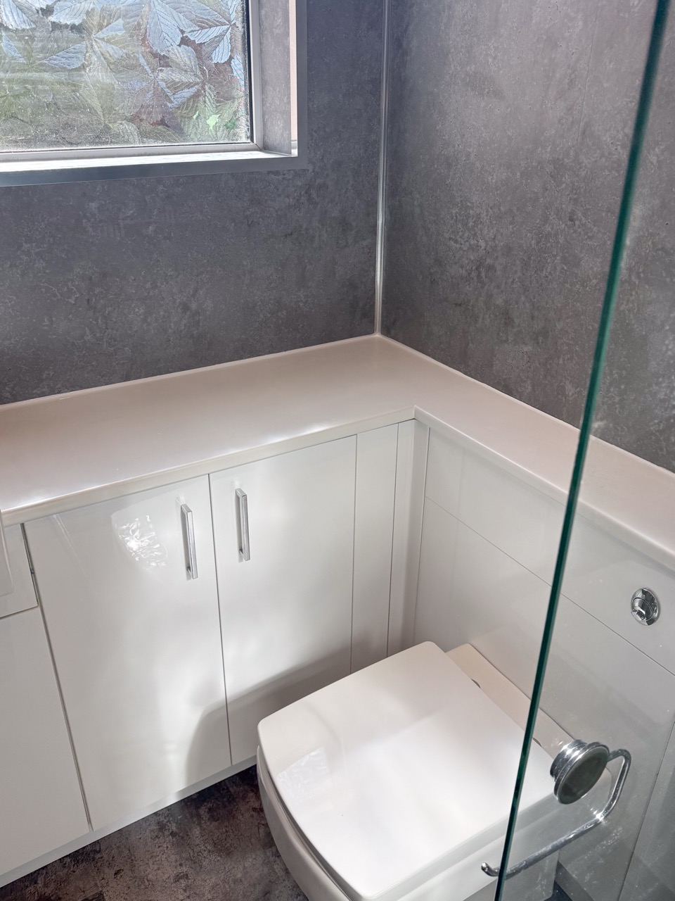 To increase storage, we moved the toilet onto the shower wall and added L-shaped units, which make the best use of space while providing plenty of cupboard room.