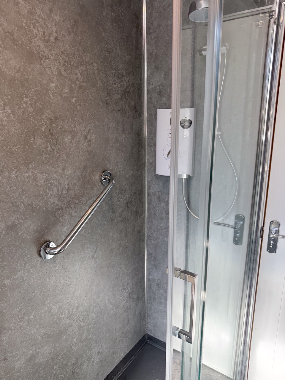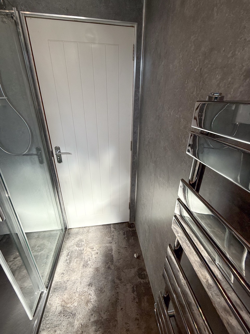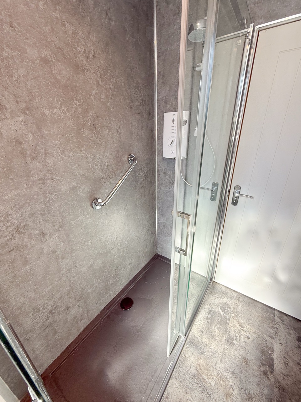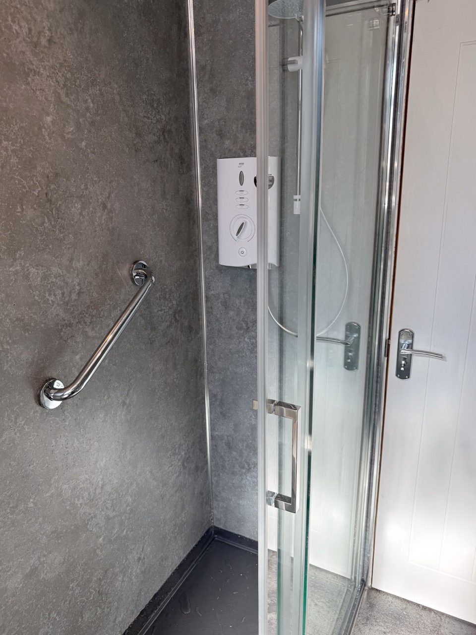 Because of the size of the doorway, we were limited to a 700mm enclosure. We fitted a frameless screen with an anthracite tray to keep the look modern and uncluttered.