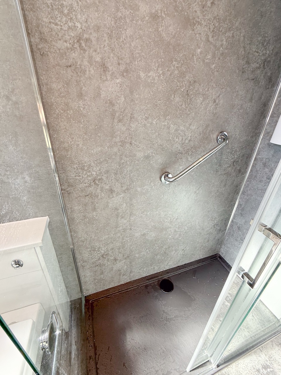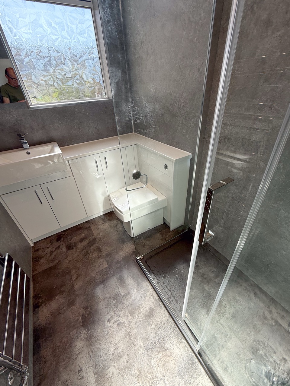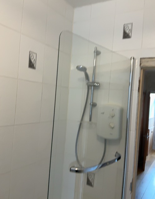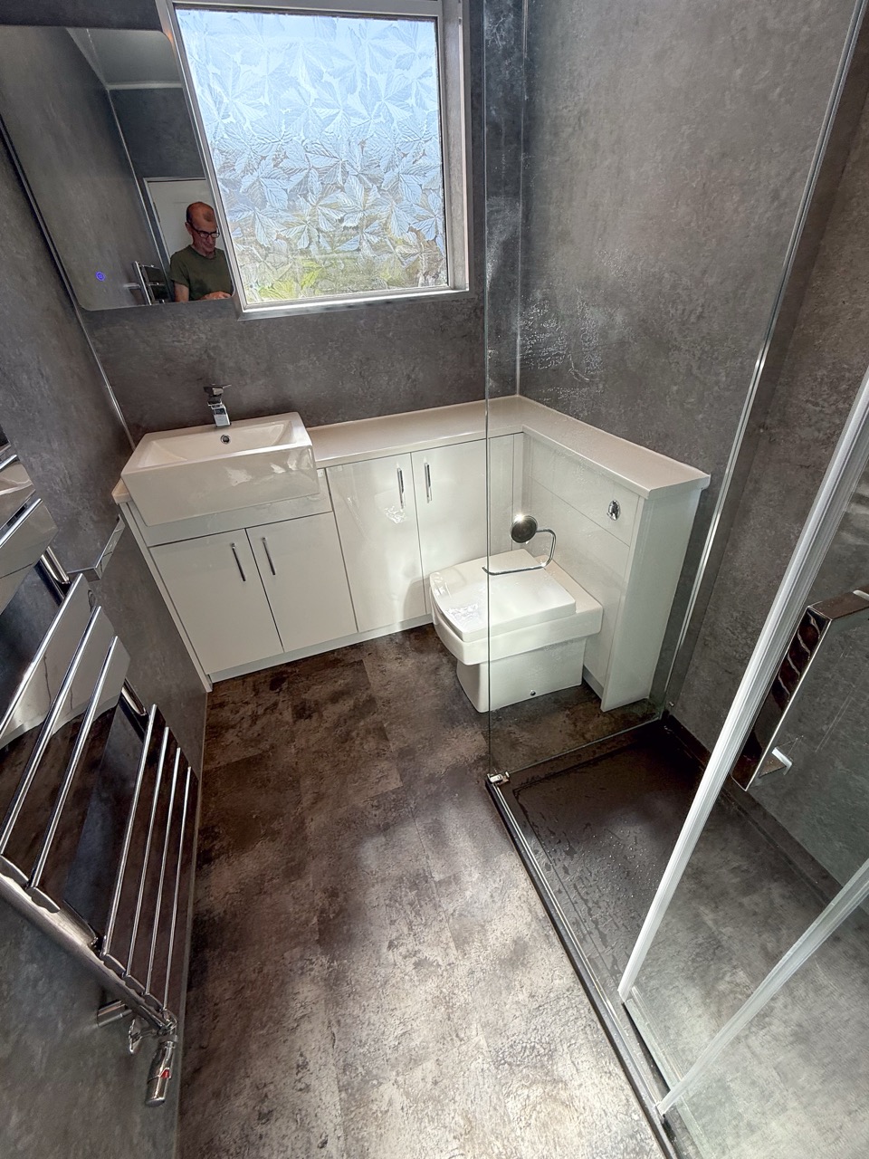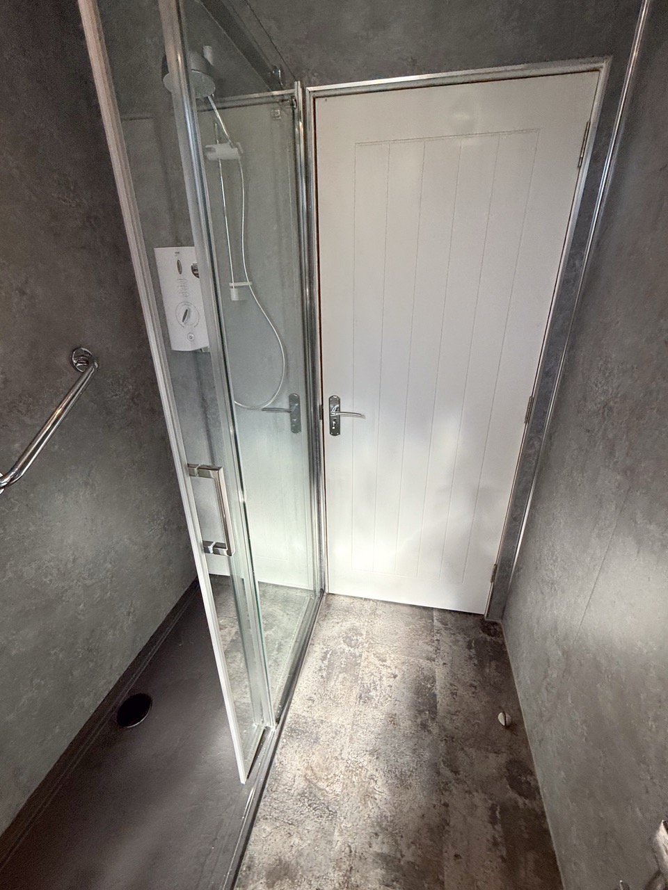 Because of the size of the doorway, we were limited to a 700mm enclosure. We fitted a frameless screen with an anthracite tray to keep the look modern and uncluttered.