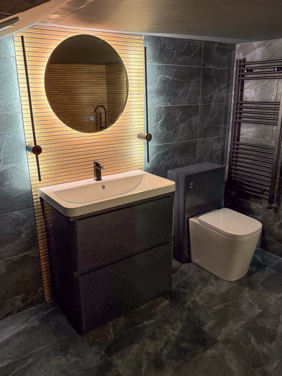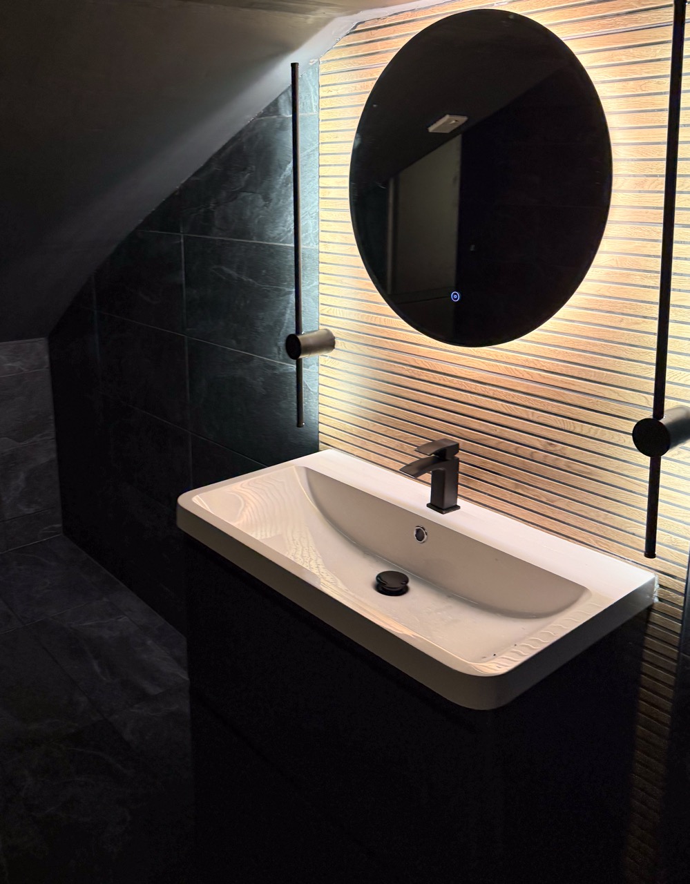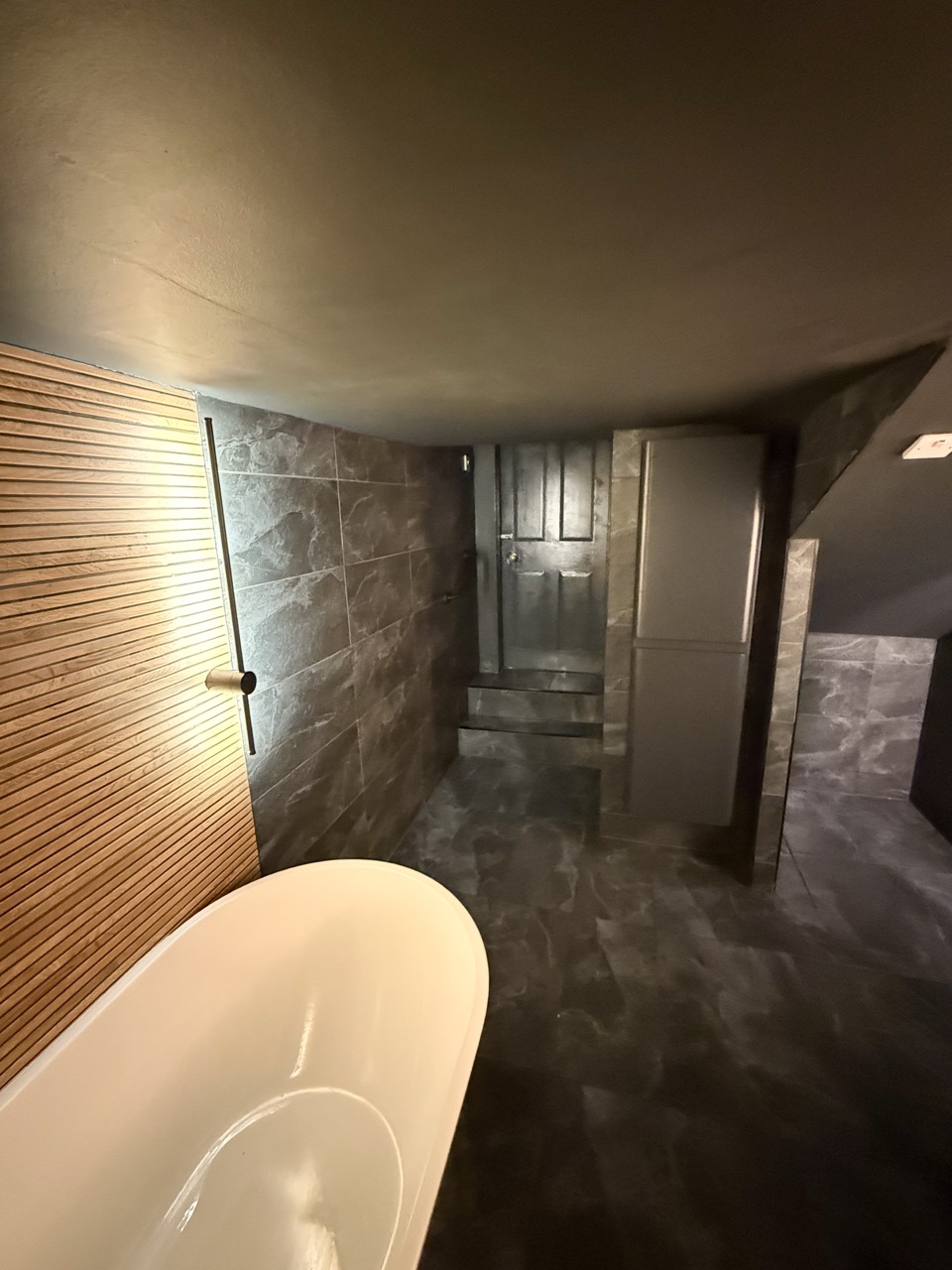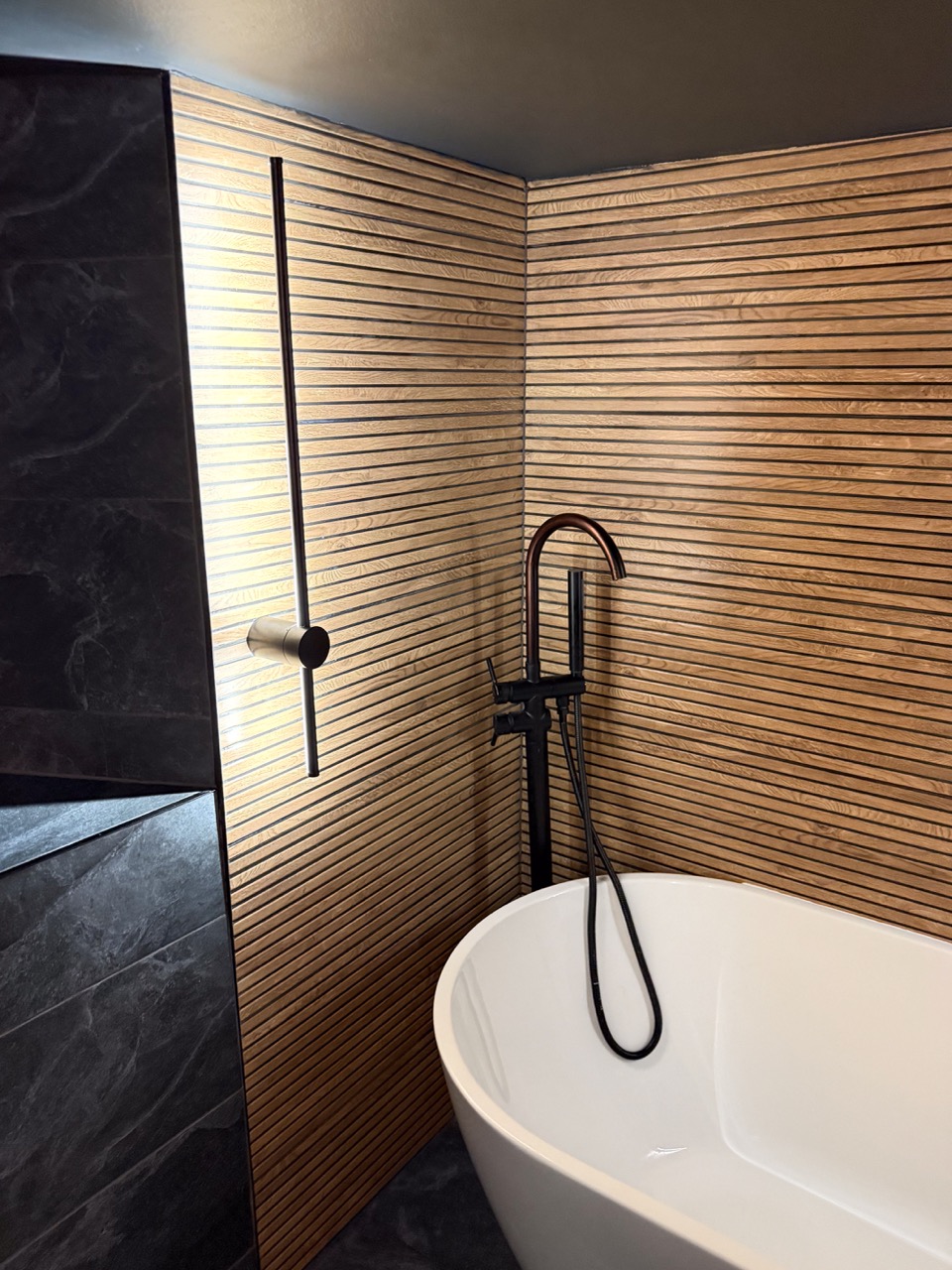 With a ceiling height of just over 1800mm, a shower wasn’t really an option, so a freestanding bath was the best choice. It suits the room well and creates a calm, relaxing space. The walls were fully tiled for durability and easy cleaning, with wood-effect tiles around the bath and vanity to add warmth and character.