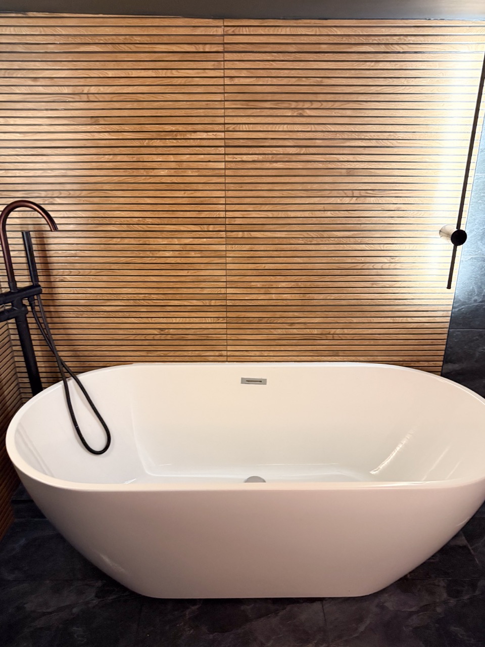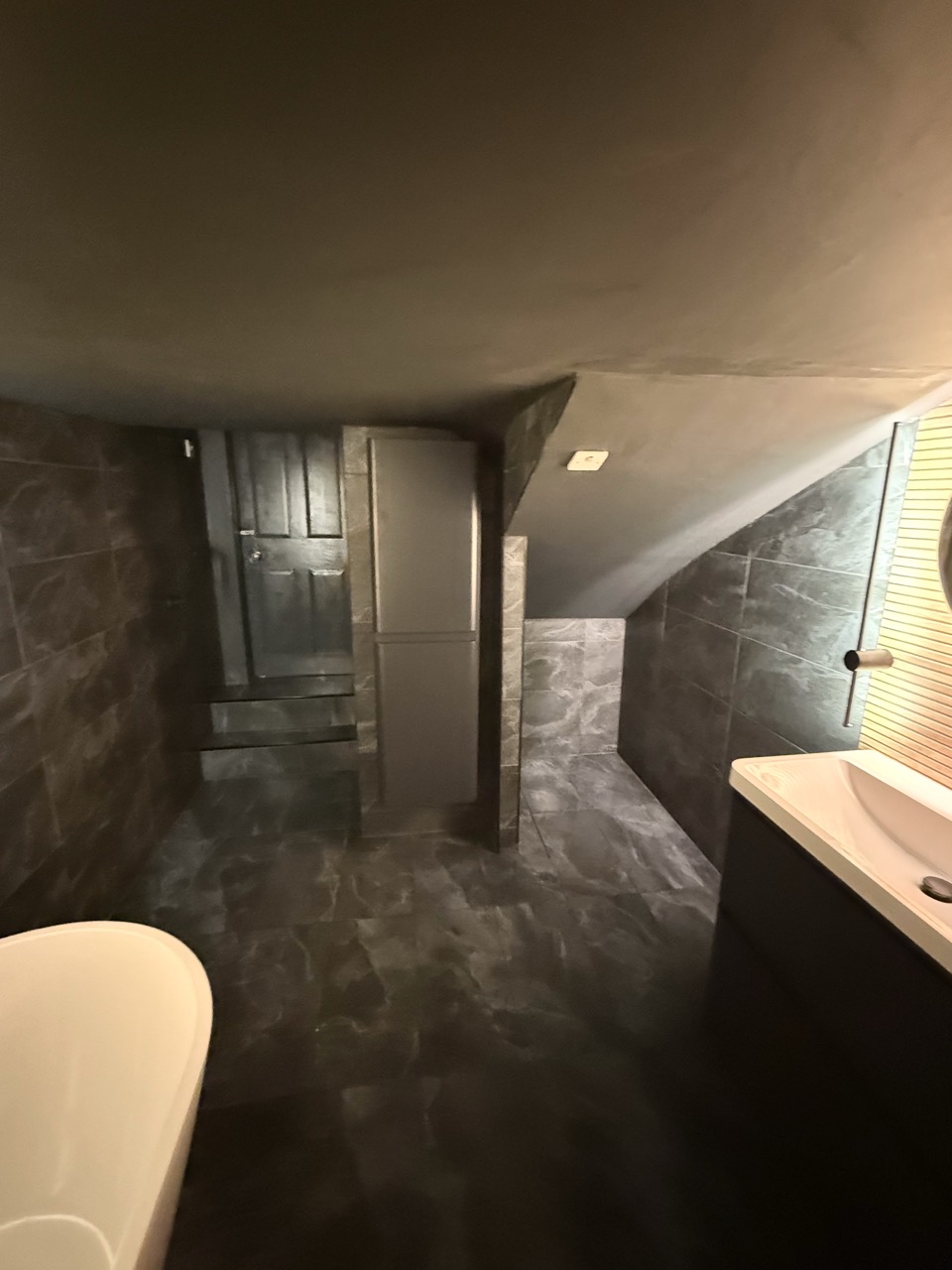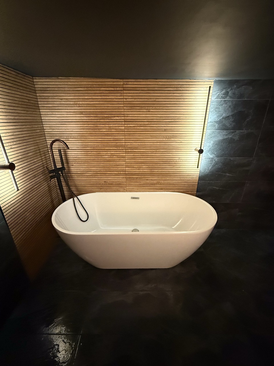 With a ceiling height of just over 1800mm, a shower wasn’t really an option, so a freestanding bath was the best choice. It suits the room well and creates a calm, relaxing space. The walls were fully tiled for durability and easy cleaning, with wood-effect tiles around the bath and vanity to add warmth and character.