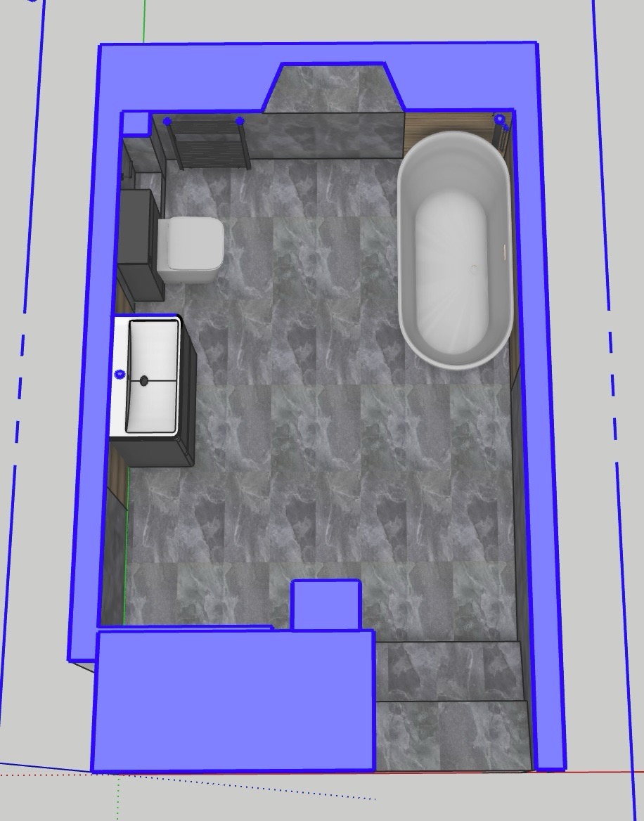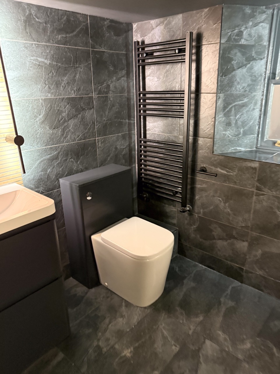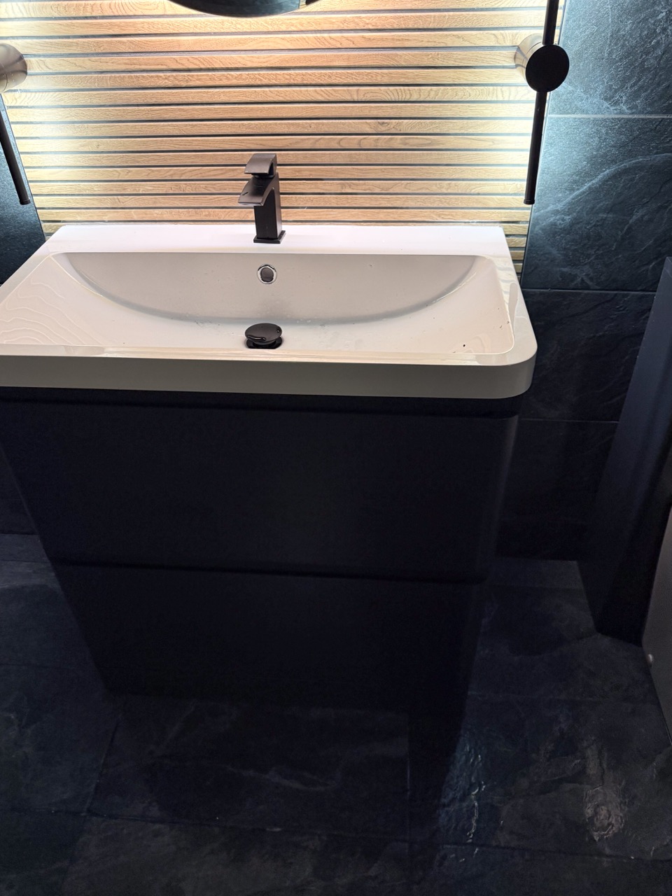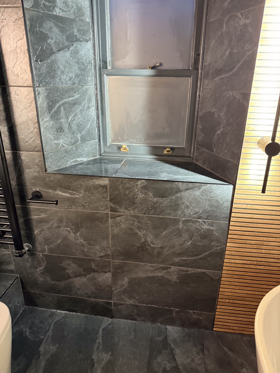 With a ceiling height of just over 1800mm, a shower wasn’t really an option, so a freestanding bath was the best choice. It suits the room well and creates a calm, relaxing space. The walls were fully tiled for durability and easy cleaning, with wood-effect tiles around the bath and vanity to add warmth and character.