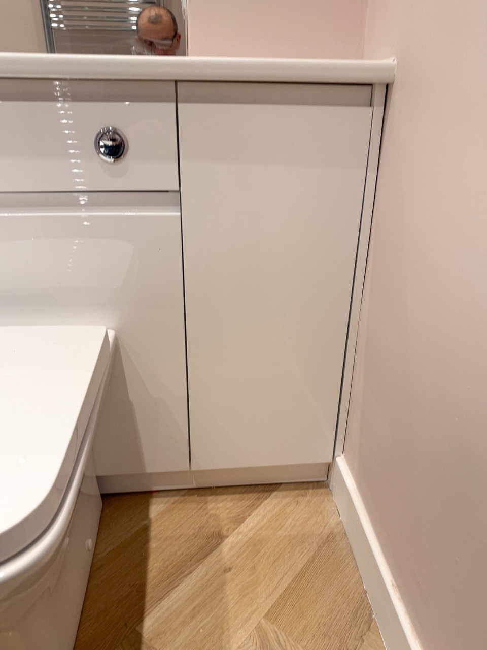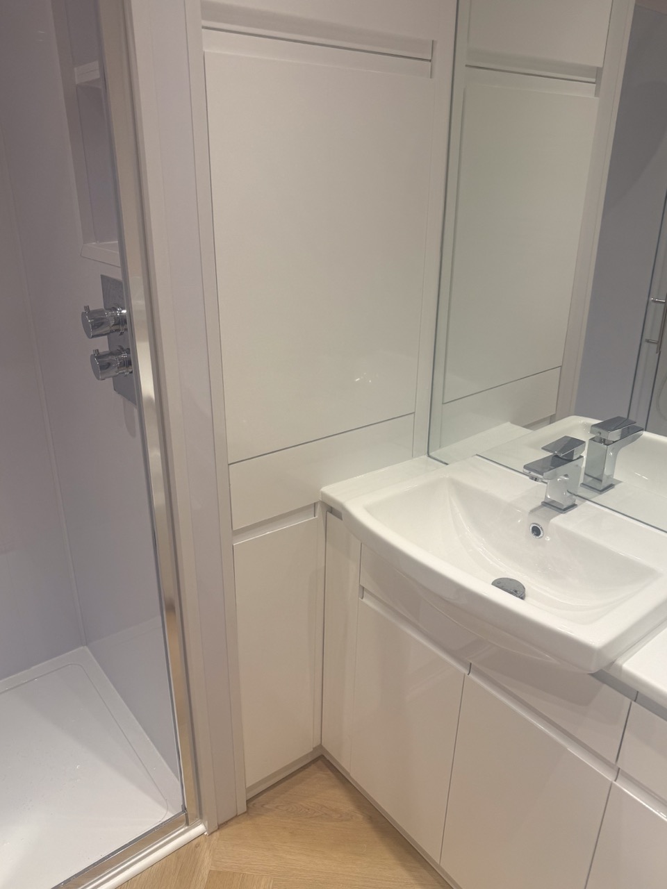 By rethinking the layout, we were able to unlock space that previously wasn’t being used properly. An old cupboard was removed and partly incorporated into the new 1200 × 800 recessed shower, creating a much more spacious showering area while still keeping the room well balanced. The remaining space beside the shower was used for floor-to-ceiling storage units, giving the customer plenty of practical storage while keeping the room tidy and uncluttered.