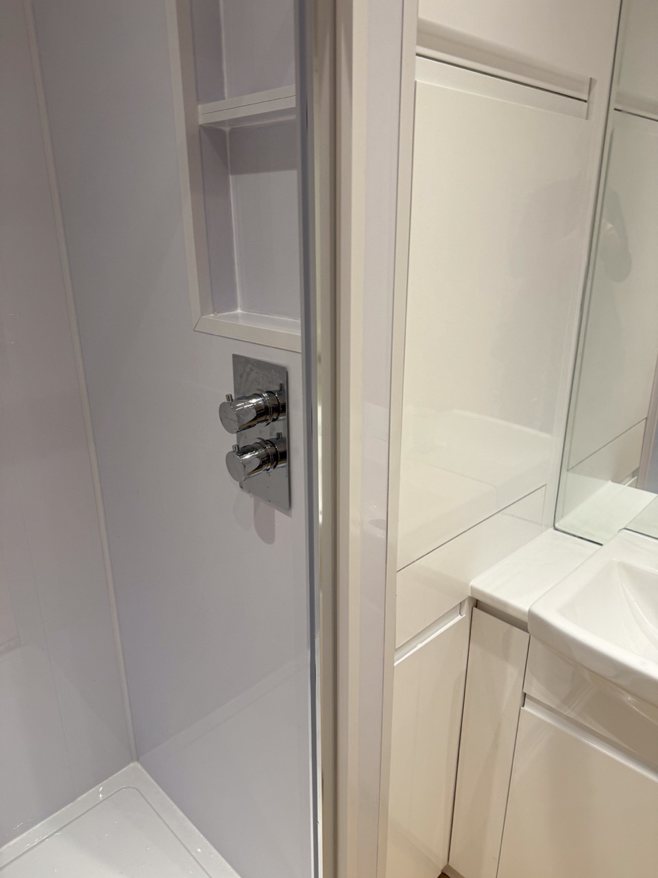 Two illuminated recesses inside the shower add convenient storage for toiletries, while downlights and a UPVC ceiling help make the room feel brighter and easier to maintain.