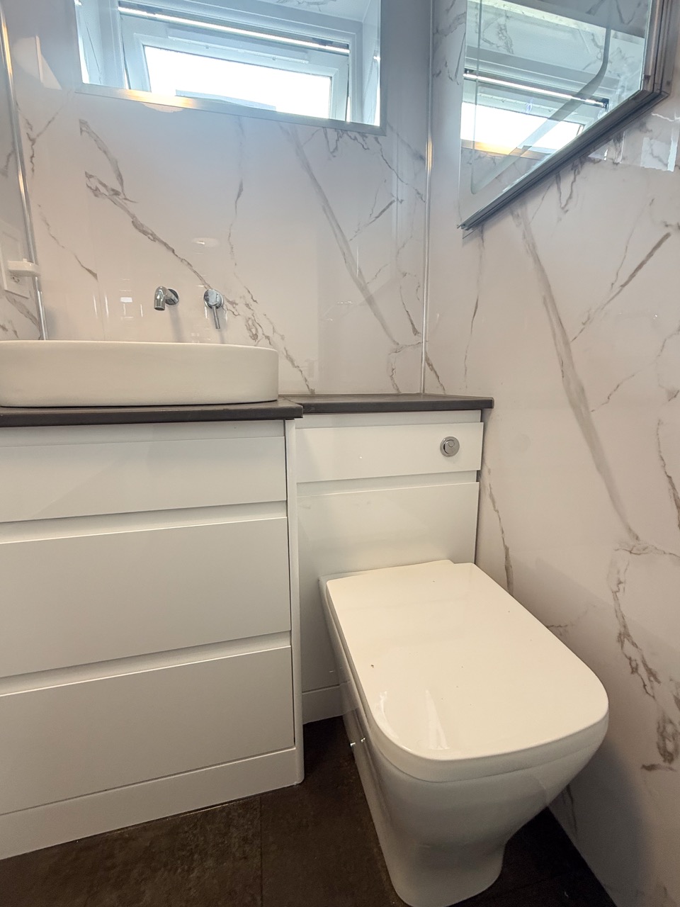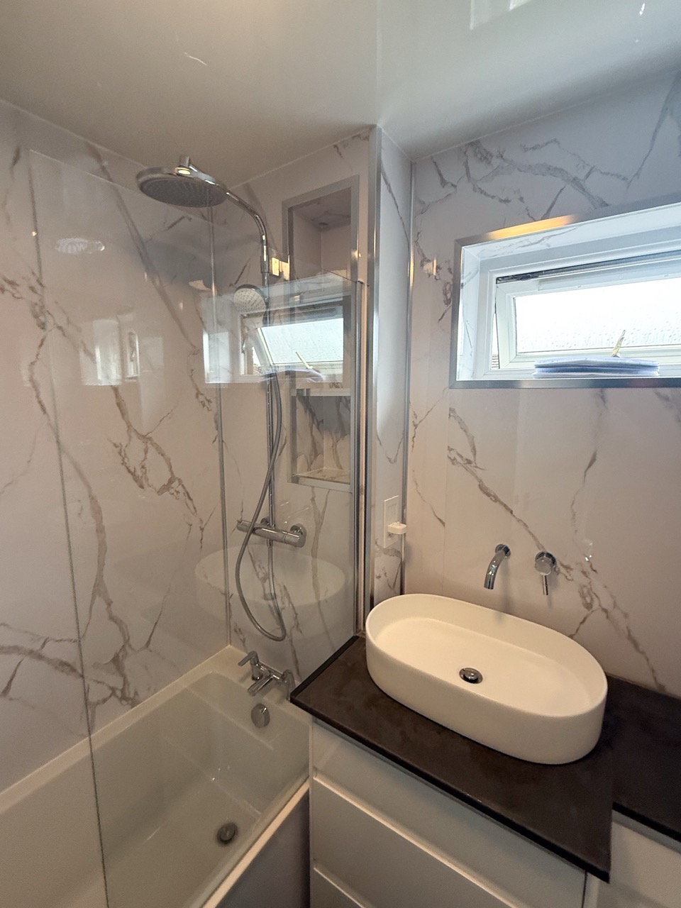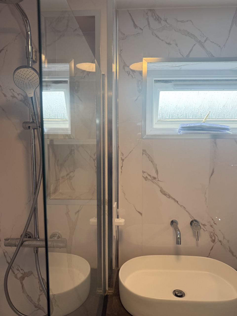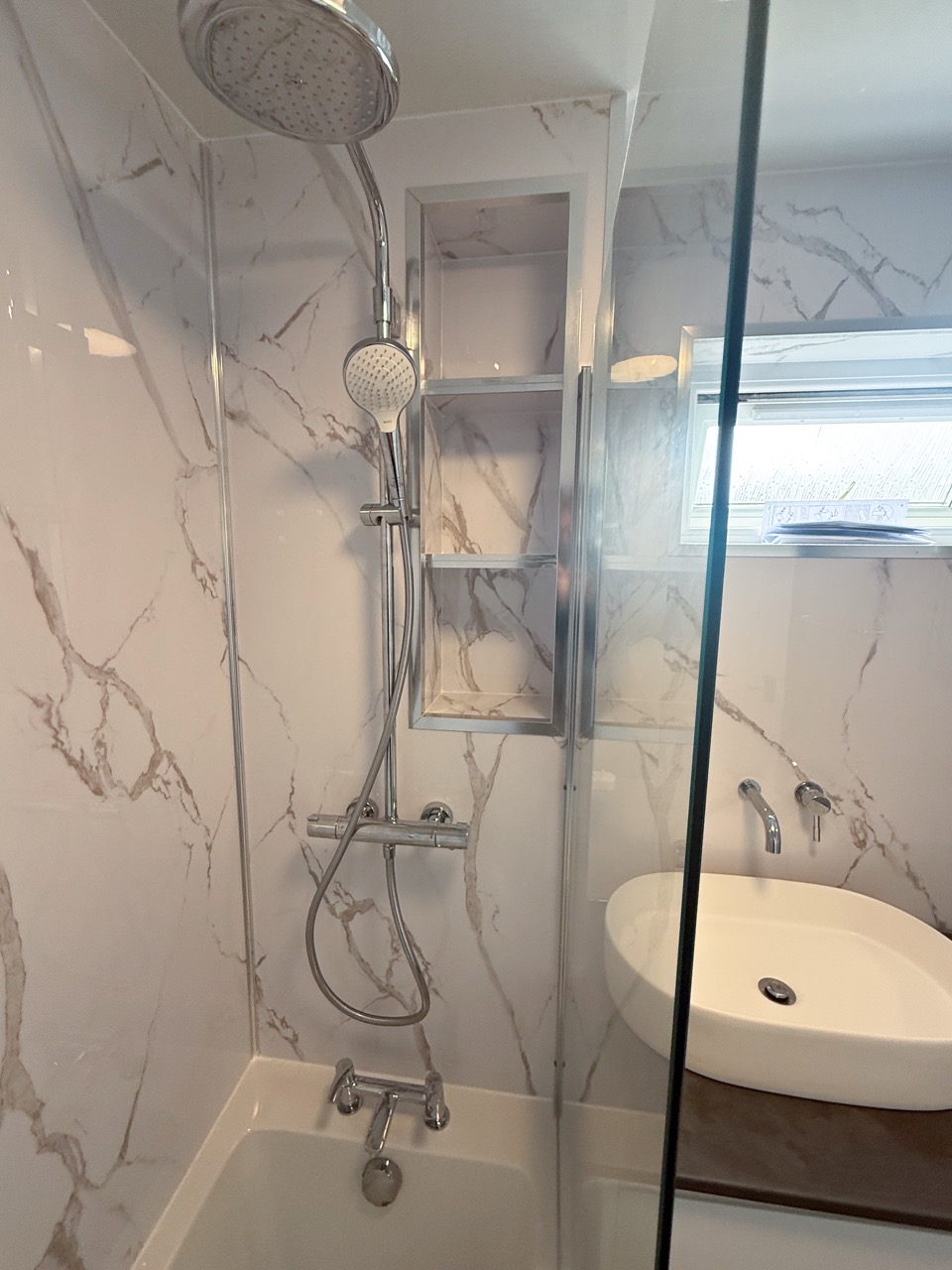 - Moved the shower to the opposite side and built a new wall to house the soil pipe, incorporating three recessed shelves for toiletries.