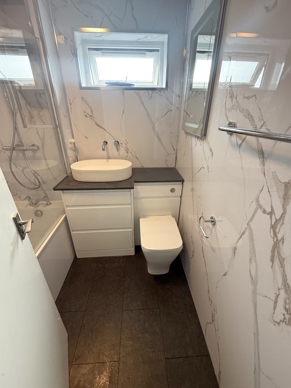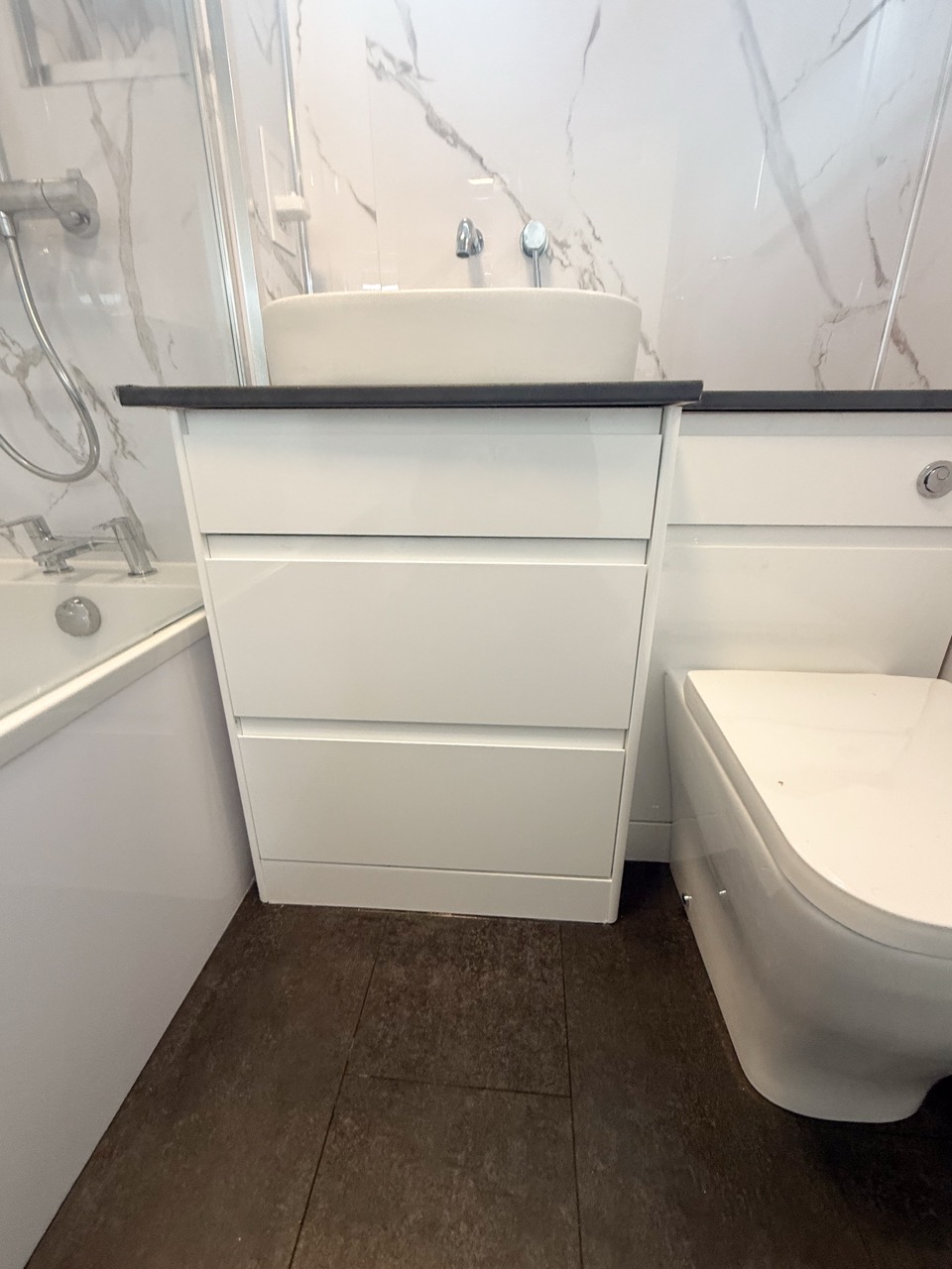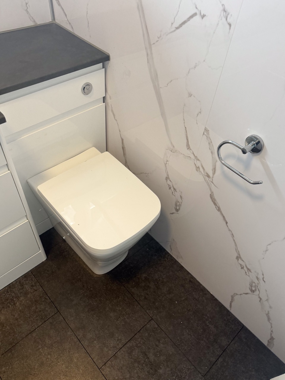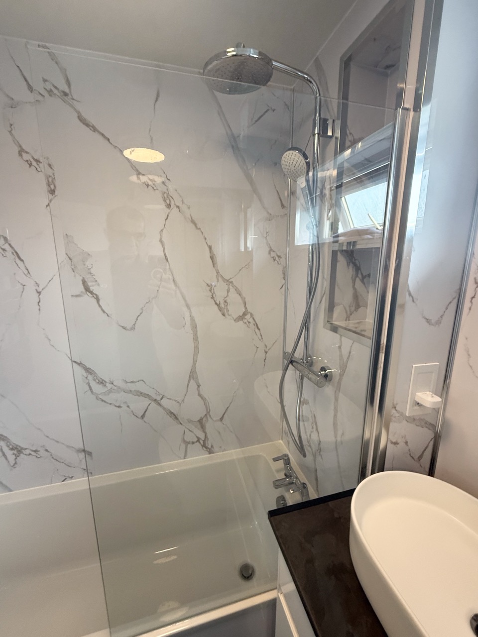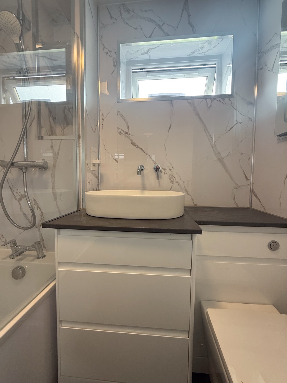 - Moved the shower to the opposite side and built a new wall to house the soil pipe, incorporating three recessed shelves for toiletries.