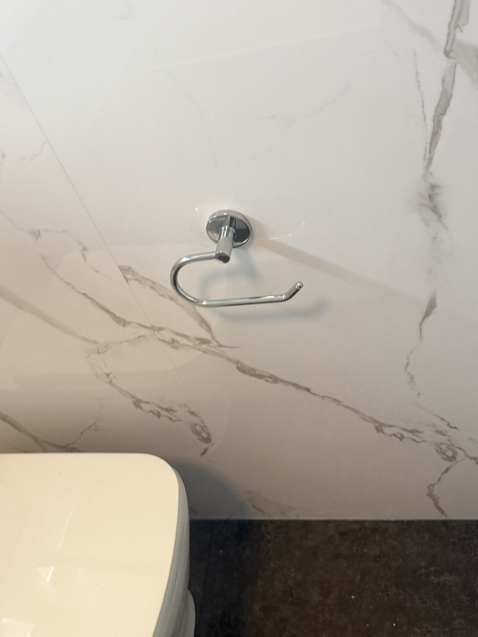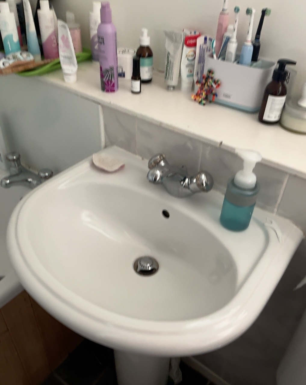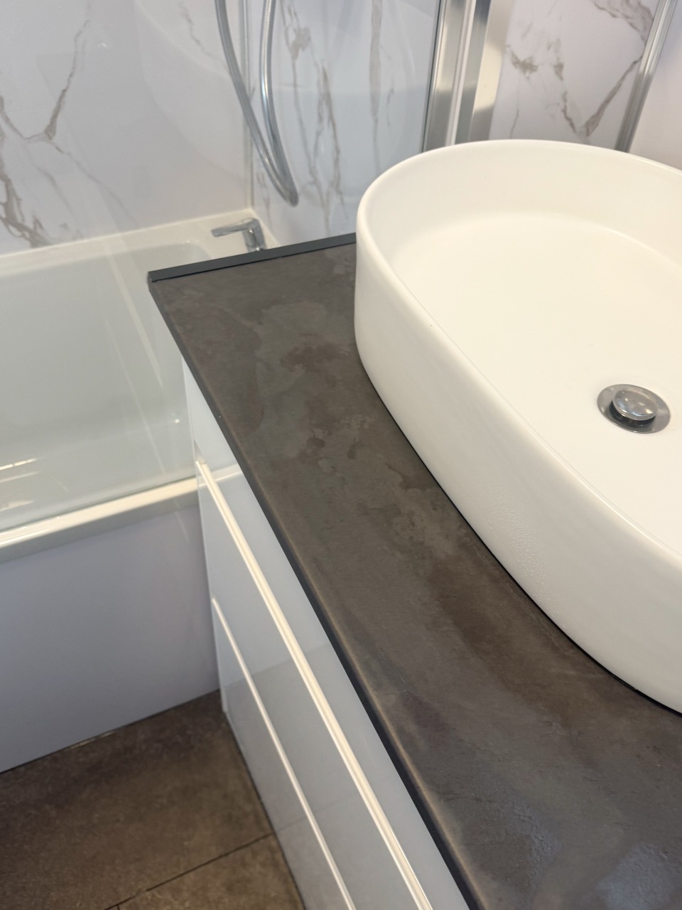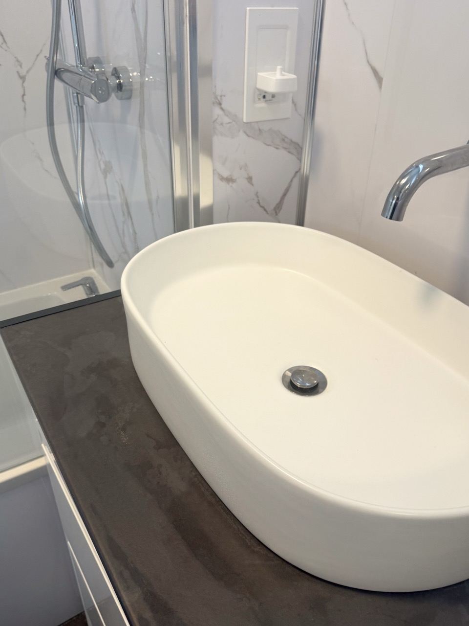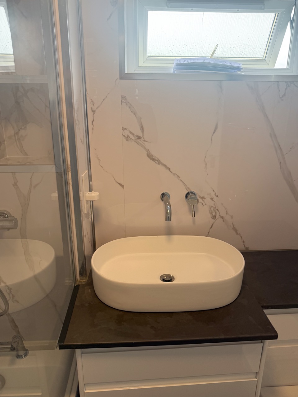 - Mounted the sink tap on the wall for a clean, modern look, with the toothbrush charger discreetly placed on the side of the new wall.