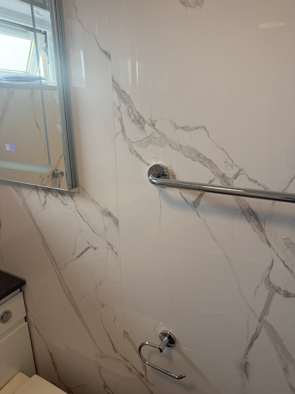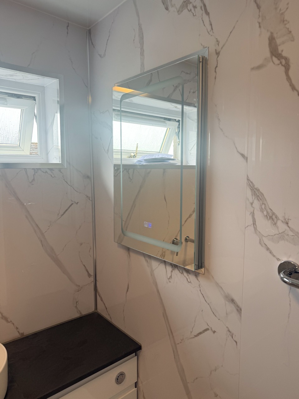 - Added a recessed LED mirror cabinet beside the toilet for extra storage.