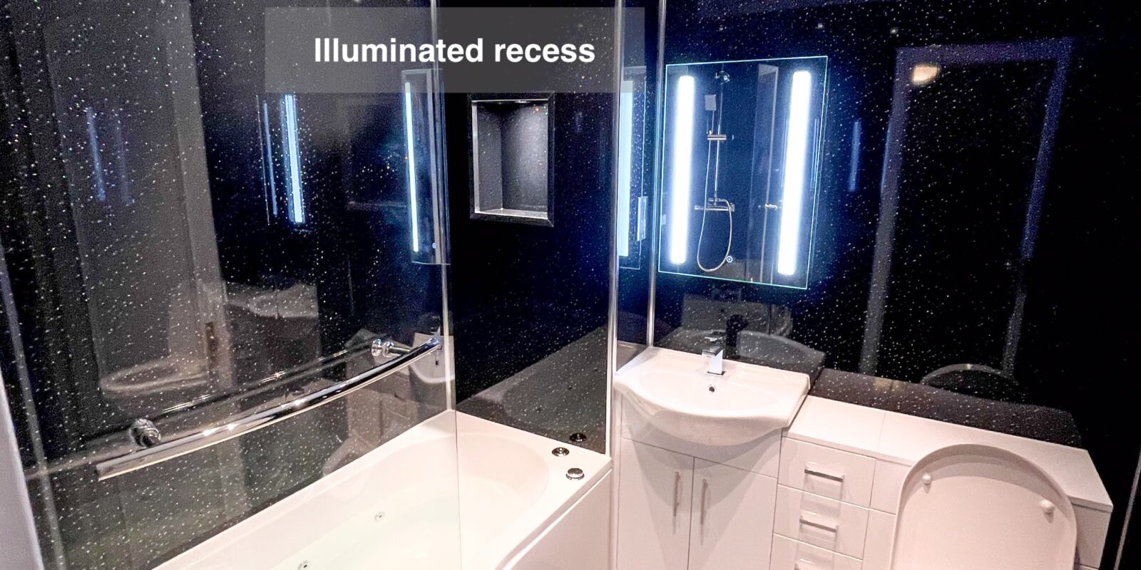 Other features included in this project are an illuminated recess inside the wall for shampoos, a towel radiator, UPVC panels all around, an inline extractor fan, shaver socket, and downlights. These details combine to create a truly luxurious and comfortable bathroom experience.