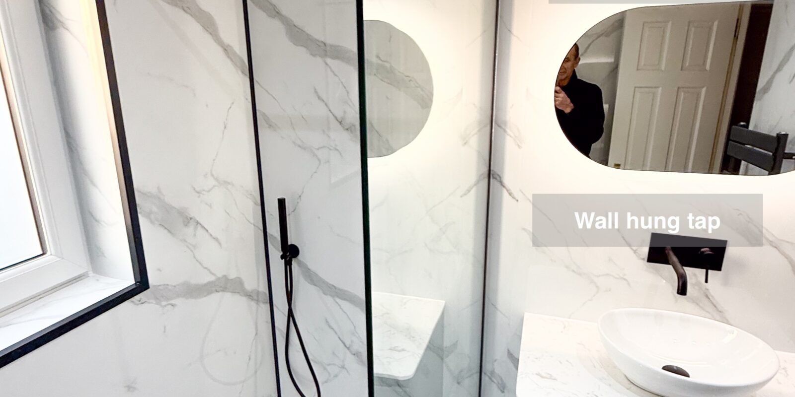 For the flooring, we used tiles, while all walls were fitted with UPVC panels in a finish that complements the floor tiles. The ceiling was also upgraded with white UPVC panels for a clean, low-maintenance finish. The vanity unit is wall-hung, featuring two drawers and a sleek wall-mounted basin tap. Above it, we installed an elegant oval LED mirror, adding both style and practical lighting. Additionally, we fitted a compact towel radiator higher up on the wall.